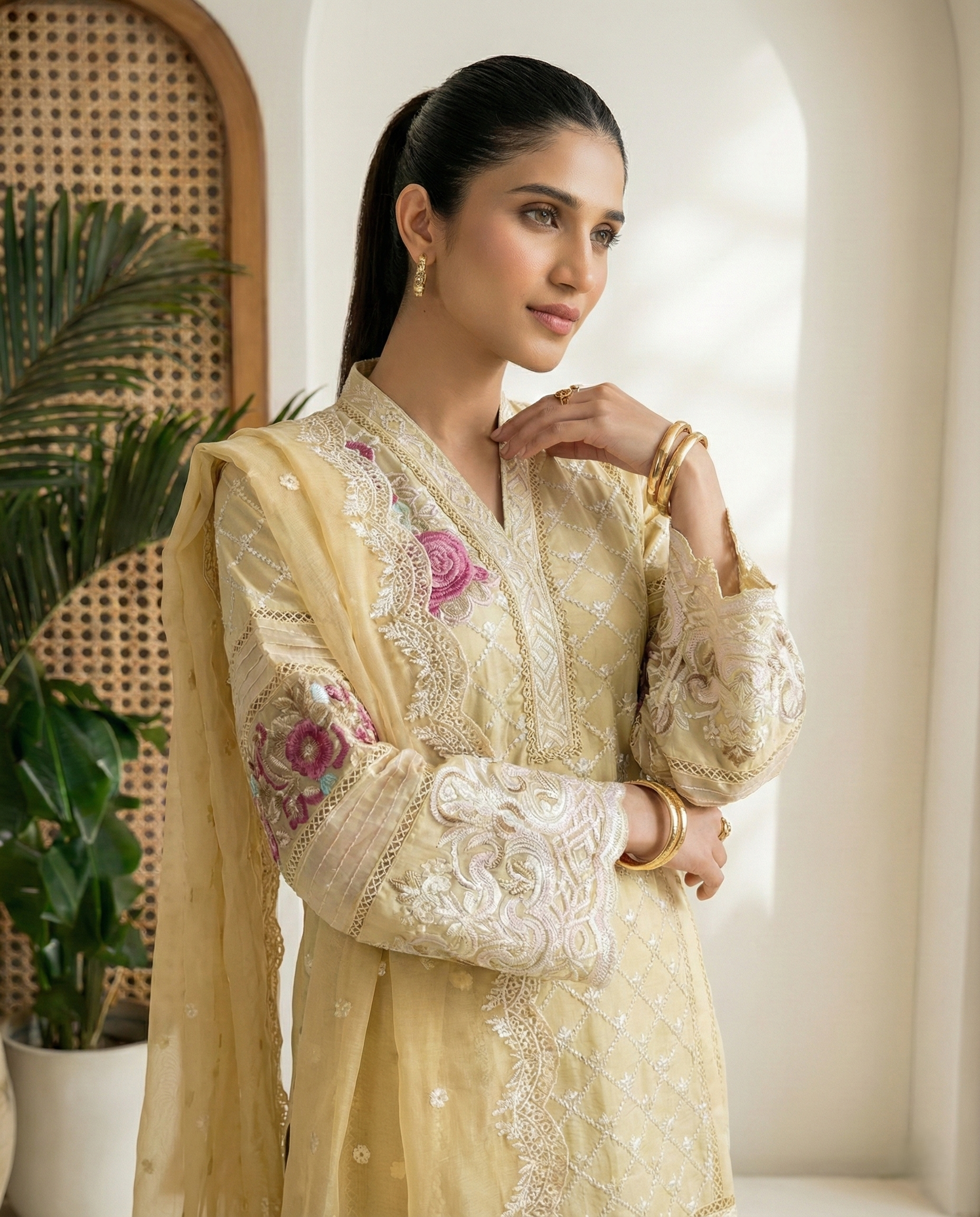 Upgrade your wardrobe with 1307 Skin By SH. This 3PC READY TO WEAR set includes a Shirt, Trouser, and Dupatta made from soft and comfortable Cotton. Get ready to look and feel your best in this stylish and versatile outfit.