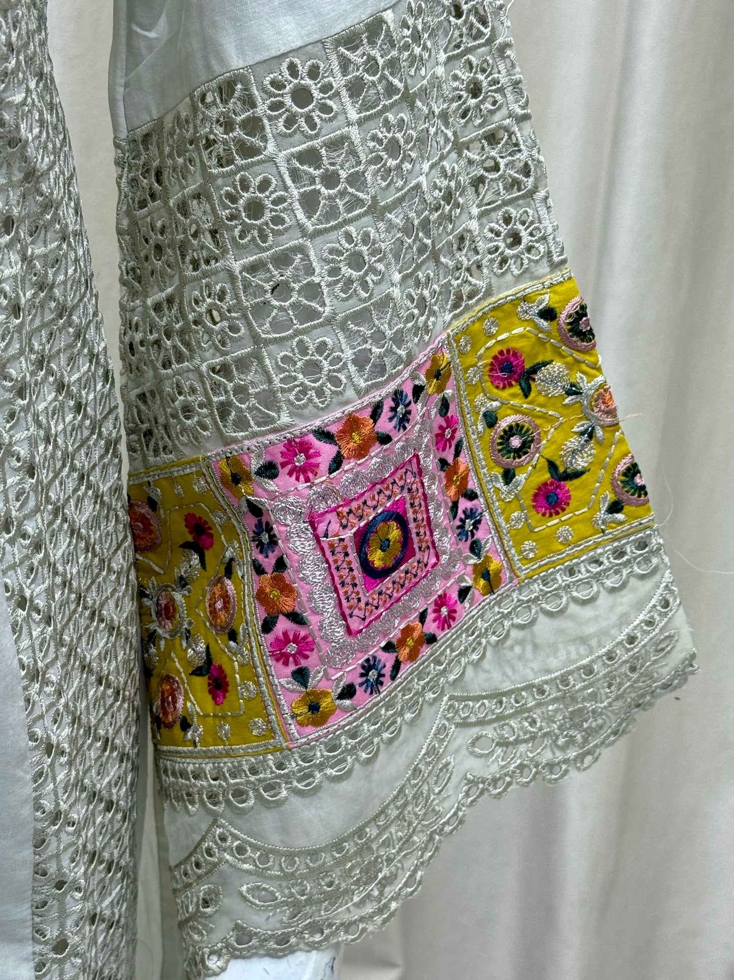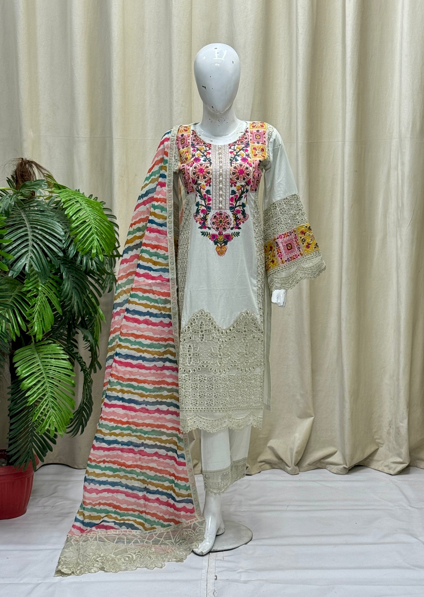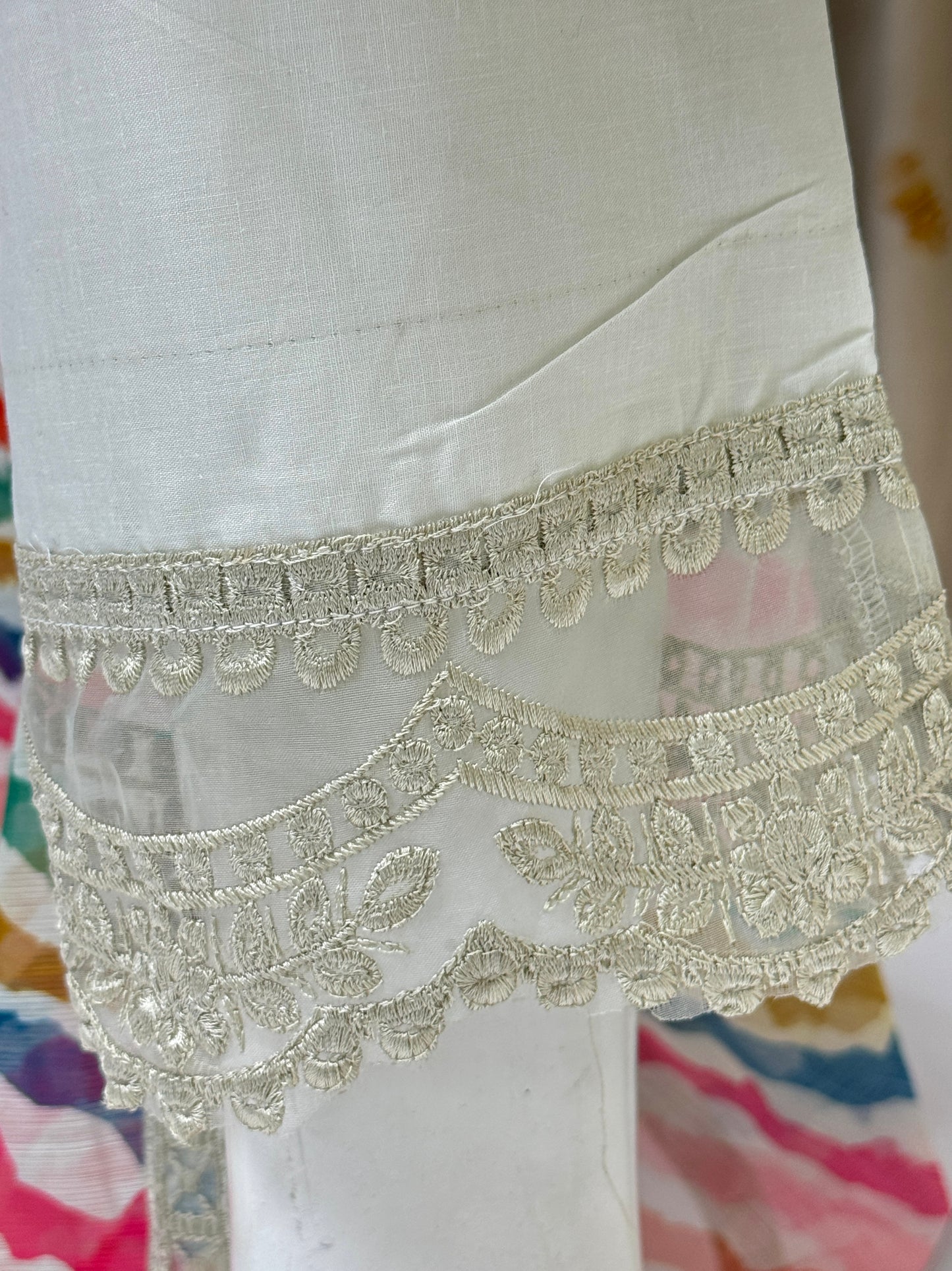 Get ready in style with the 1332 By SH Off White! This 3-piece ready-to-wear set includes a comfortable cotton shirt, matching trousers, and a beautiful Khaadi net digital printed dupatta. Perfect for any occasion, this set will elevate your fashion game effortlessly.