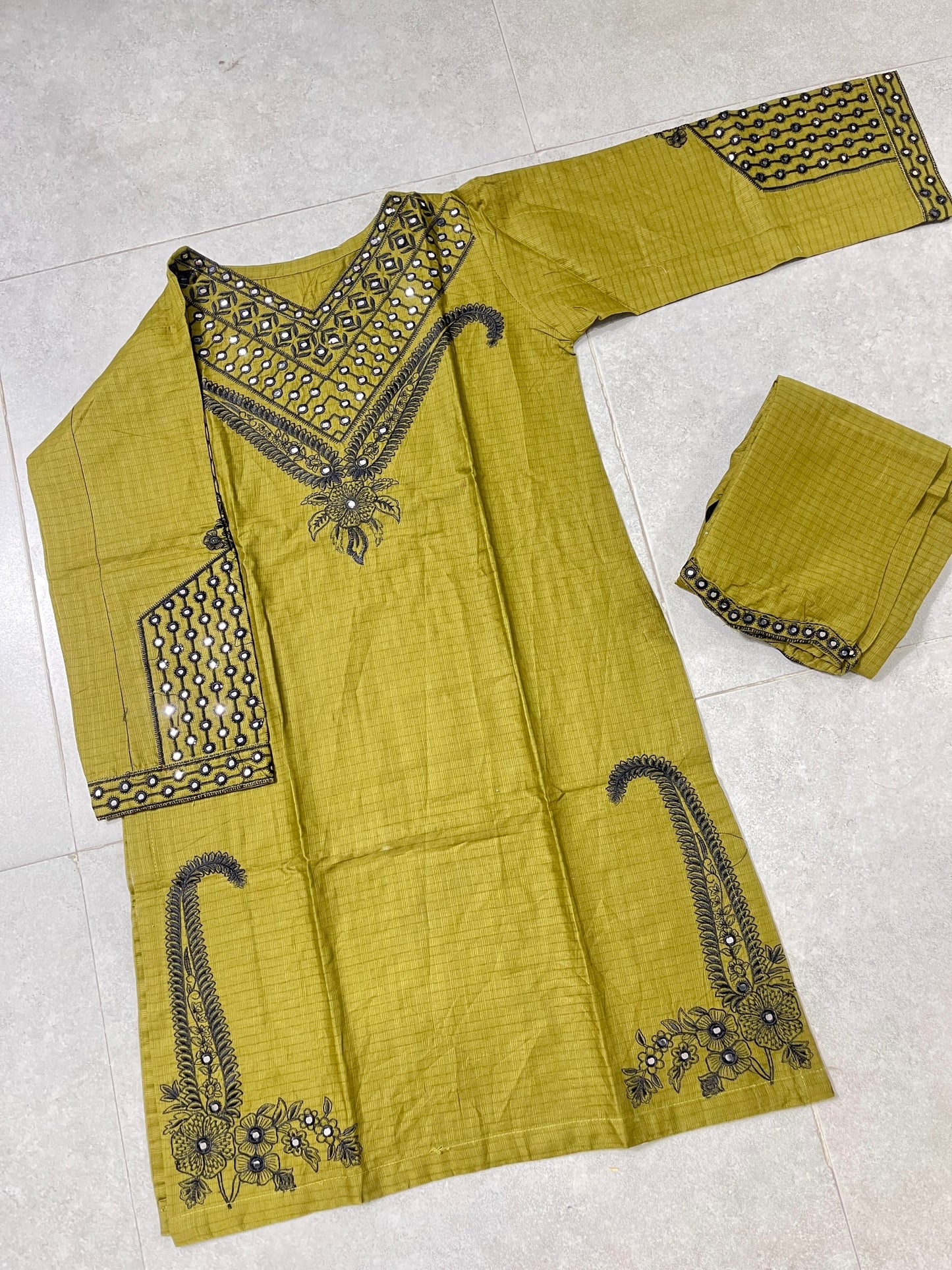 This 2PC 95 Mehndi set is ready to wear, perfect for any occasion. Made with Cortried Cotton for the shirt and soft, comfortable cotton for the trousers, you'll look and feel great. Get both pieces in one convenient set!