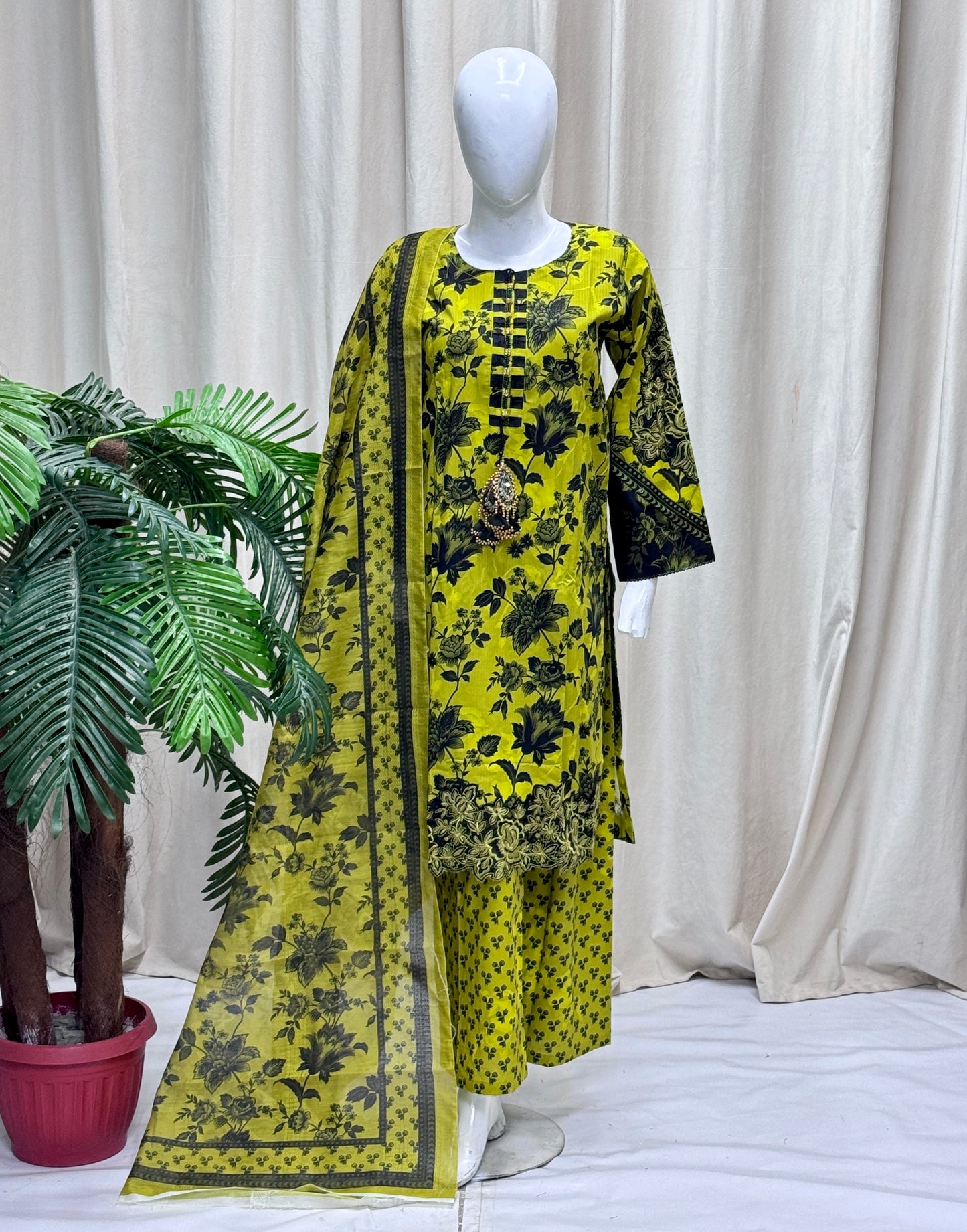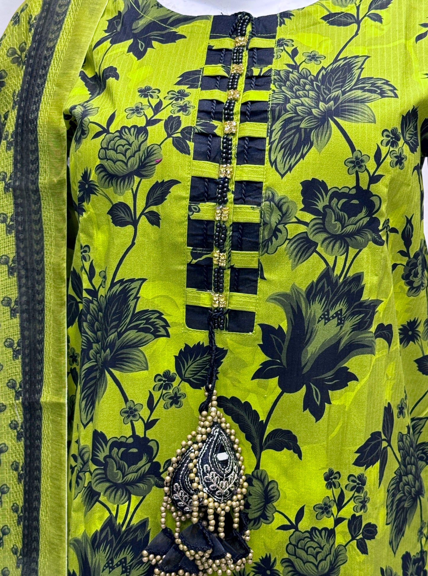 This 3-piece set includes a ready-to-wear shirt and trousers made of soft Doria Cotton, along with a Khaddar dupatta. winter collection Expertly crafted for a comfortable and stylish fit, this set is ideal for any occasion. Elevate your wardrobe with this versatile and high-quality 3PC 502 Black set.