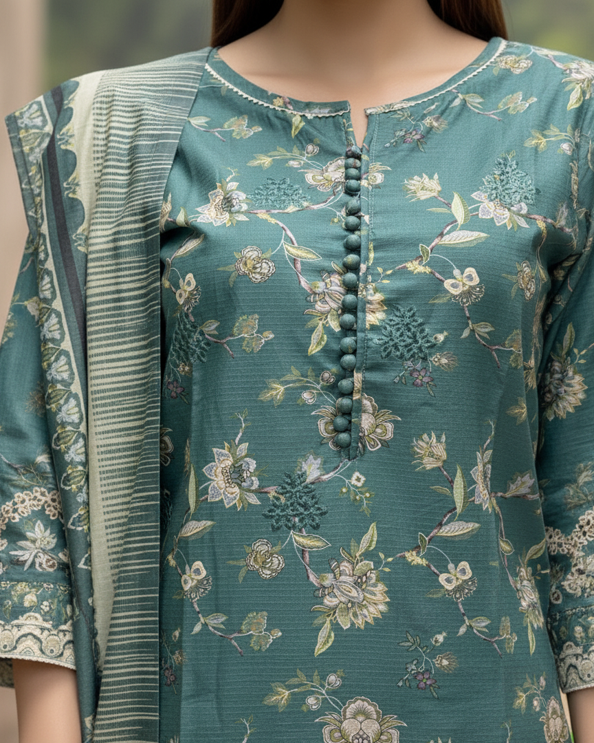 Expertly crafted with high-quality Khaddar fabric, this 3PC READY TO WEAR ensemble in a serene shade of 524 Green is perfect for any occasion. The shirt, trouser, and soft Khaddar dupatta combine to create a comfortable and stylish outfit that is ready to wear, saving you time and effort.