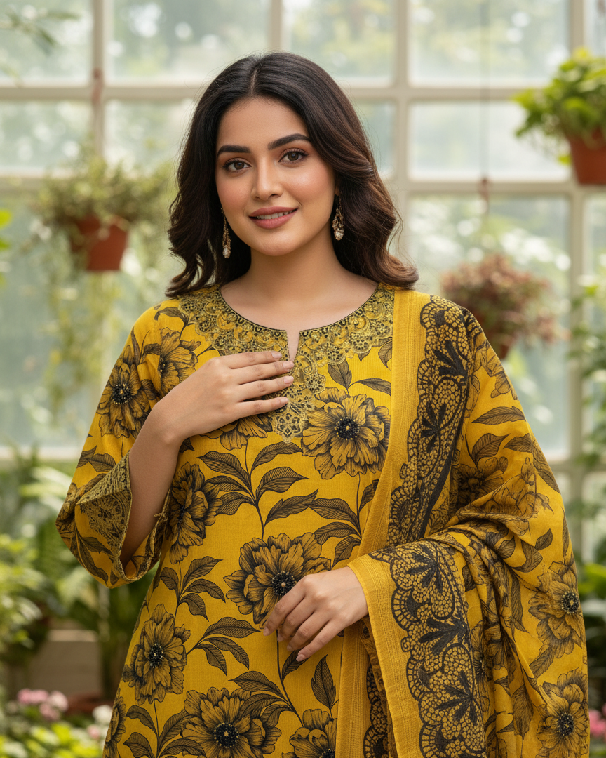 This 3PC set includes a ready-to-wear shirt, trouser, and dupatta, all made of soft khaddar fabric. Perfect for any occasion, these pieces provide comfort and style with their khaddar material. Elevate your wardrobe with this versatile and fashionable set.