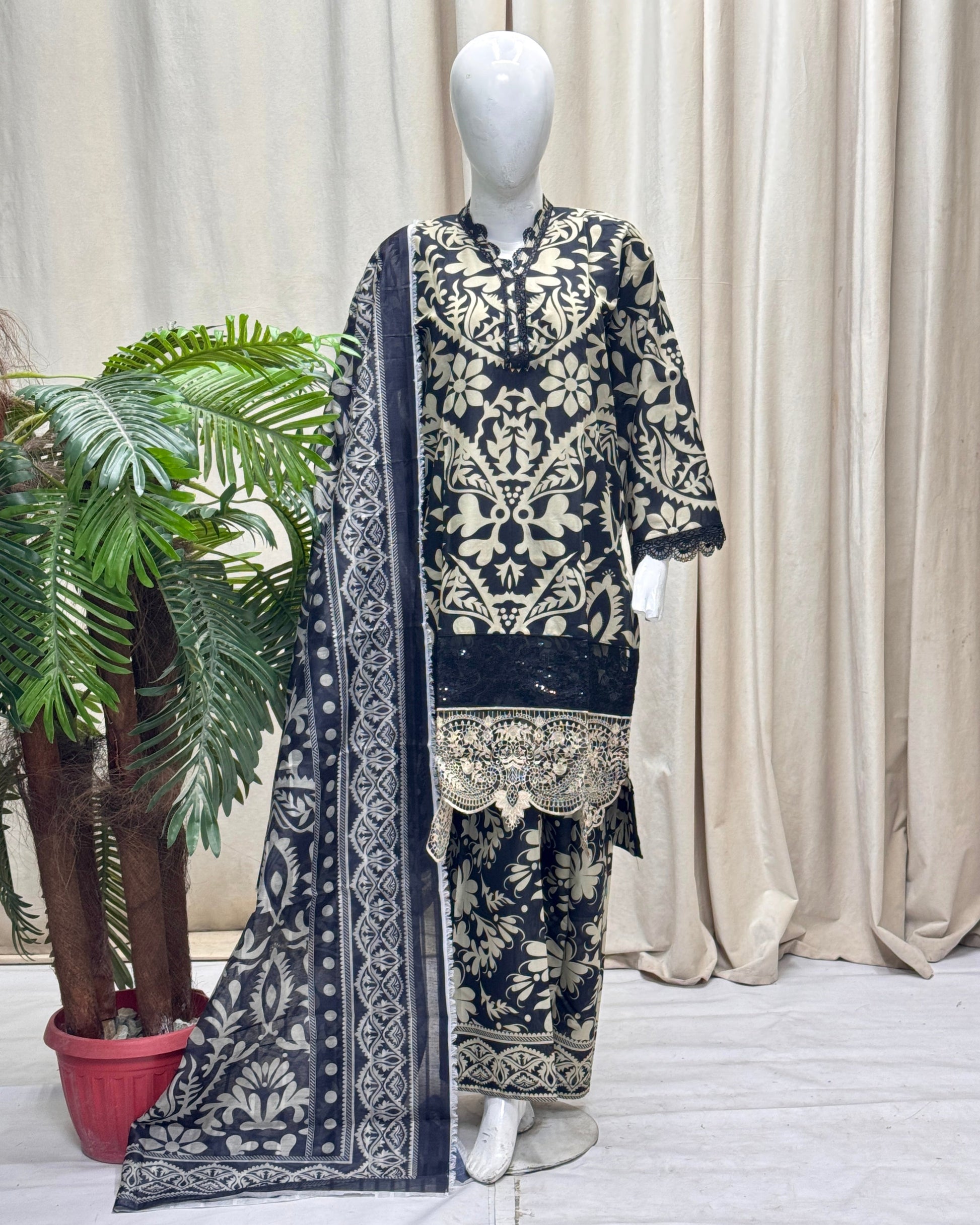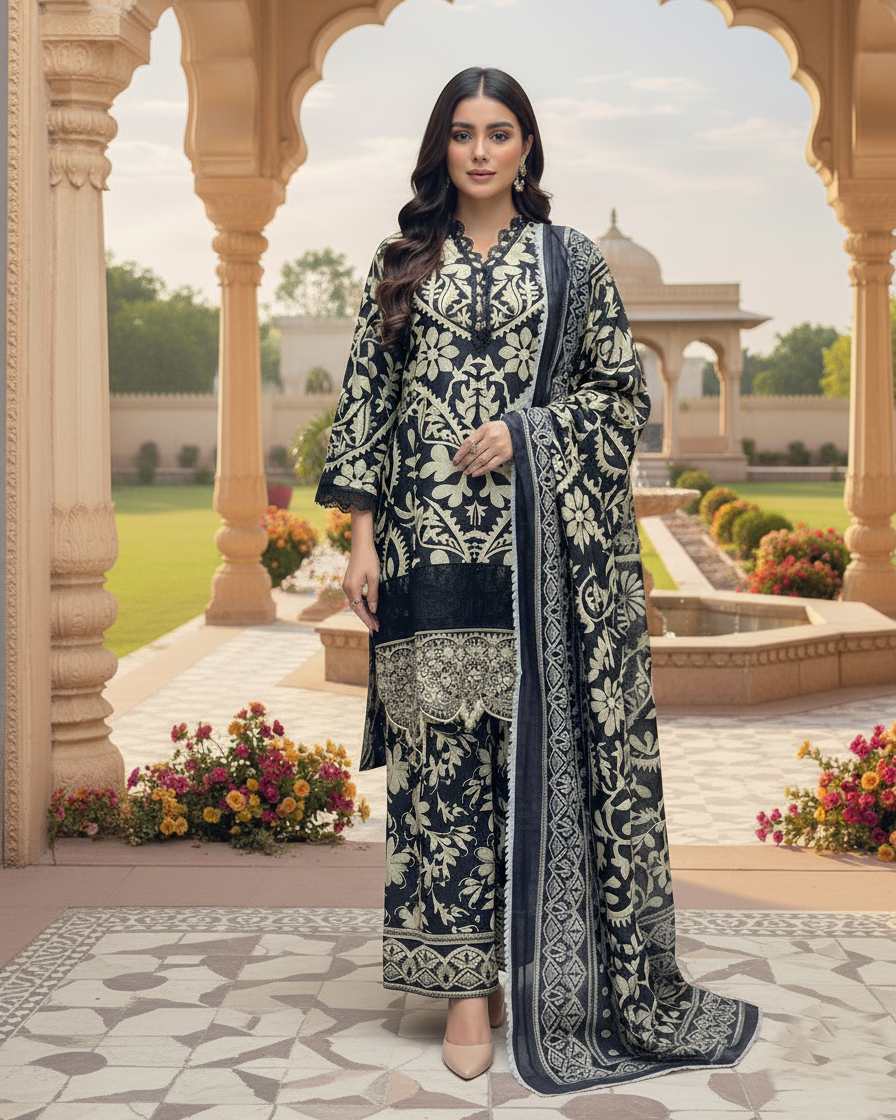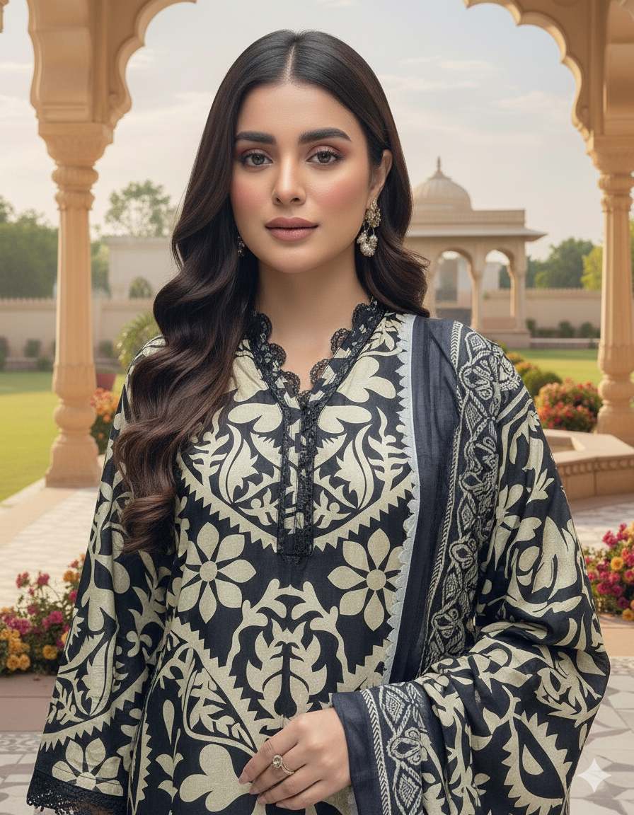 Discover the perfect look. Its intriguing details make it a must-have for any wardrobe. Designed for comfort and style, you'll feel confident and fashionable every time you wear it. Upgrade your look today with this outfit. This 3PC set blends elegance and ease — featuring a breezy Doria cotton shirt, flared cotton trousers, and a statement diamond-fabric dupatta for a graceful finish ideal for day or evening wear.