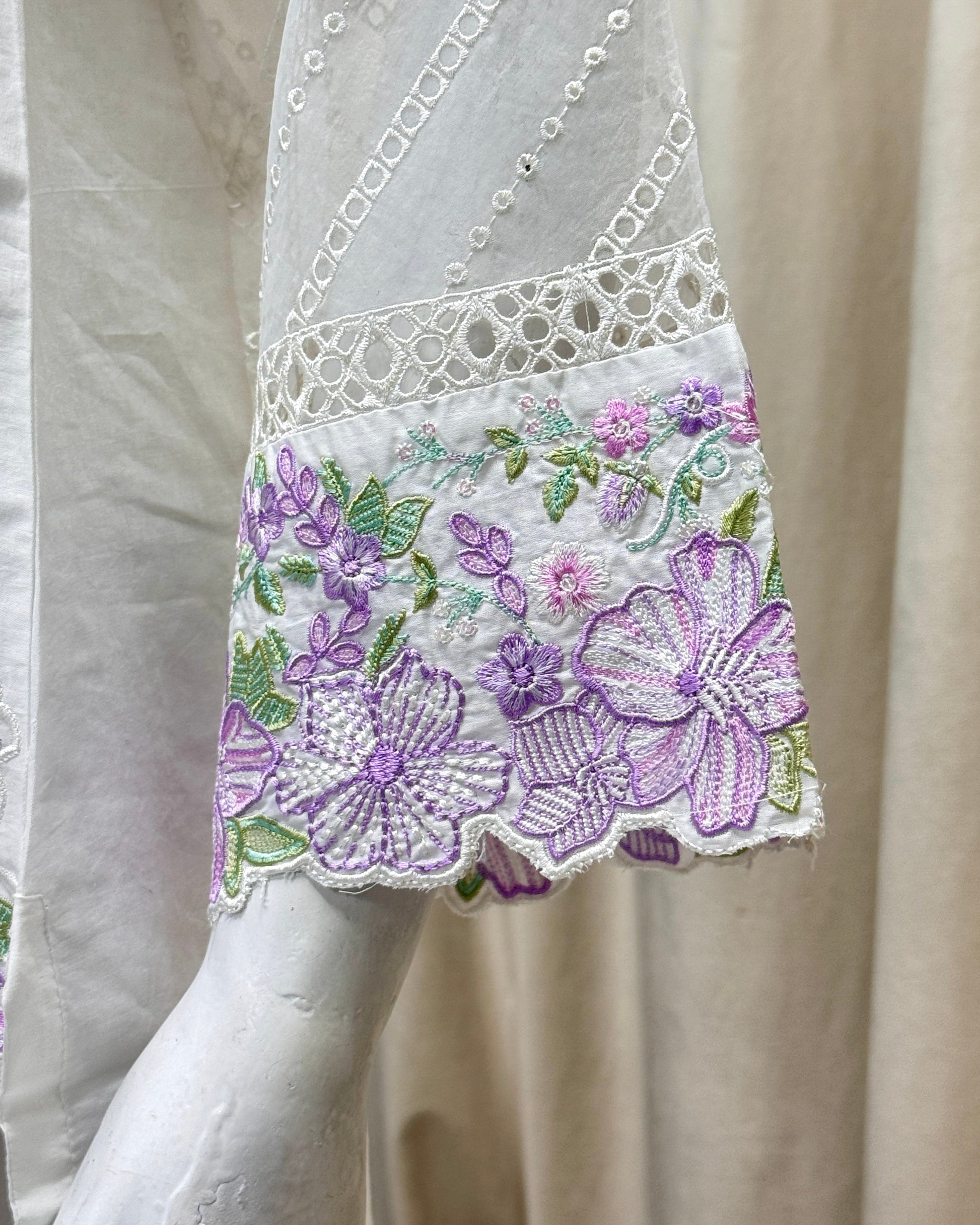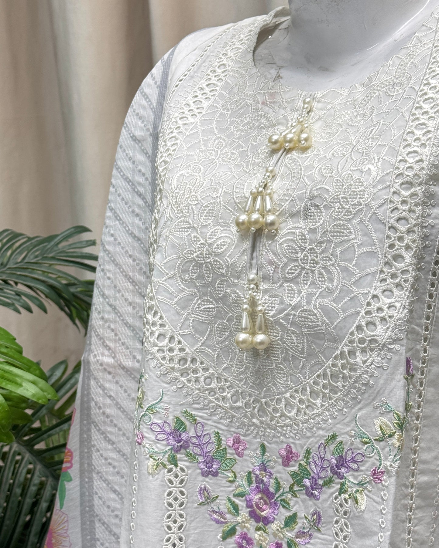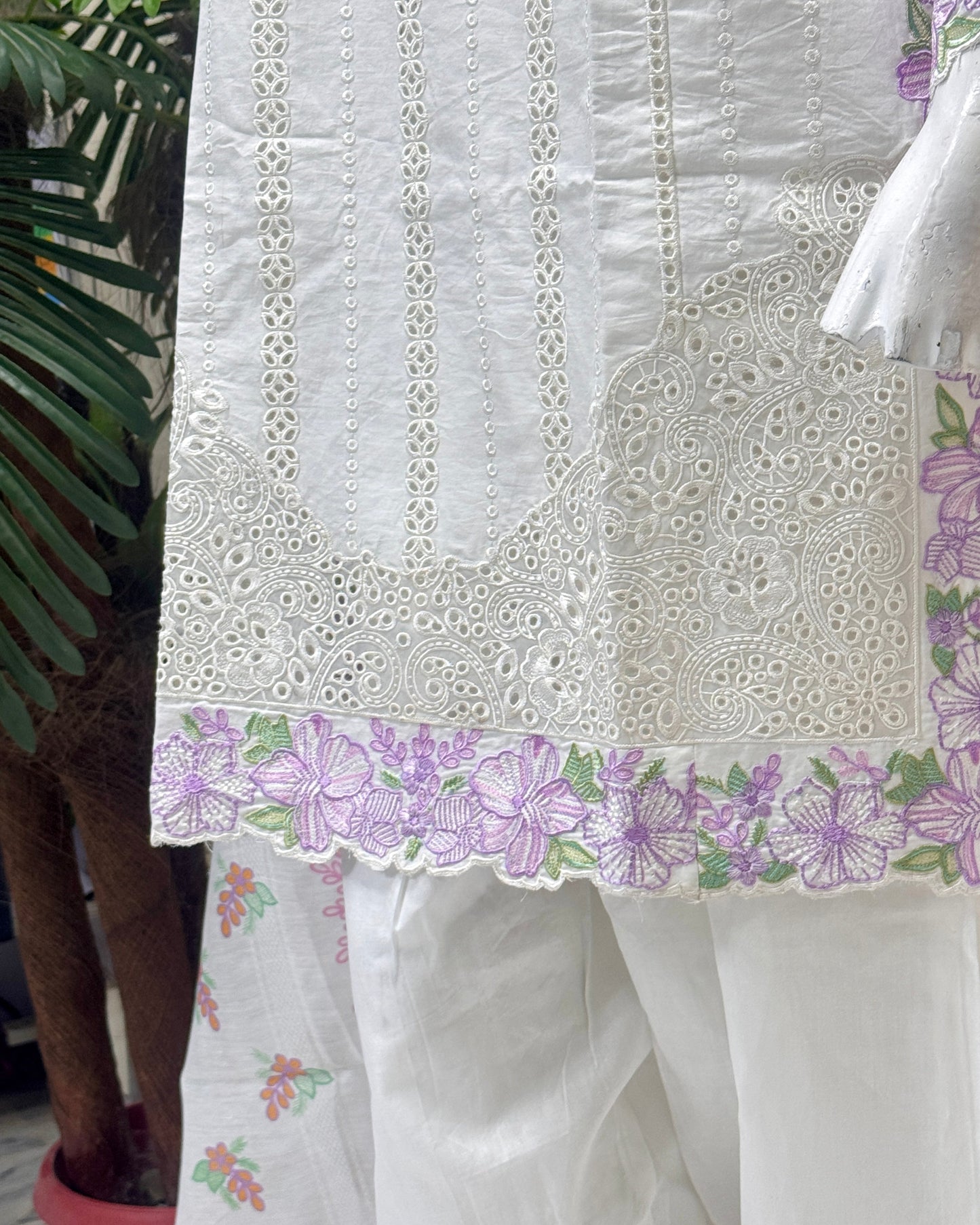 Discover the perfect look. Its intriguing details make it a must-have for any wardrobe. Designed for comfort and style, you'll feel confident and fashionable every time you wear it. Upgrade your look today with this outfit. This 3PC ensemble blends tradition with elegance — featuring a short embroidered and embellished cotton shirt paired with a luxurious diamond dupatta and a classic farshi shalwar for a timeless appeal.