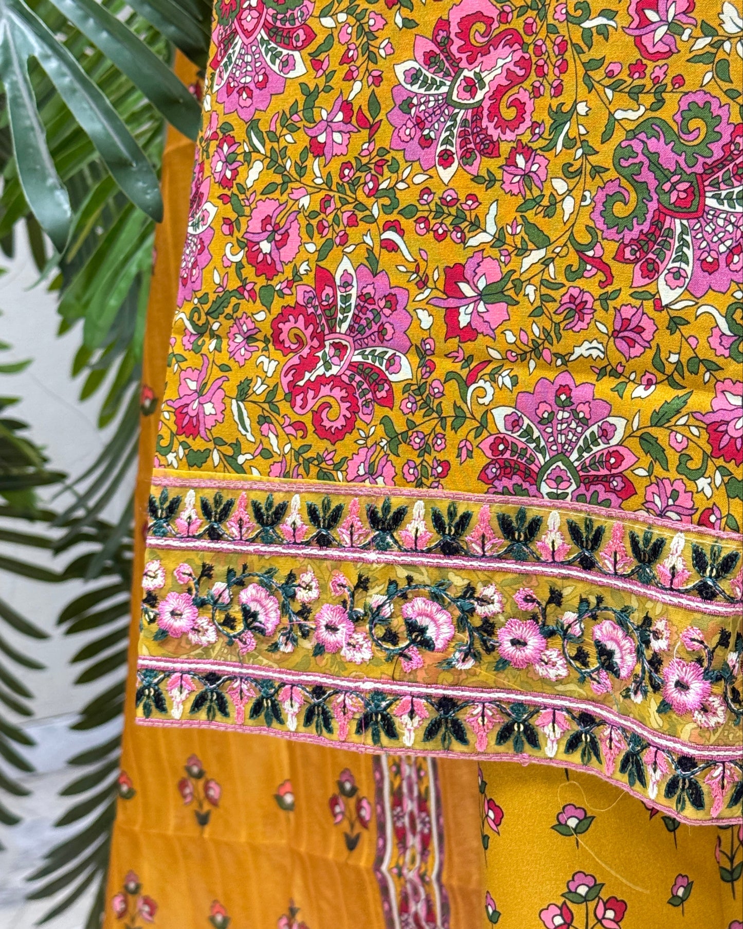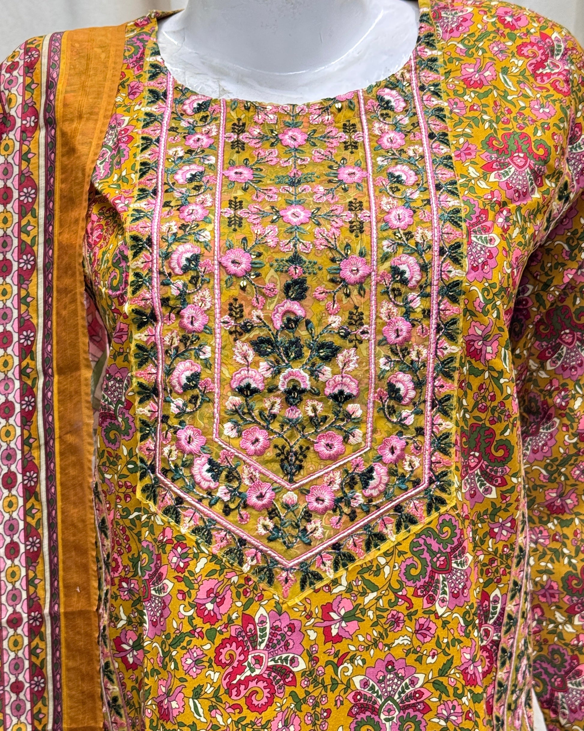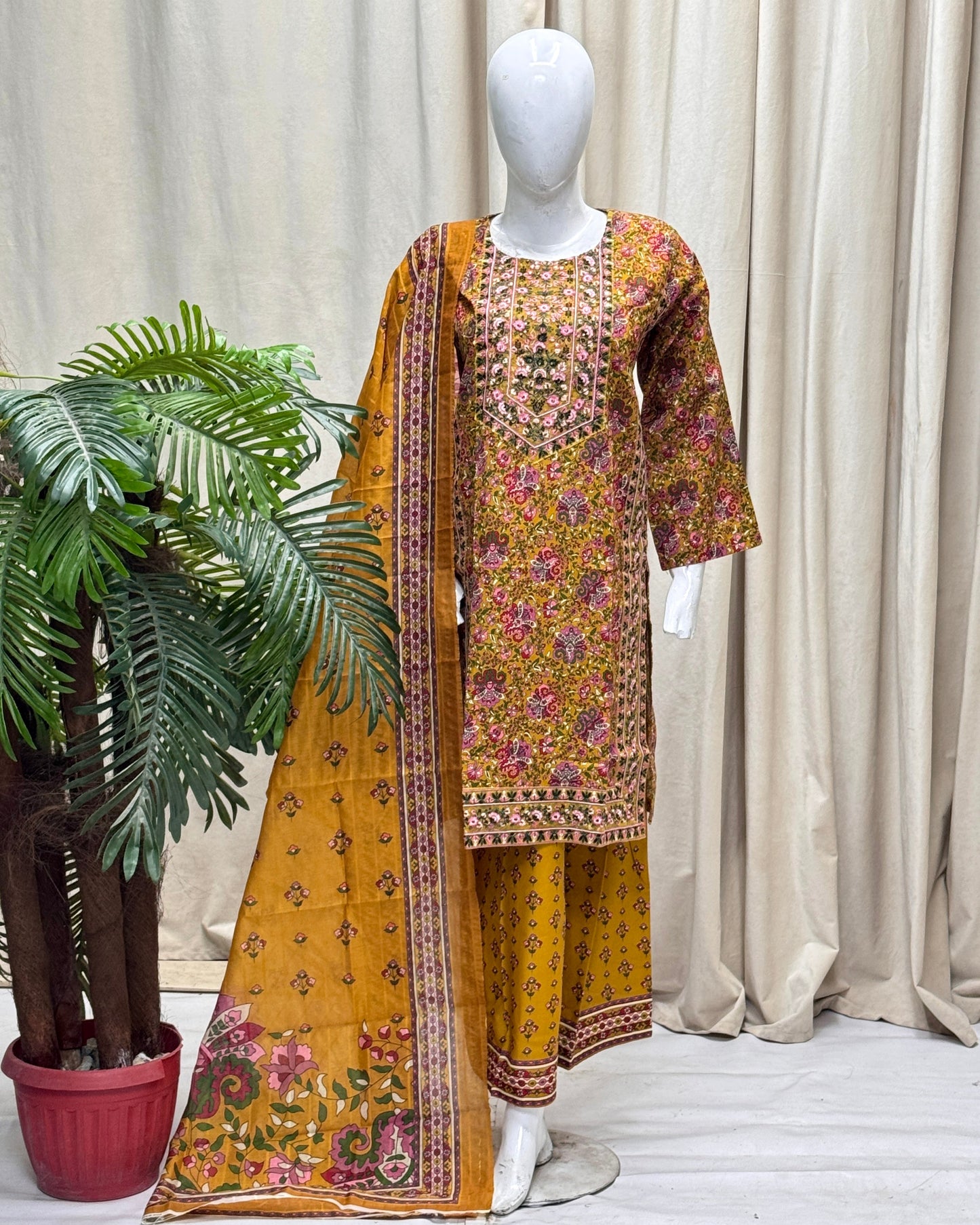 Discover the perfect look. Its intriguing details make it a must-have for any wardrobe. Designed for comfort and style, you'll feel confident and fashionable every time you wear it. Upgrade your look today with this outfit. This 3PC ready-to-wear outfit features a long Doria cotton shirt that offers a breezy yet refined look, matched with a soft cotton trouser for everyday elegance. The look is completed with a stunning diamond dupatta, adding a graceful touch for both casual and semi-formal wear.