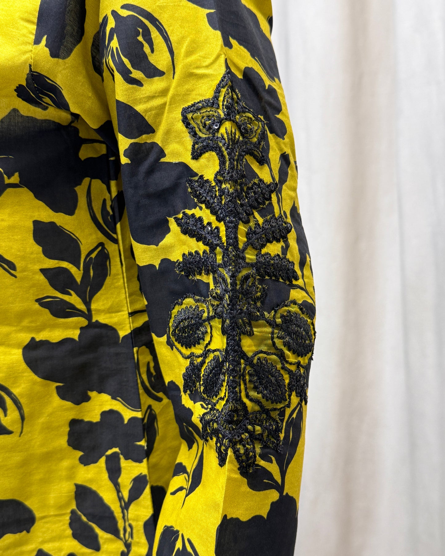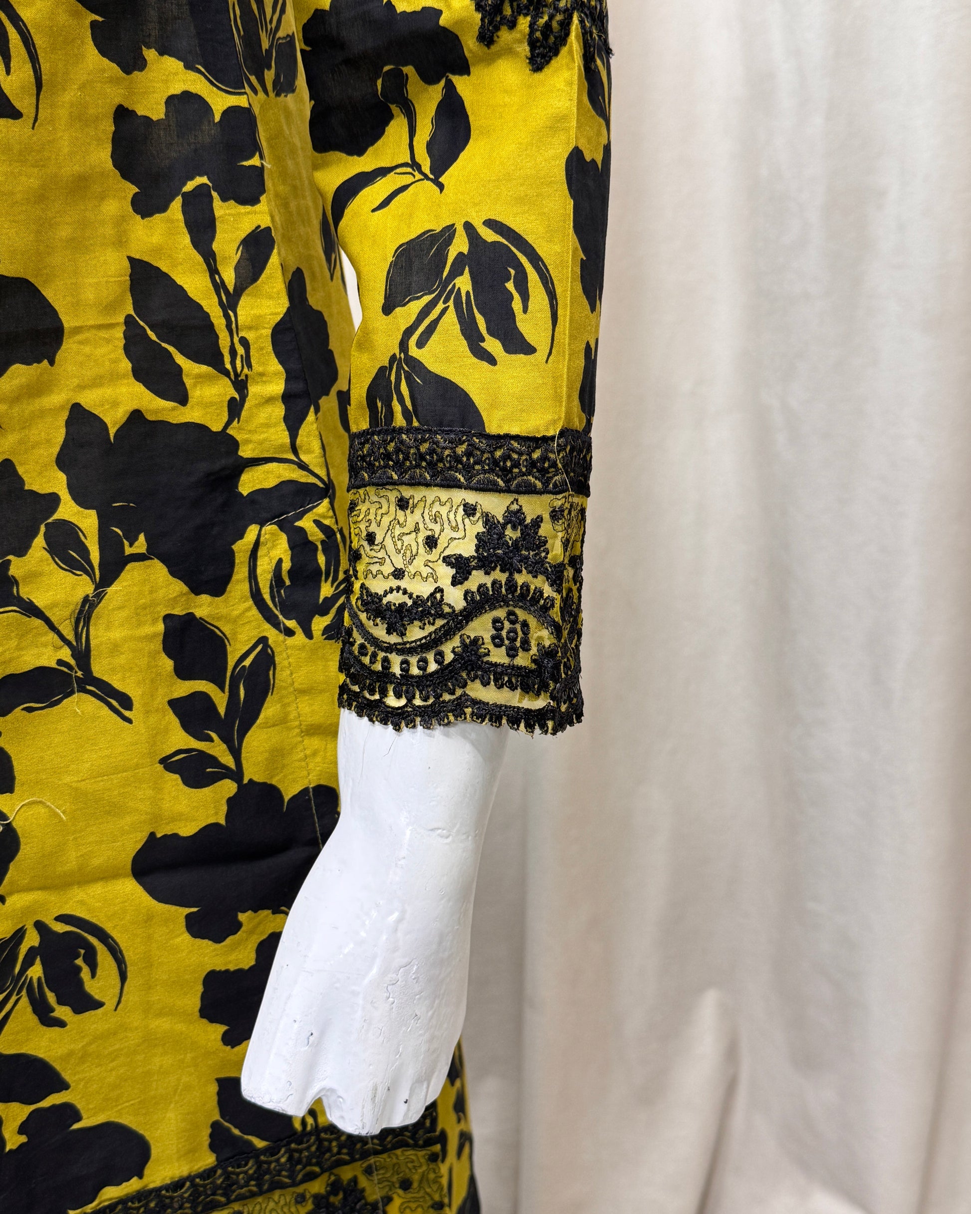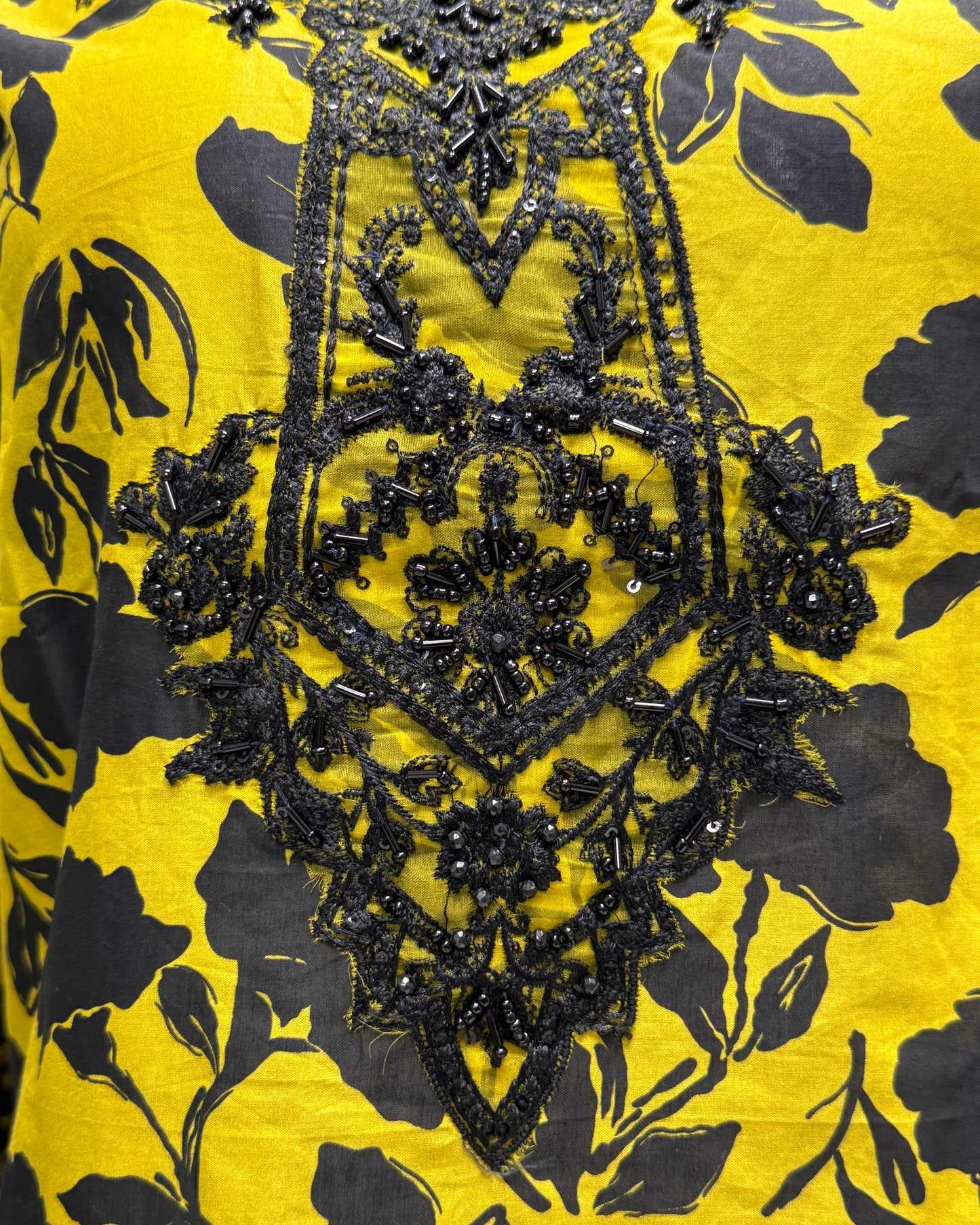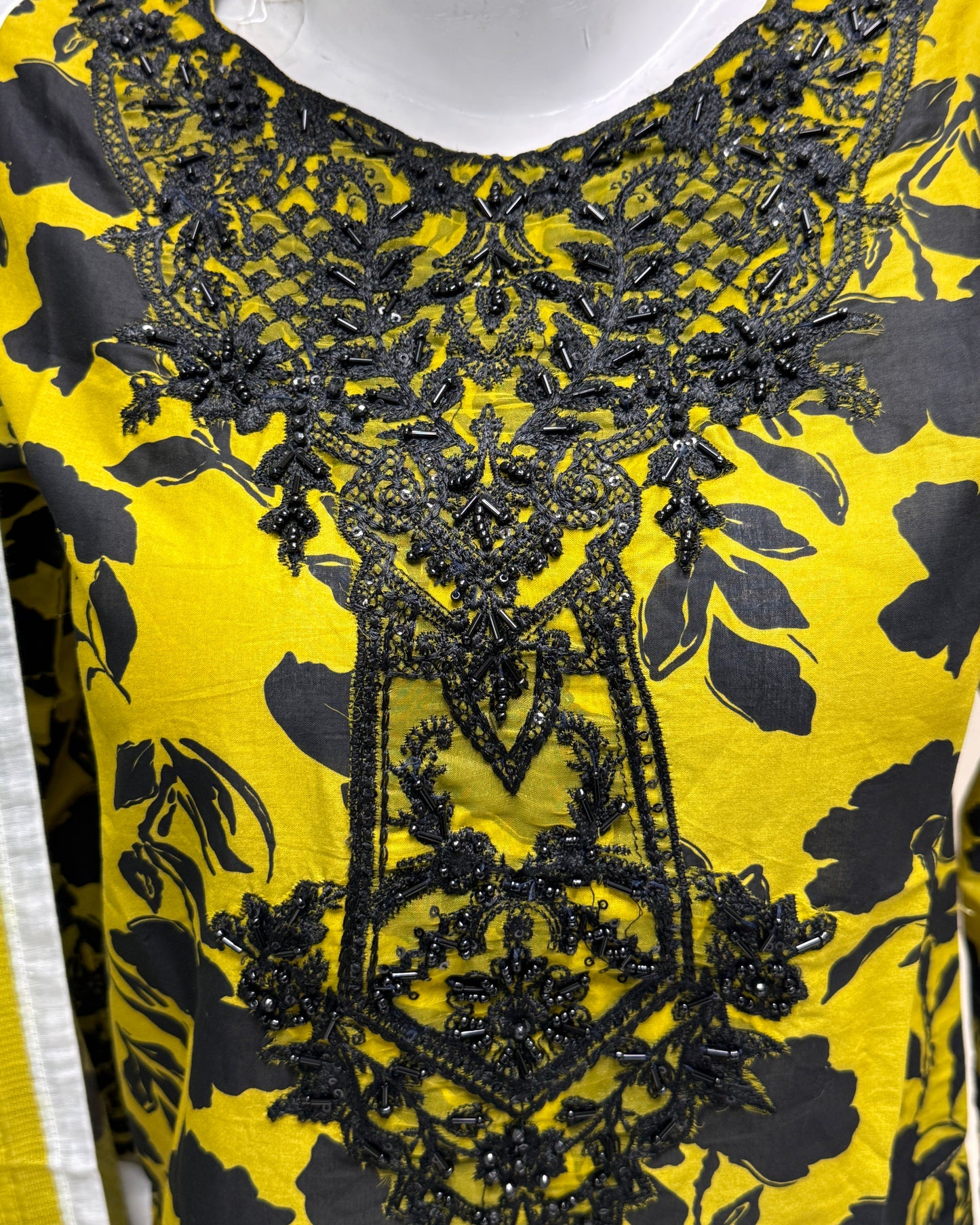 Discover the perfect look. Its intriguing details make it a must-have for any wardrobe. Designed for comfort and style, you'll feel confident and fashionable every time you wear it. Upgrade your look today with this outfit. This 3PC ensemble blends tradition with elegance — featuring a short embroidered and embellished cotton shirt paired with a luxurious diamond dupatta and a classic farshi shalwar for a timeless appeal.