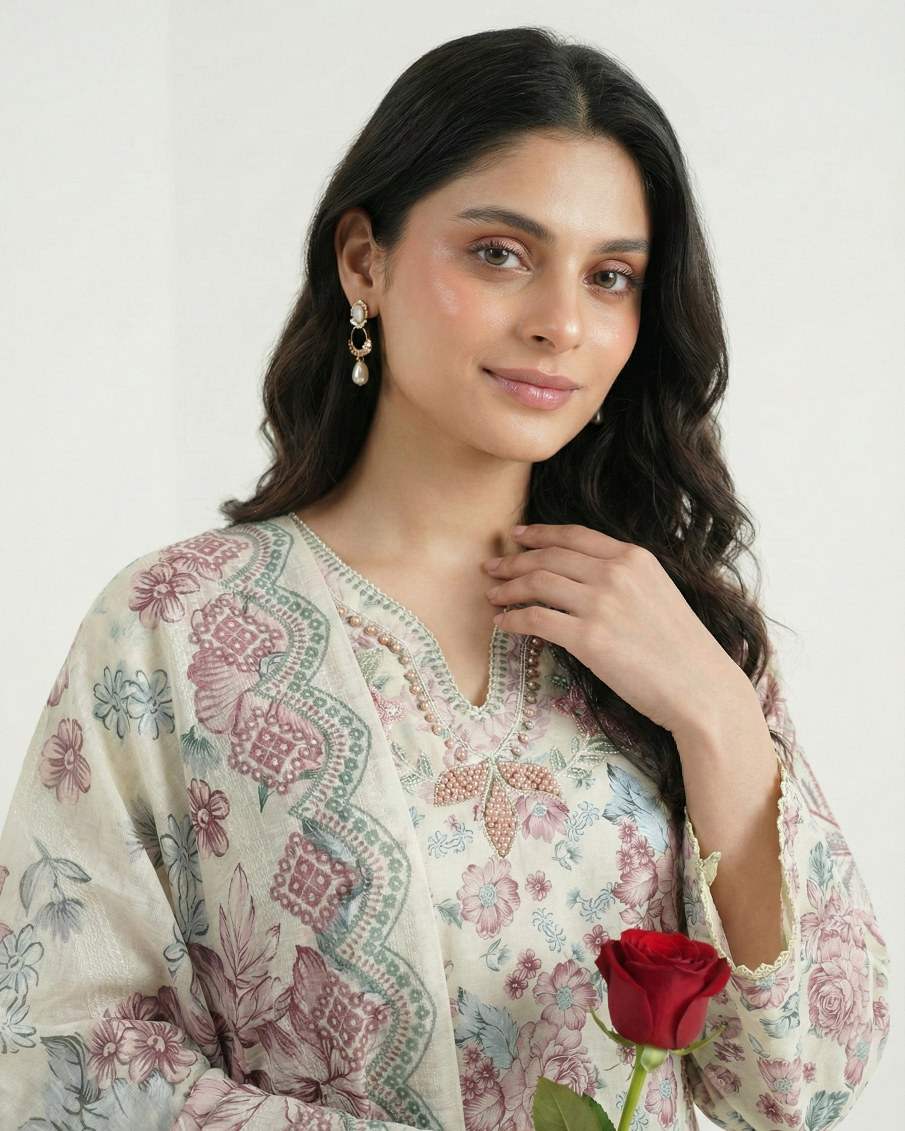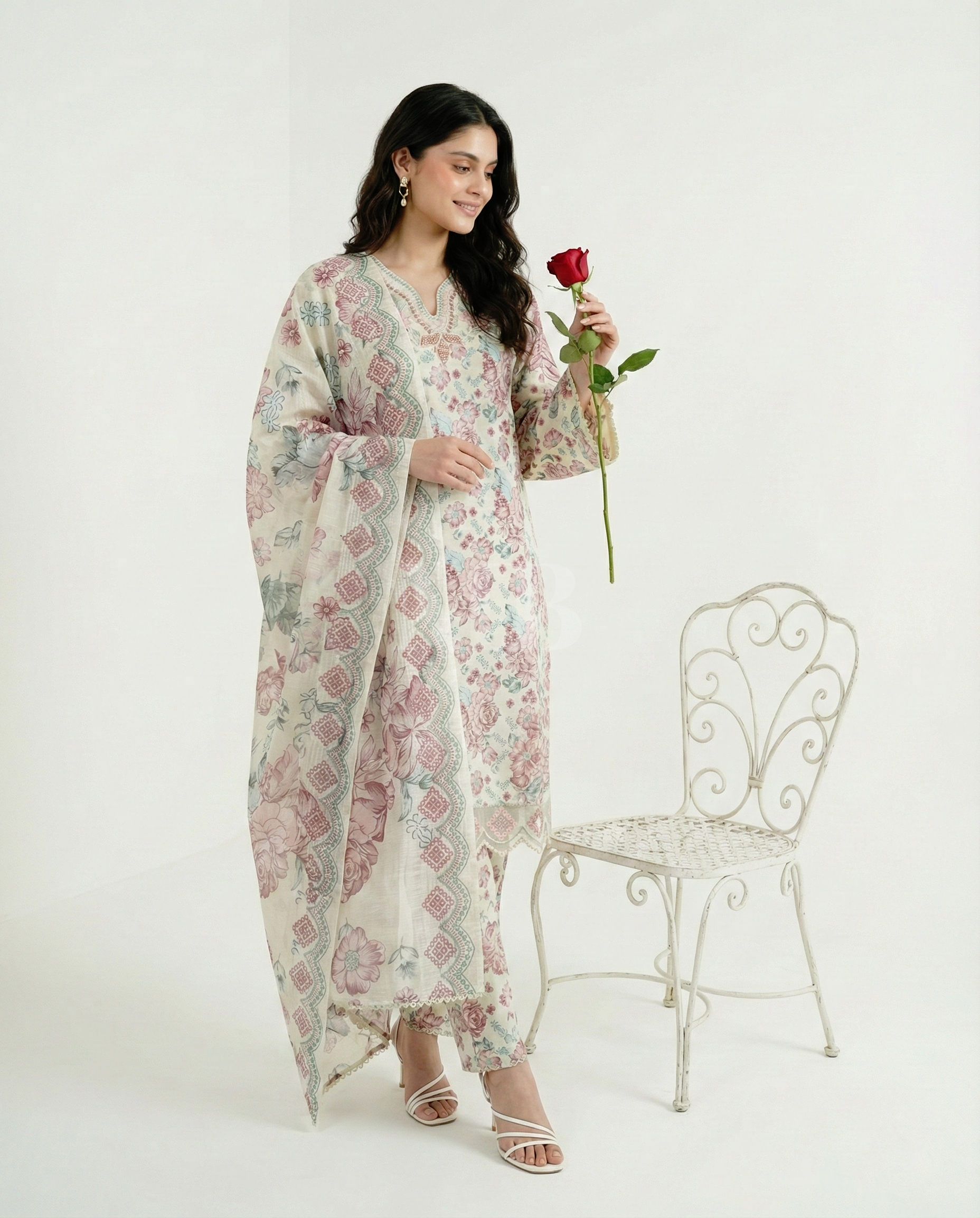 A fresh everyday essential designed with comfort and effortless charm in mind. Lightweight textures and a subtle statement dupatta make this ensemble perfect for warm days and graceful casual wear.