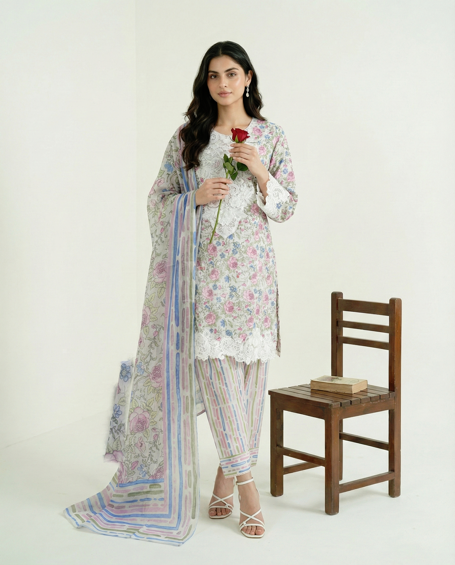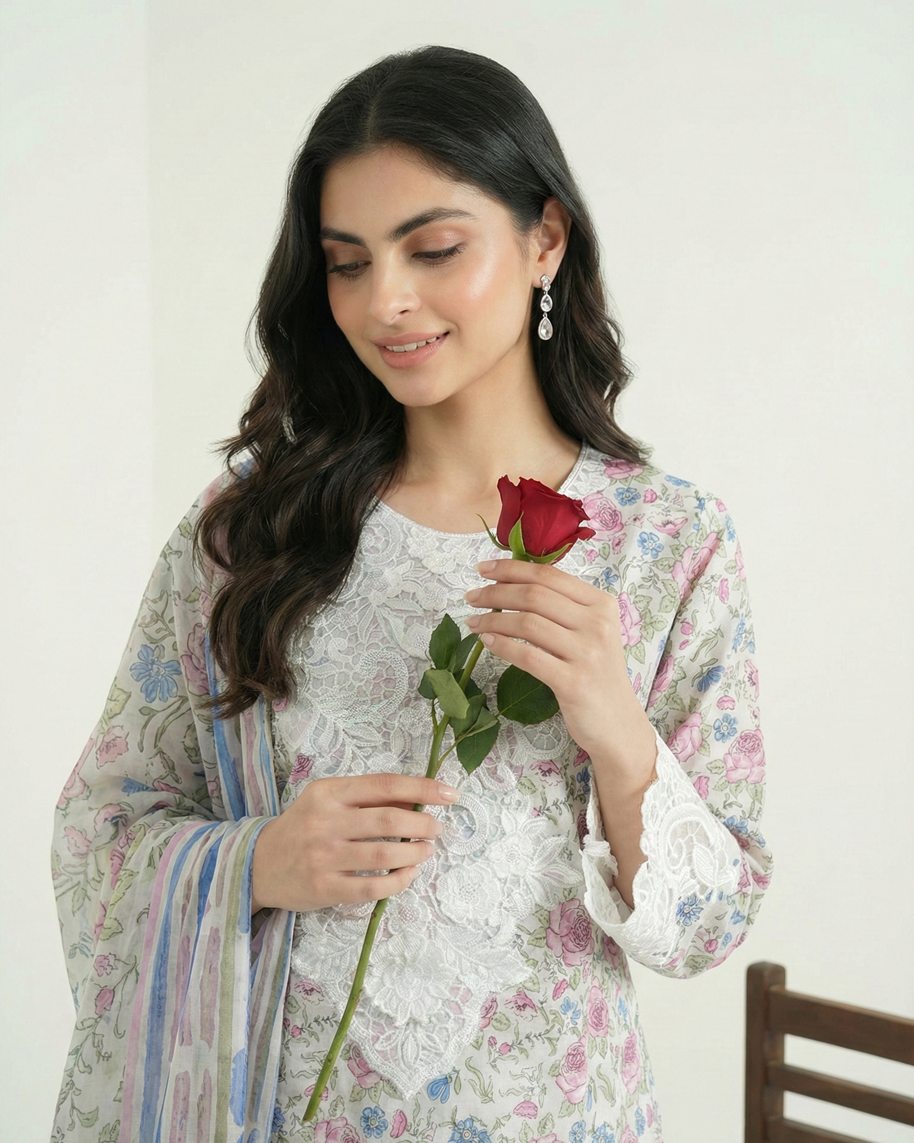 A fresh everyday essential designed with comfort and effortless charm in mind. Lightweight textures and a subtle statement dupatta make this ensemble perfect for warm days and graceful casual wear.