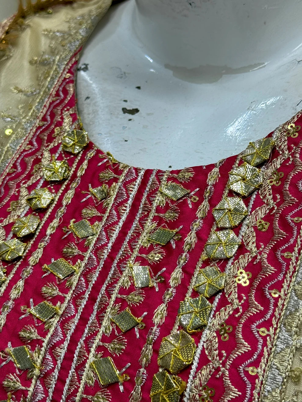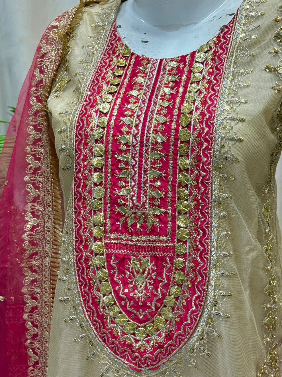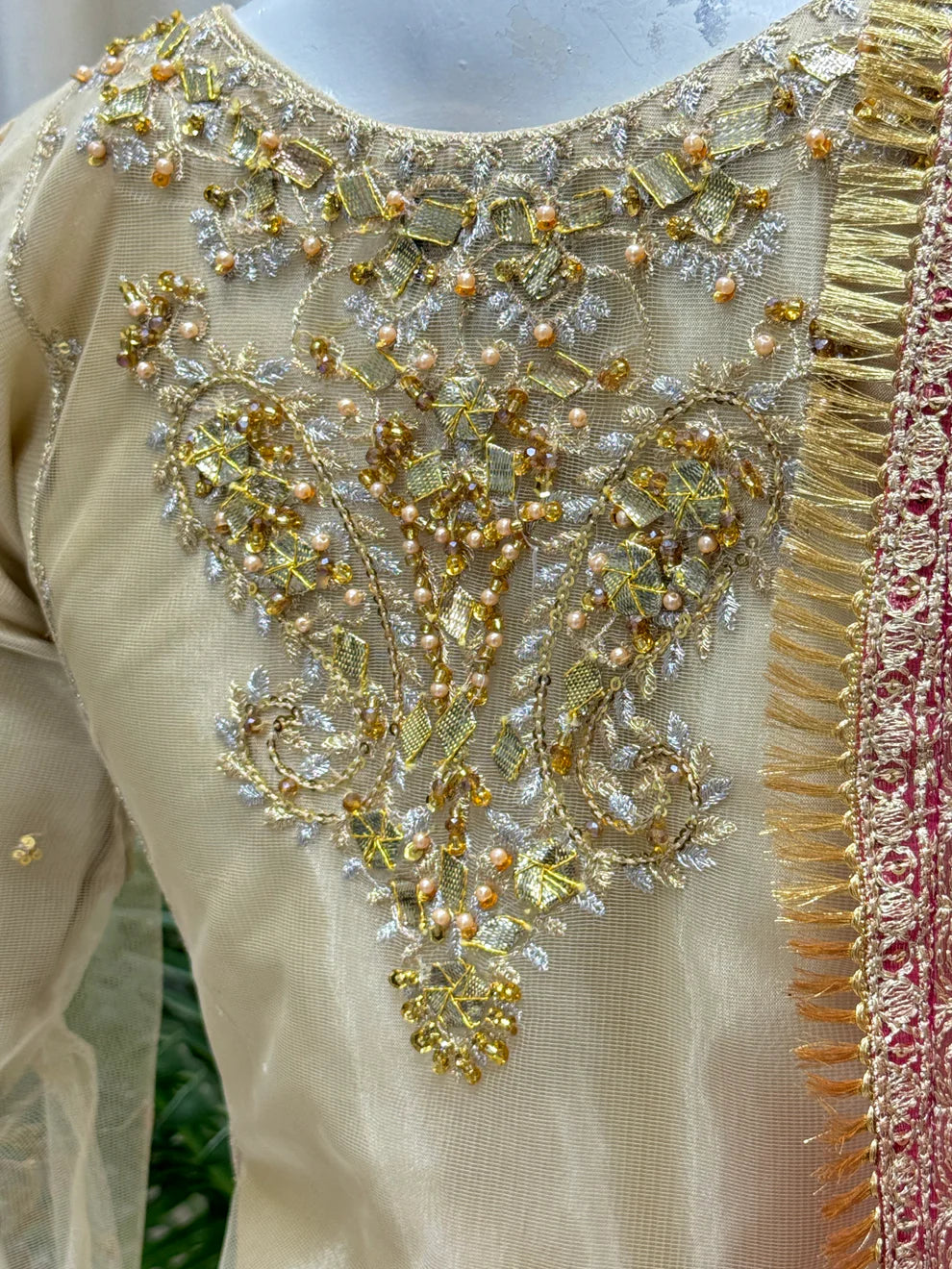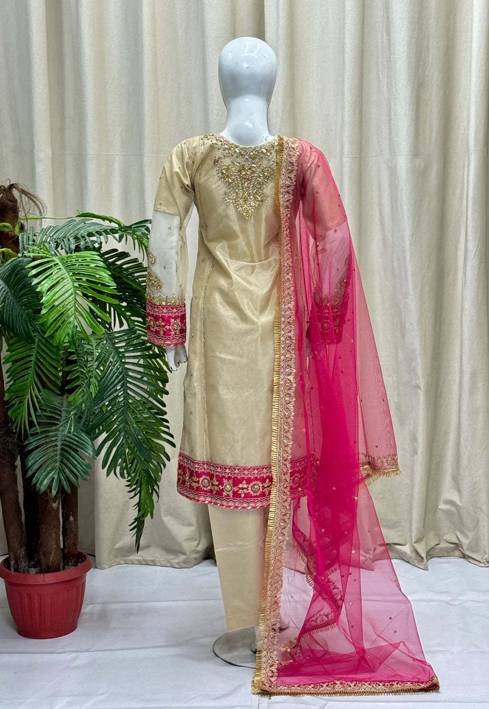 This 3-piece ready-to-wear set includes a Net shirt fabric with raw silk inner, raw silk trouser, and Net Dupatta. Adorned with delicate sequence embroidery, tila thread, and goti adda work, this outfit exudes sophistication. Perfect for any occasion, elevate your style with SH.