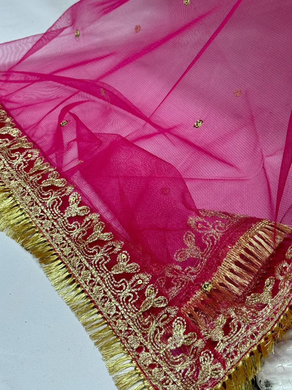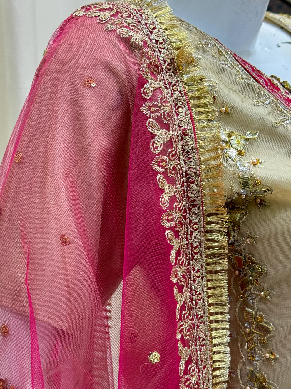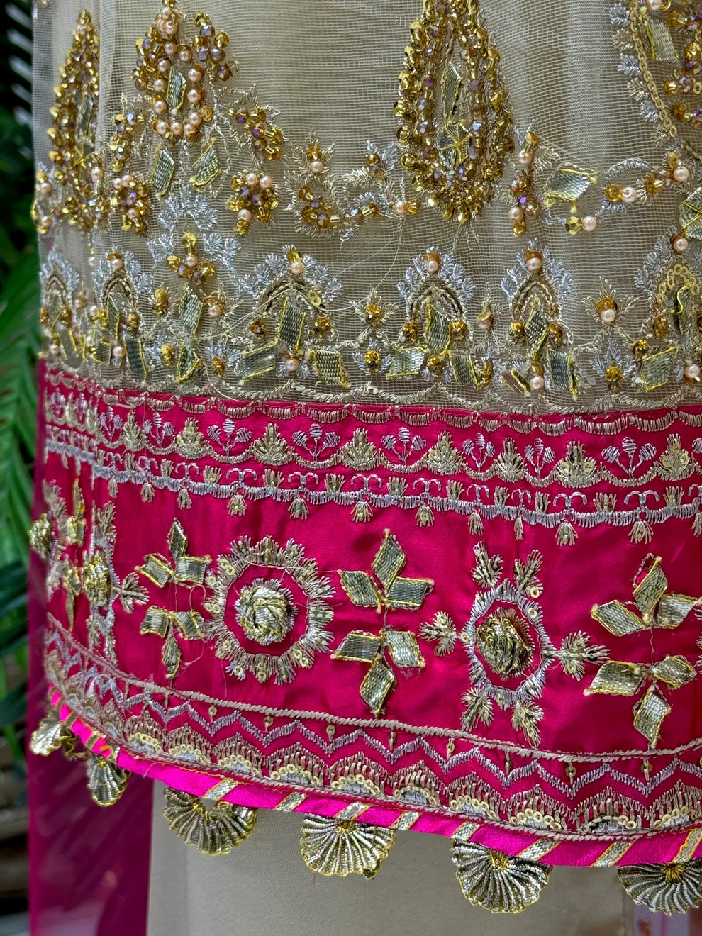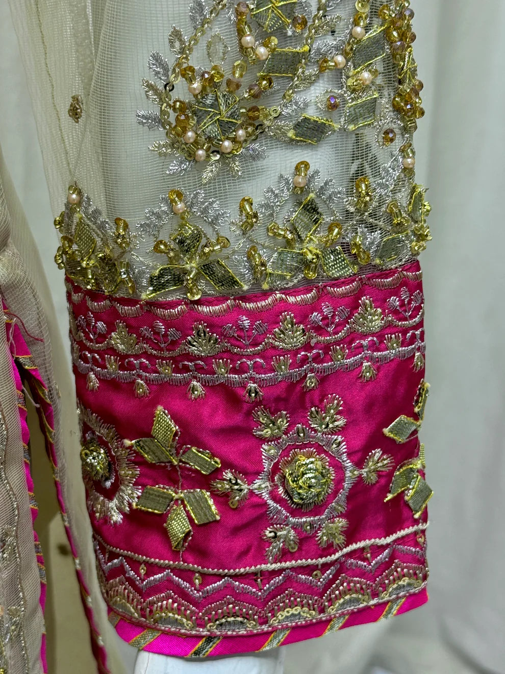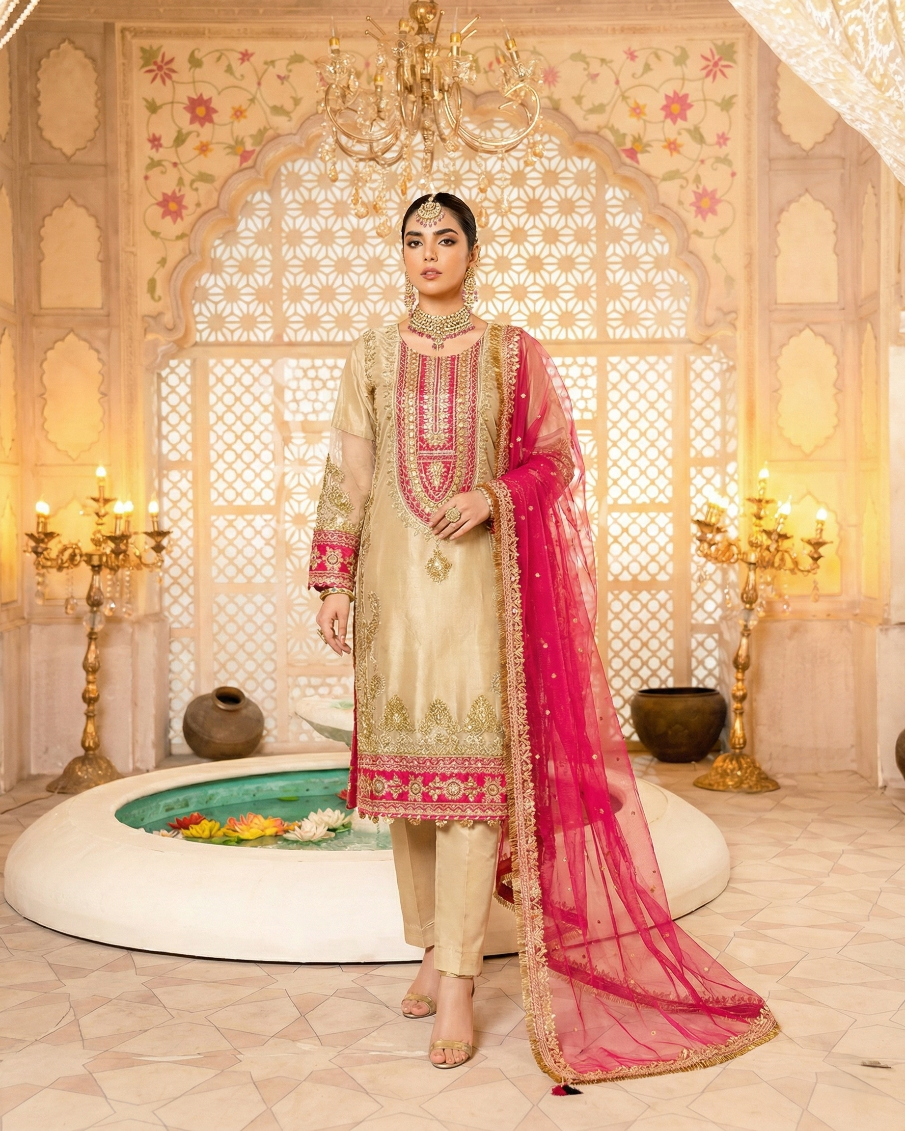 This 3-piece ready-to-wear set includes a Net shirt fabric with raw silk inner, raw silk trouser, and Net Dupatta. Adorned with delicate sequence embroidery, tila thread, and goti adda work, this outfit exudes sophistication. Perfect for any occasion, elevate your style with SH.