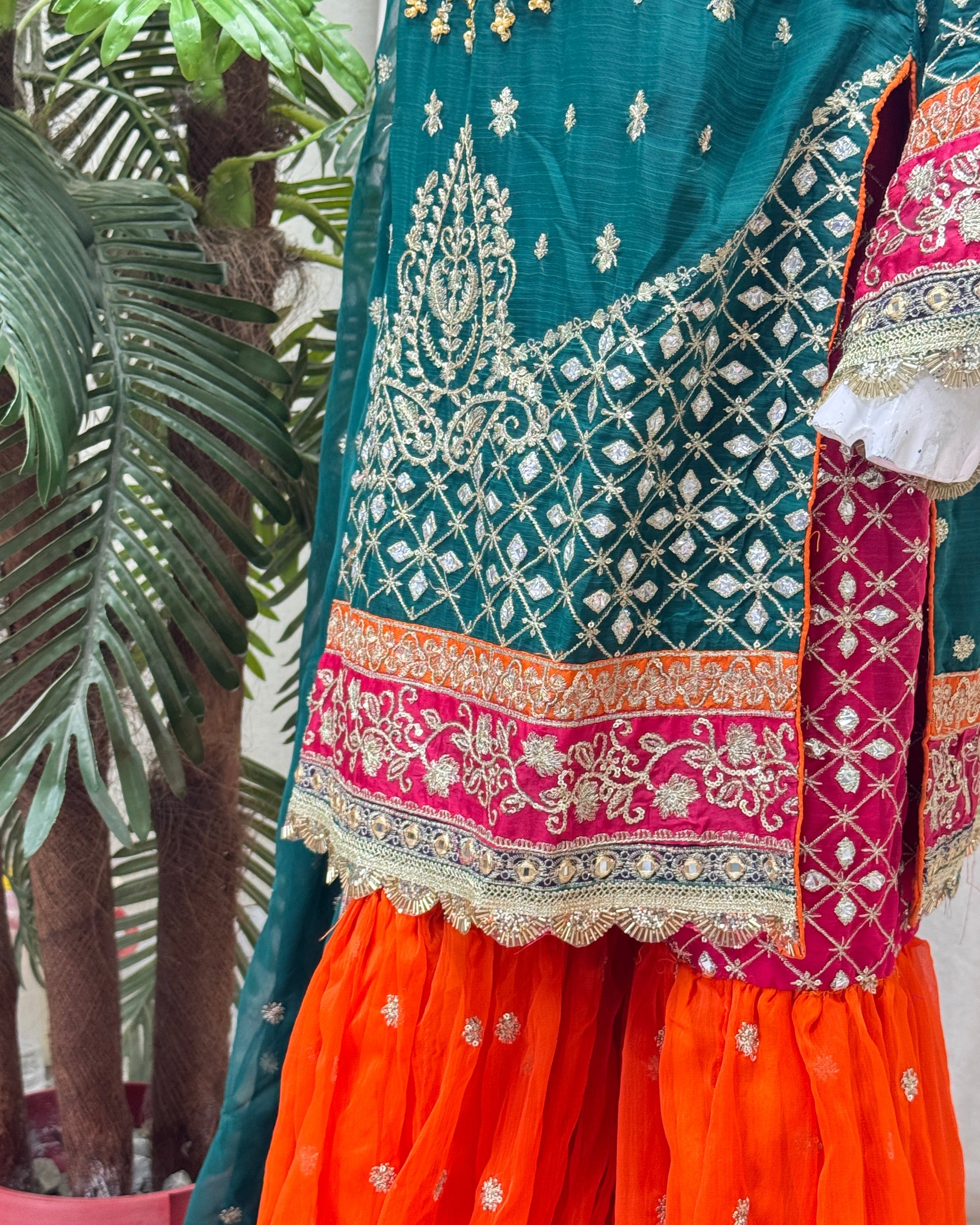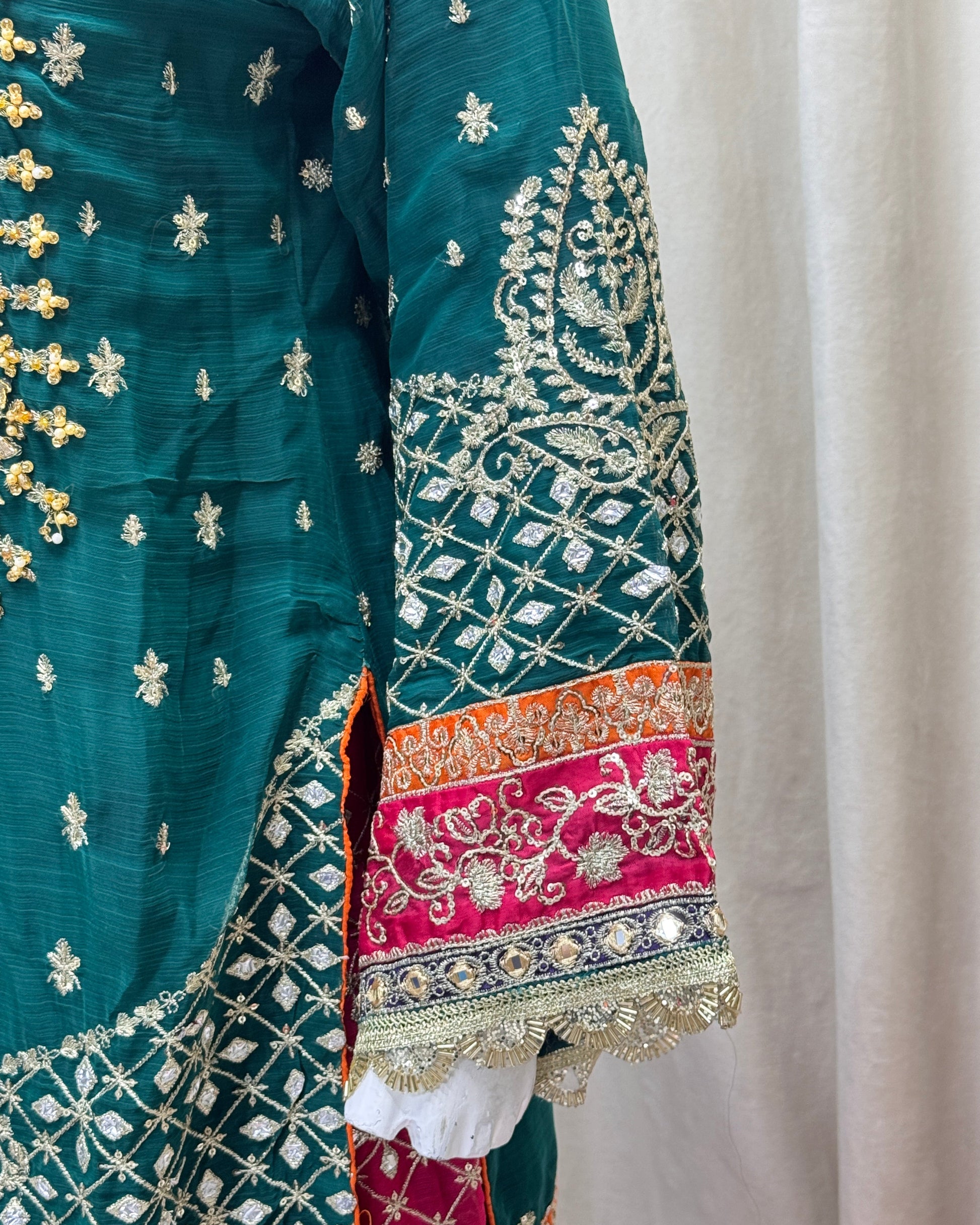 Add a touch of elegance with this 3PC READY TO WEAR ensemble designed by SH. The crinkle chiffon detailing with tilla and mirror work, silk patti patch and ada work on the neckline, and multihanging on daman will make you feel luxurious and confident. The tail-embroidered sharara and embroidered dupatta with tassels complete the look.