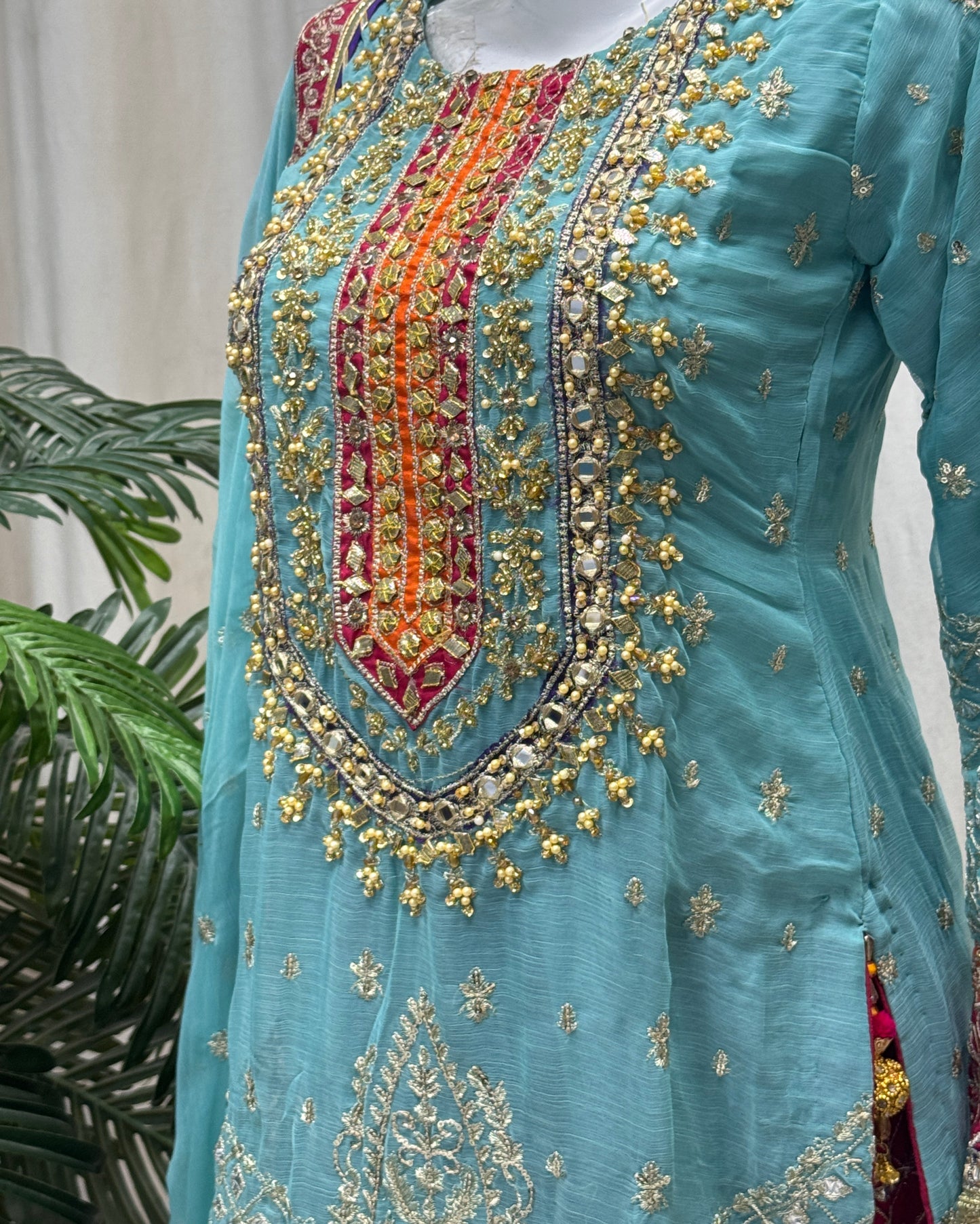 Shirt: Crinkle Chiffon detailing with tilla and mirror work, silk patti patch on the neckline, and complete ada work on the neckline and gotti with multi hanging on daman.