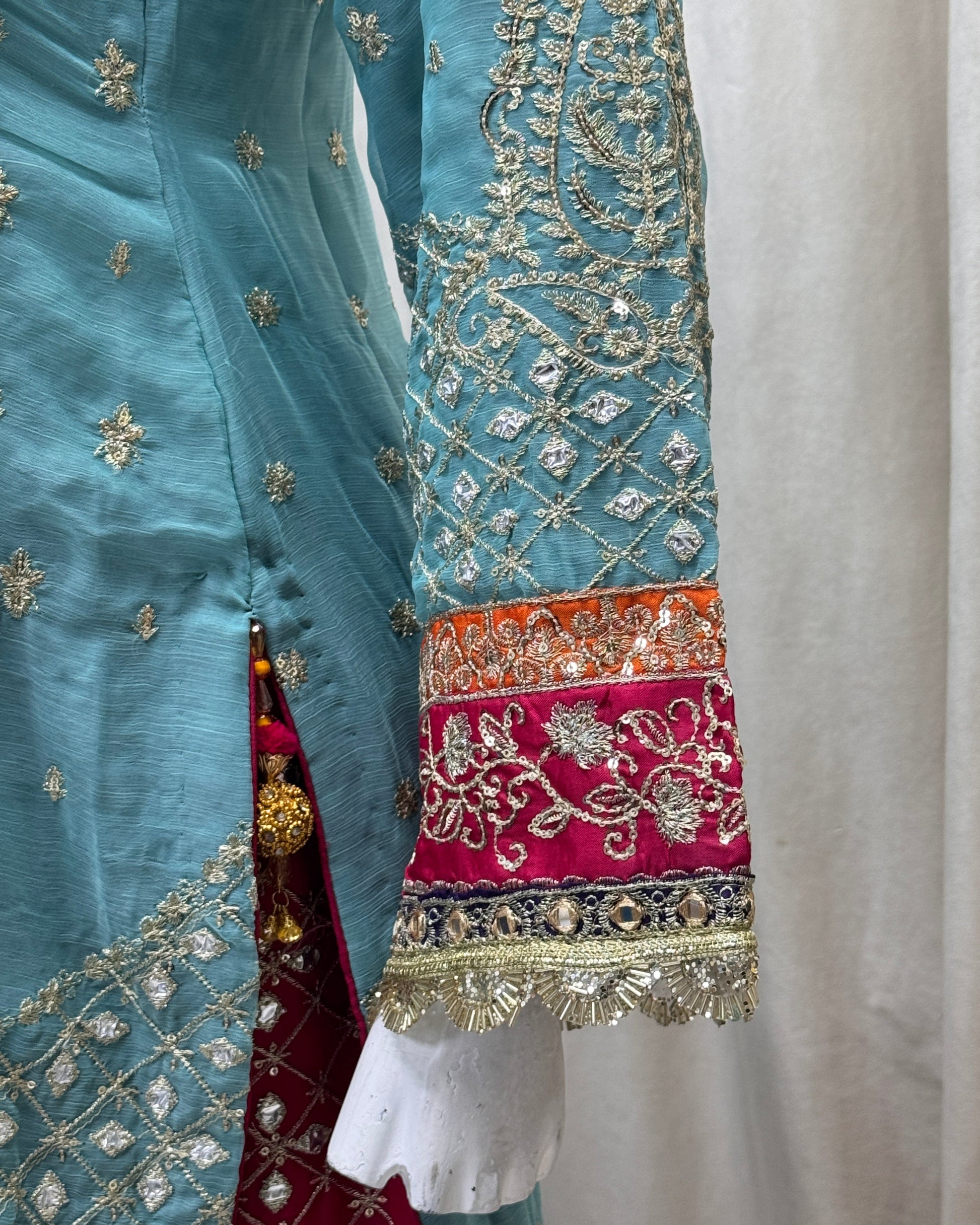 Add a touch of elegance with this 3PC READY TO WEAR ensemble designed by SH. The crinkle chiffon detailing with tilla and mirror work, silk patti patch and ada work on the neckline, and multihanging on daman will make you feel luxurious and confident. The tail-embroidered sharara and embroidered dupatta with tassels complete the look.