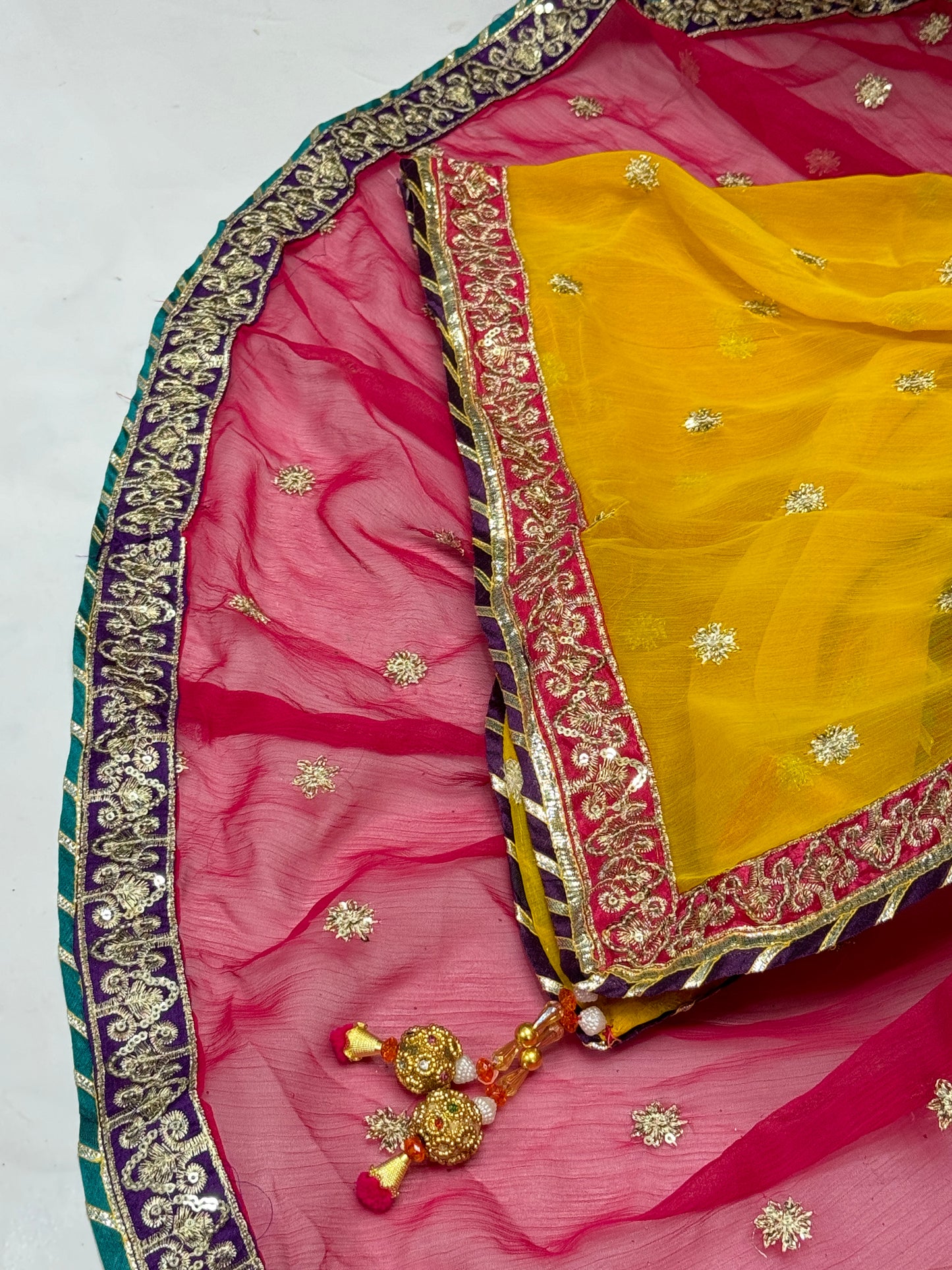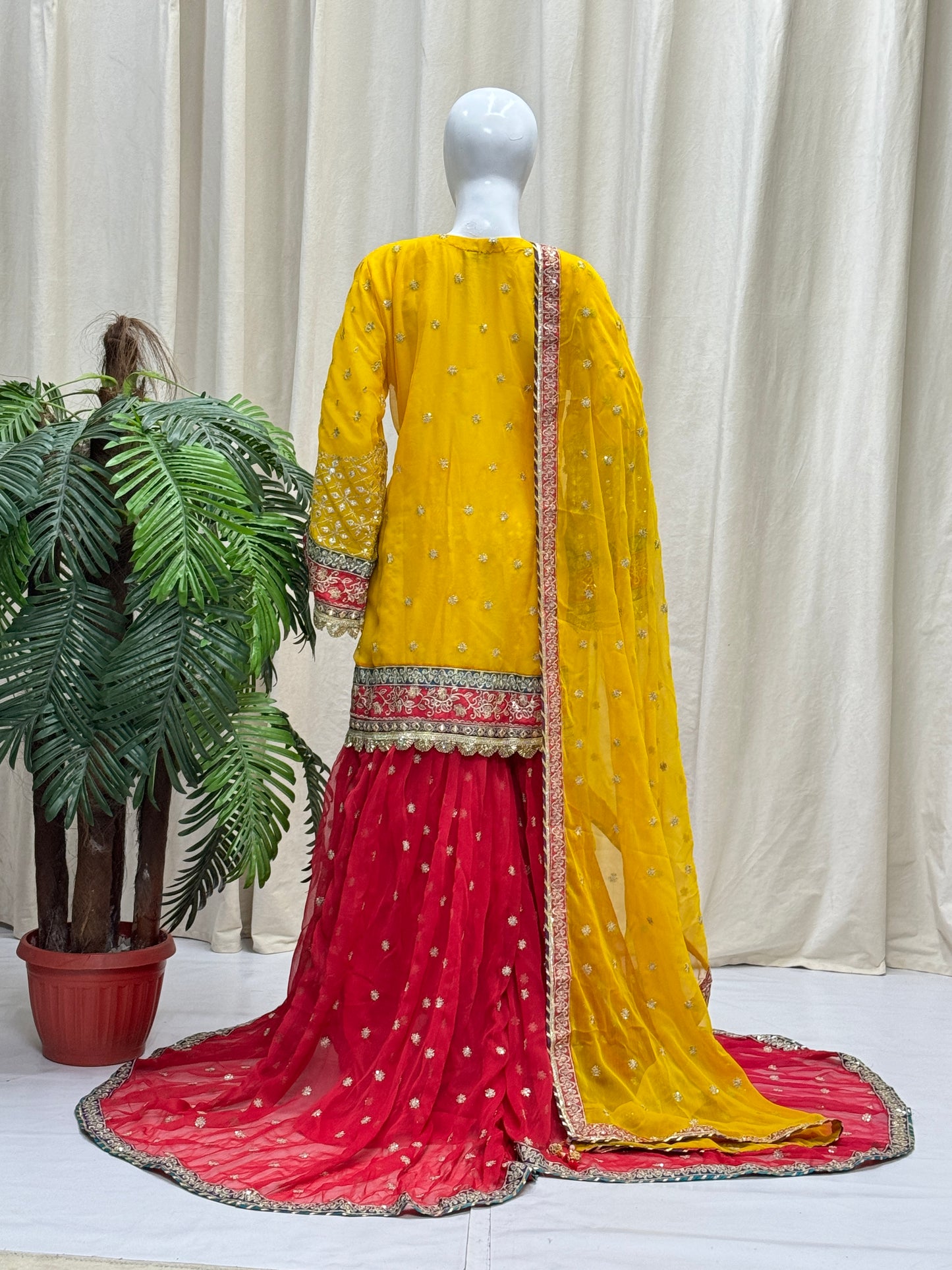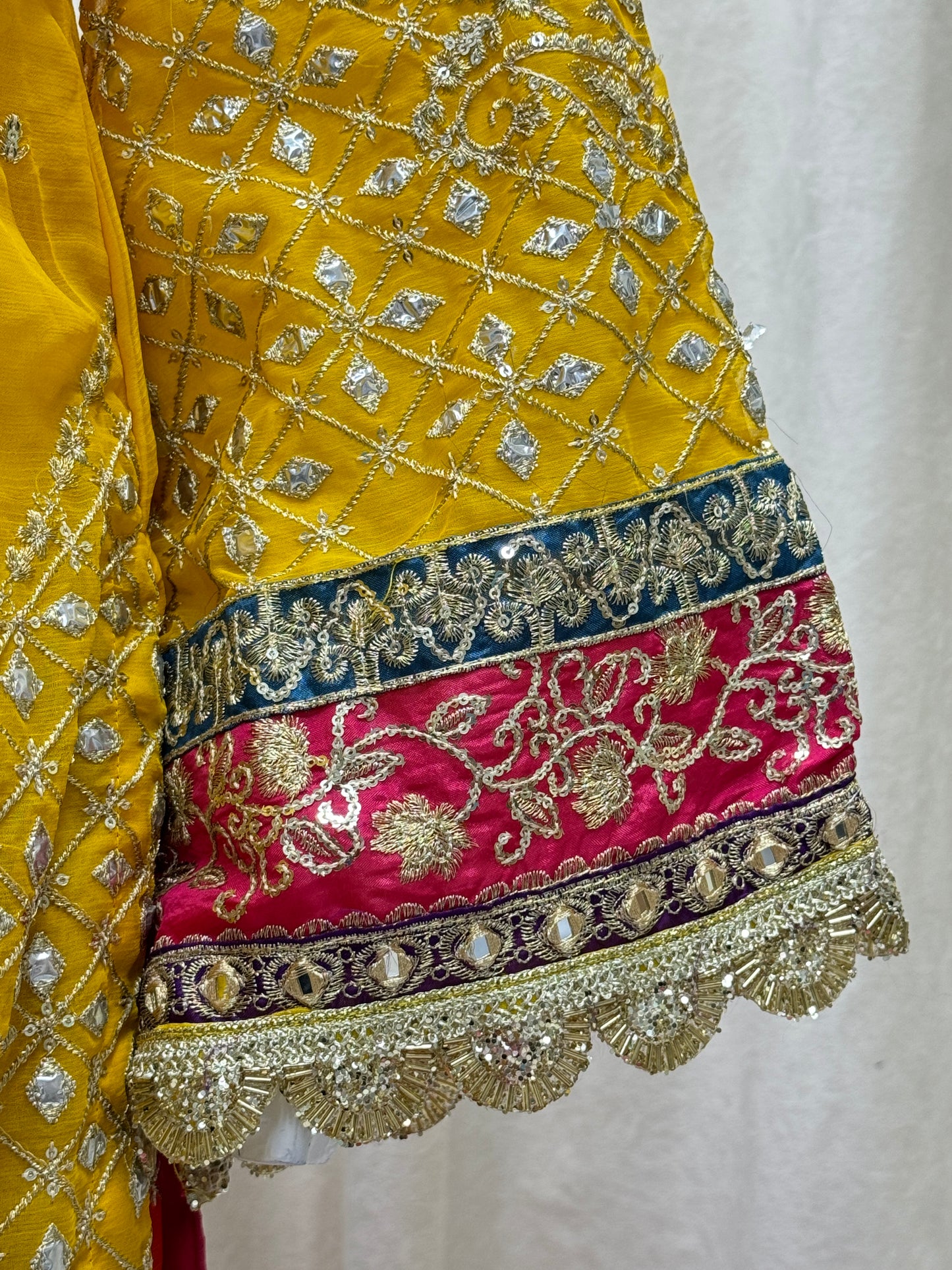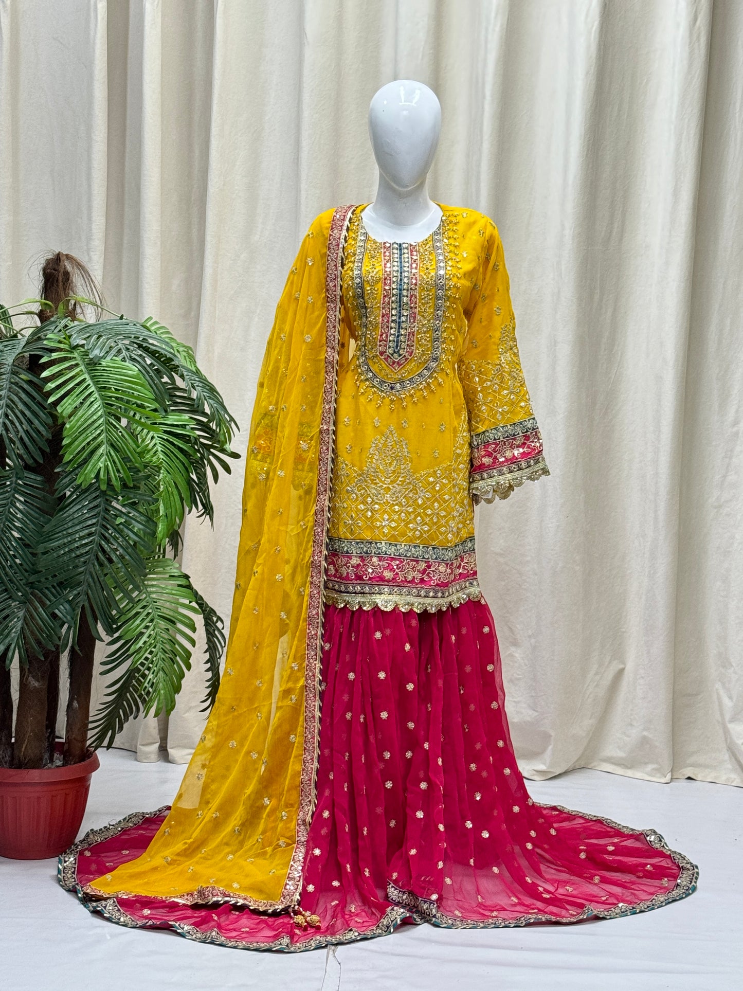 Add a touch of elegance with this 3PC READY TO WEAR ensemble designed by SH. The crinkle chiffon detailing with tilla and mirror work, silk patti patch and ada work on the neckline, and multihanging on daman will make you feel luxurious and confident. The tail-embroidered sharara and embroidered dupatta with tassels complete the look.