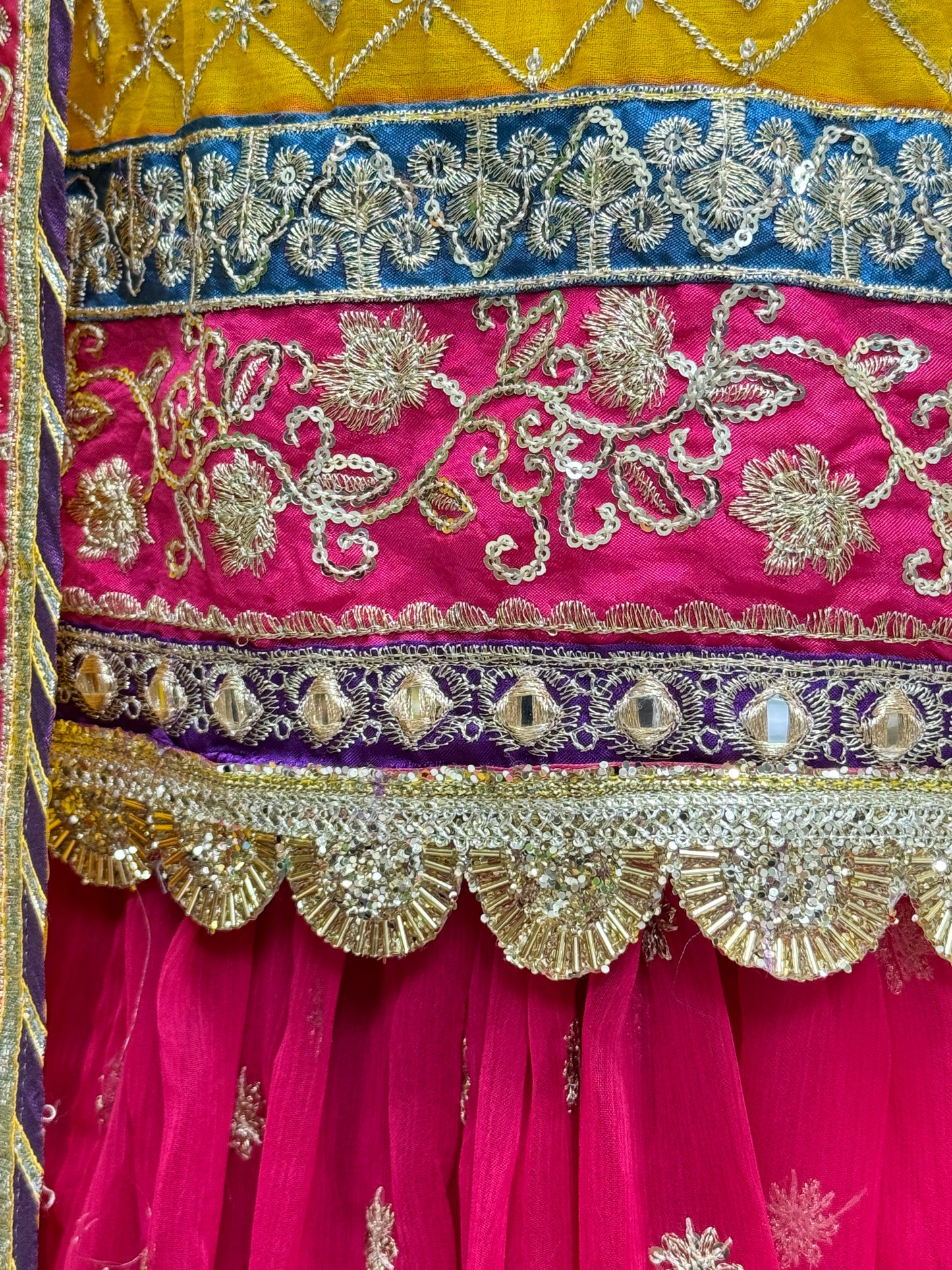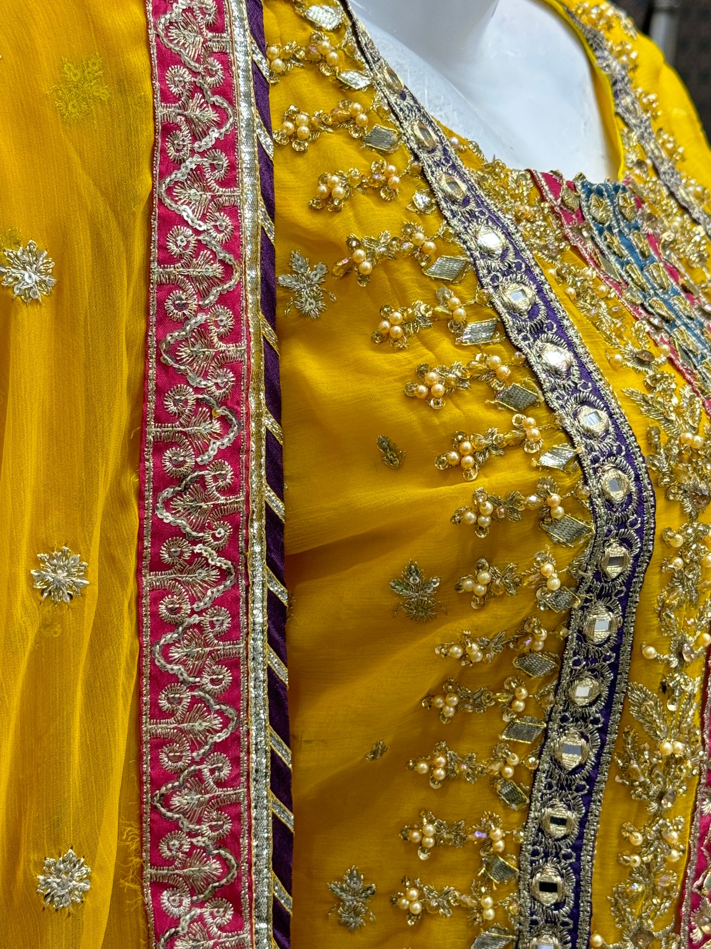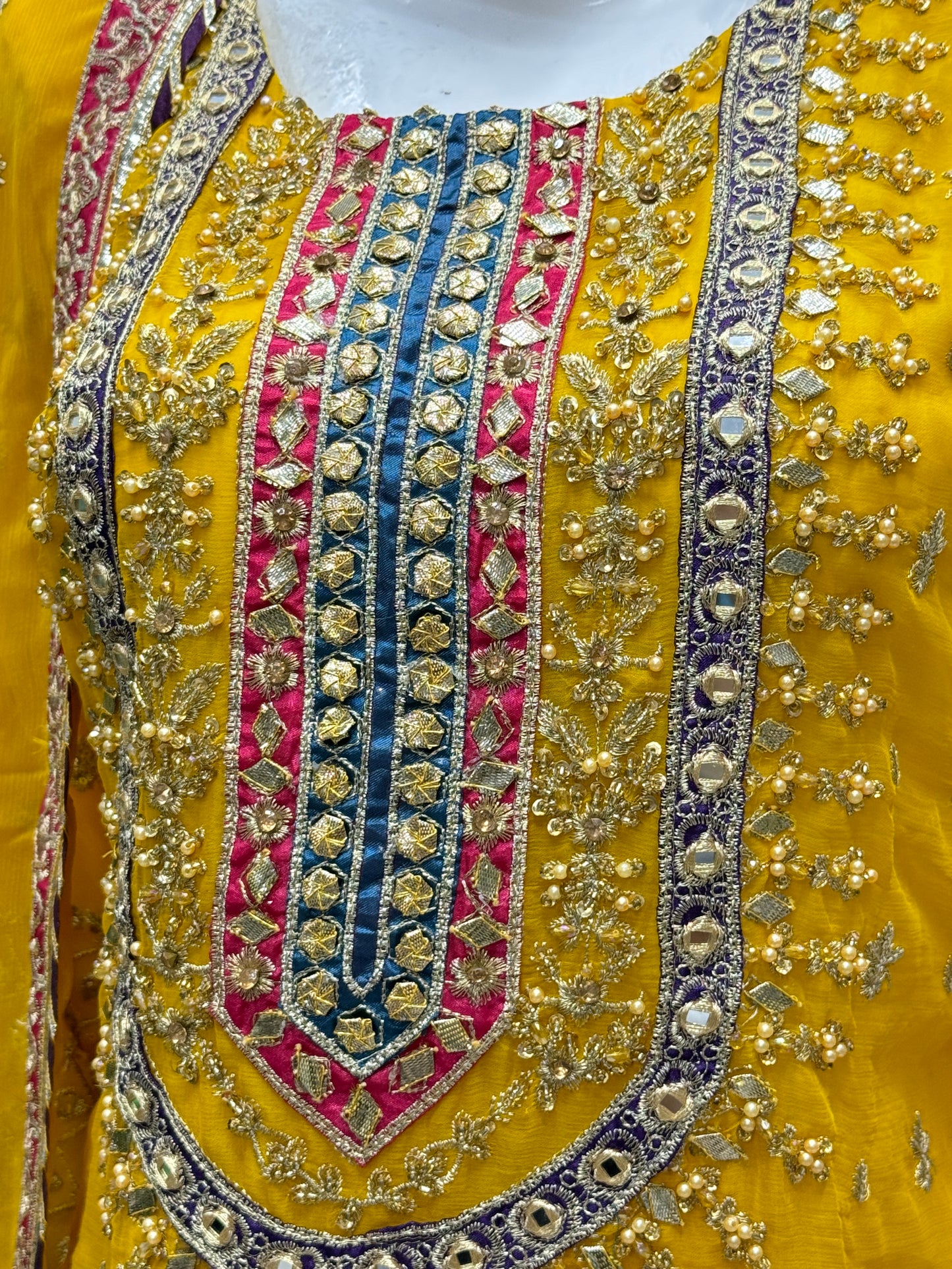 Shirt: Crinkle Chiffon detailing with tilla and mirror work, silk patti patch on the neckline, and complete ada work on the neckline and gotti with multi hanging on daman.
