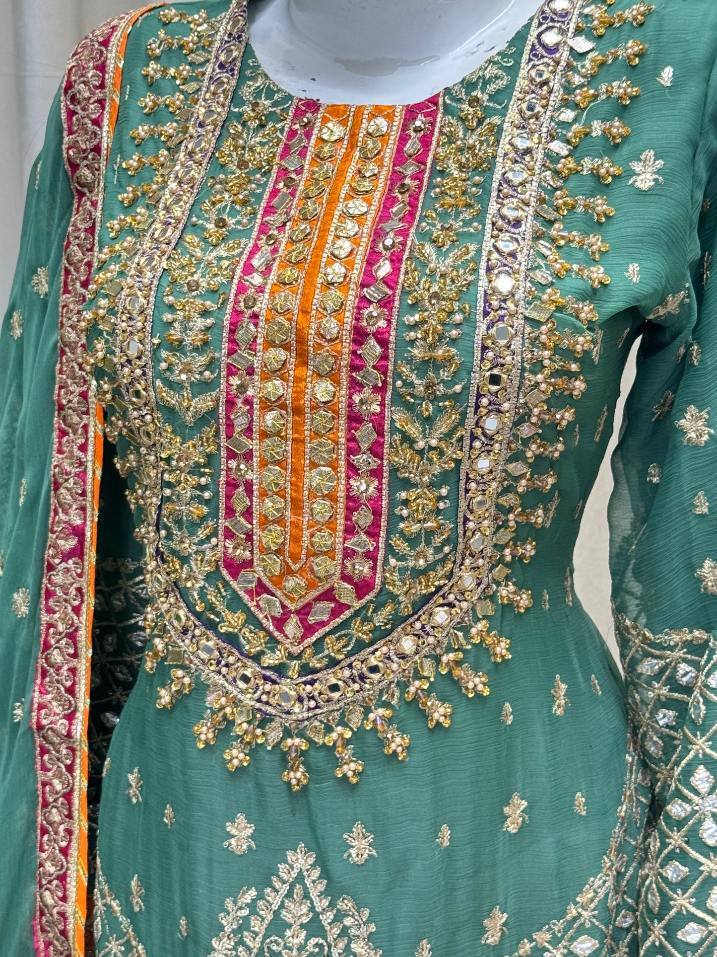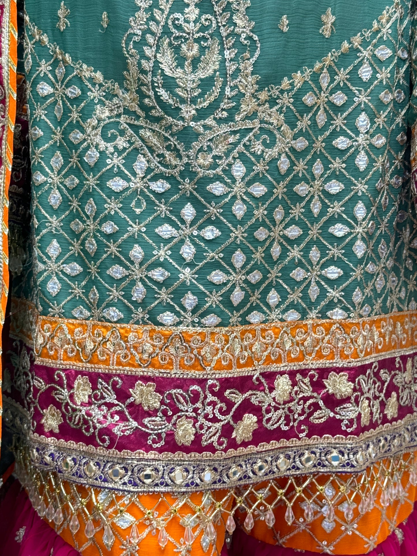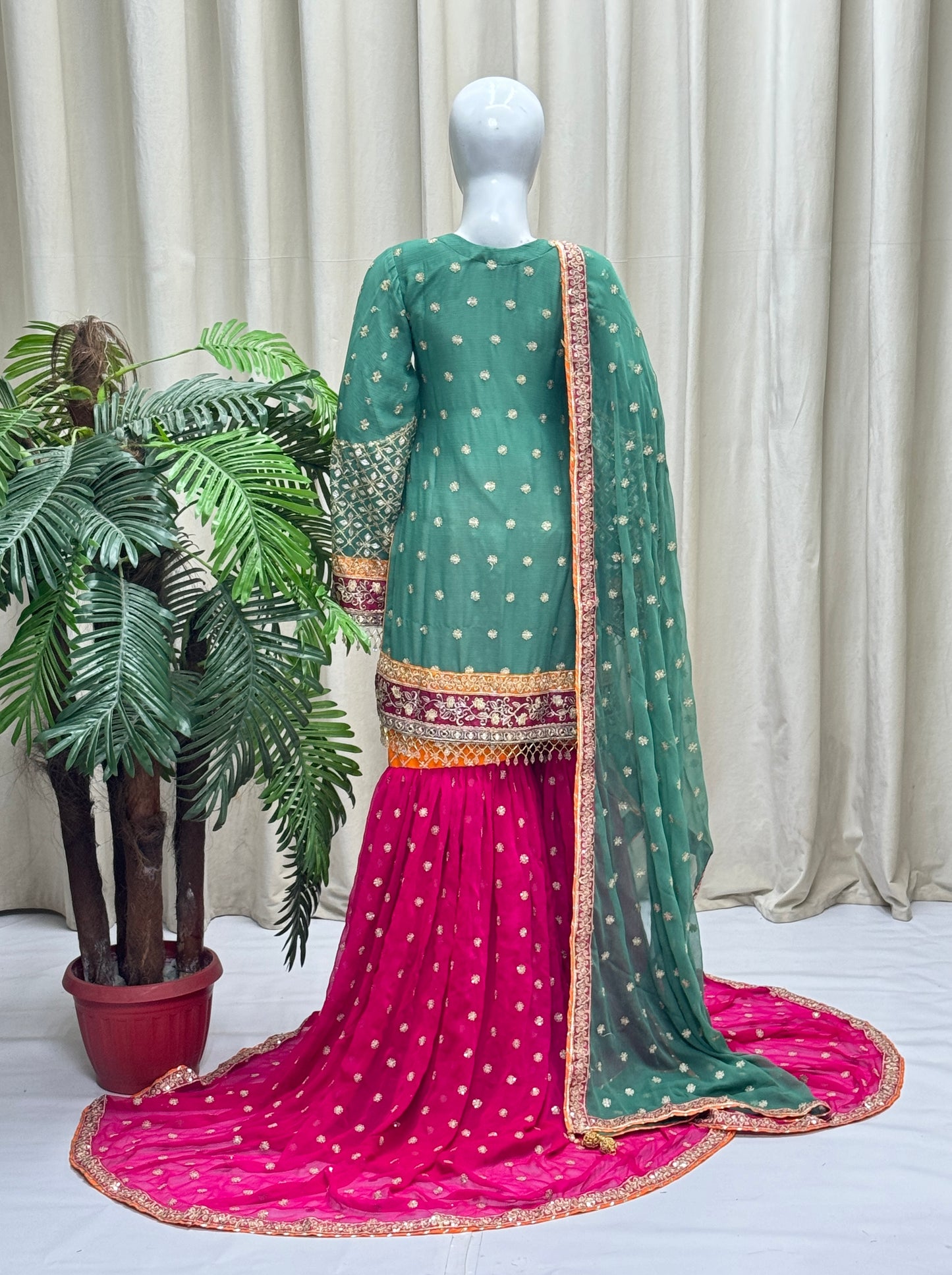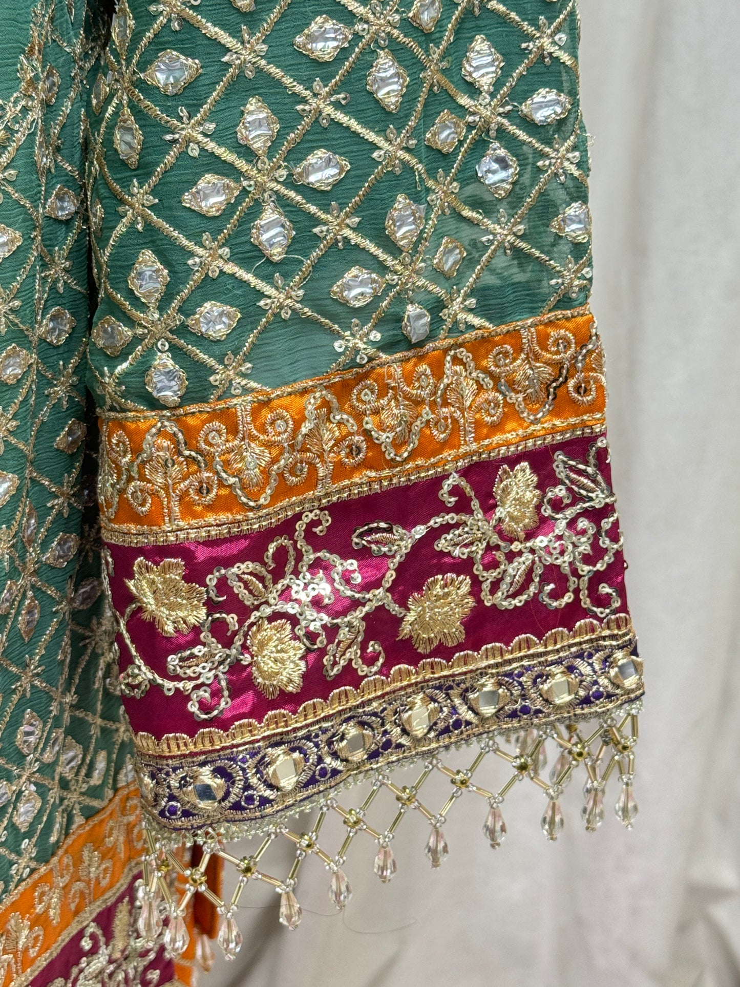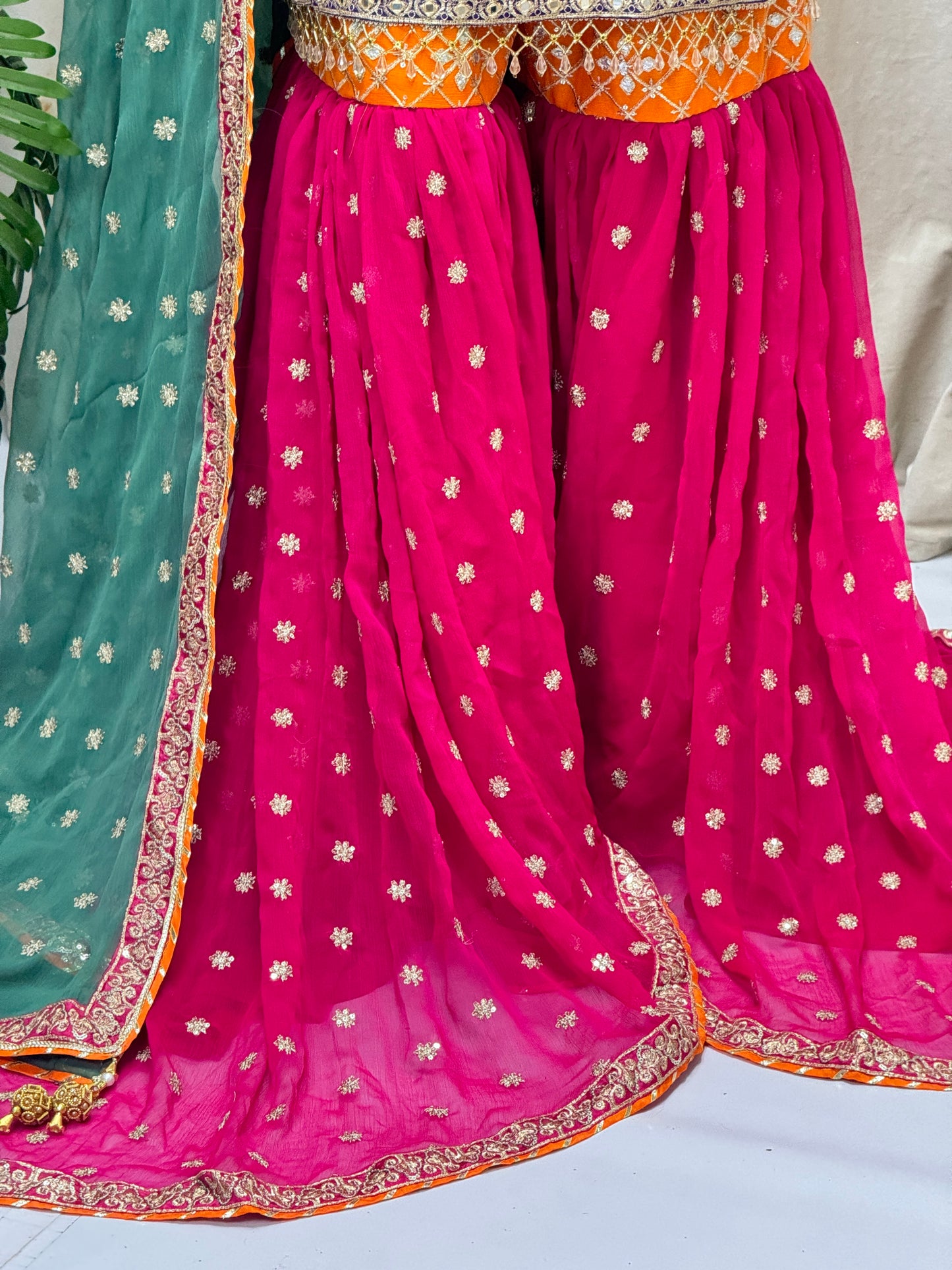 Add a touch of elegance with this 3PC READY TO WEAR ensemble designed by SH. The crinkle chiffon detailing with tilla and mirror work, silk patti patch and ada work on the neckline, and multihanging on daman will make you feel luxurious and confident. The tail embroidered sharara and embroidered dupatta with tassels complete the look.