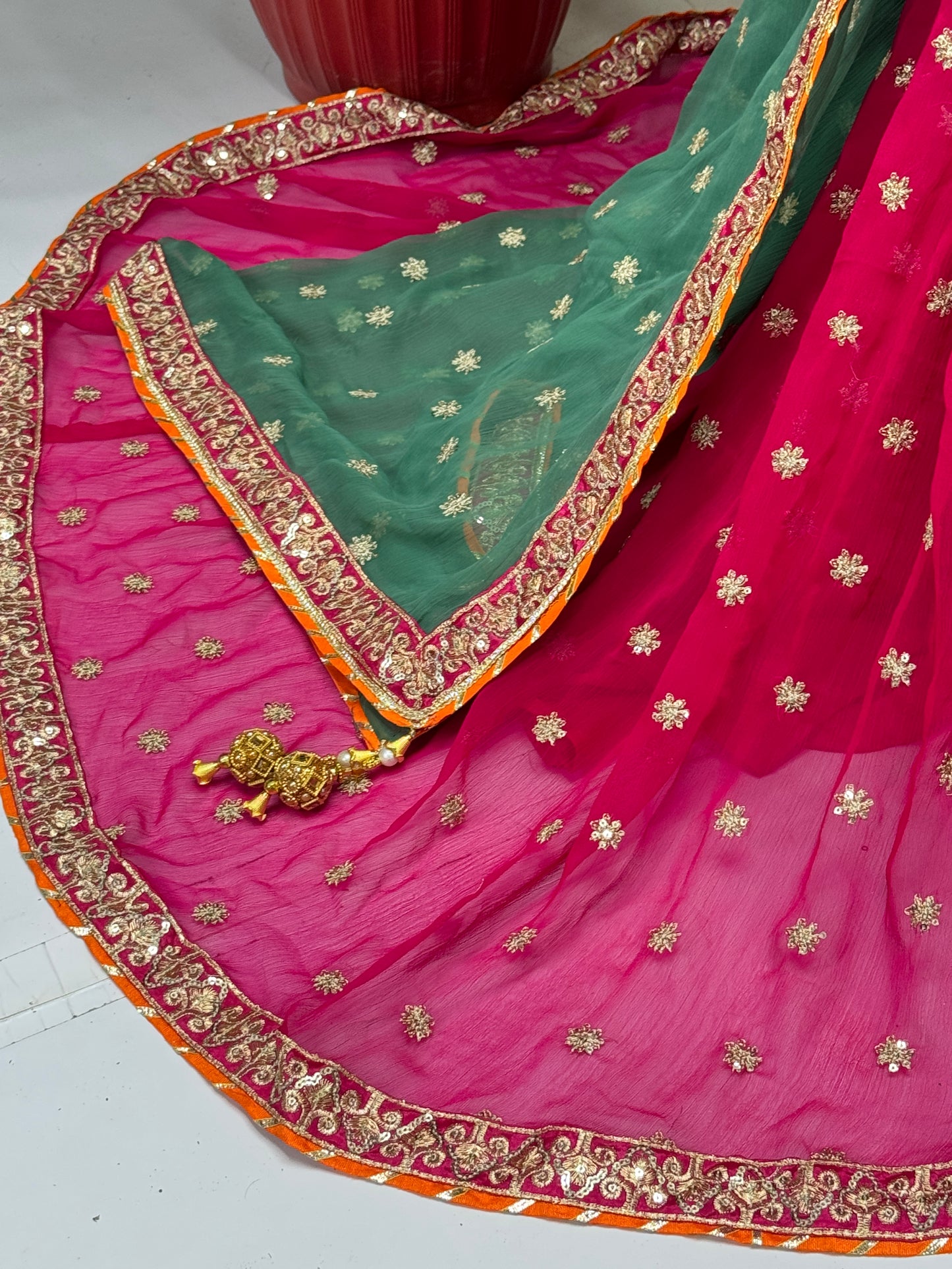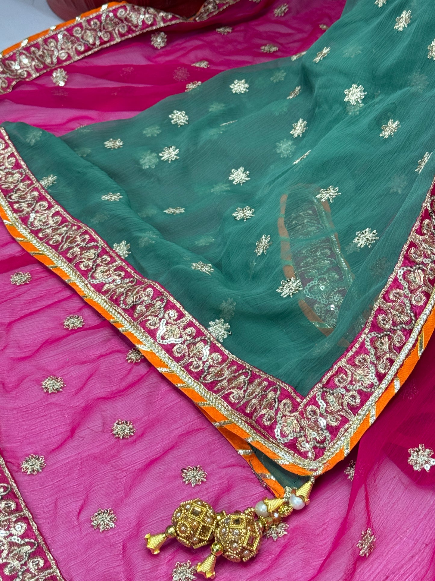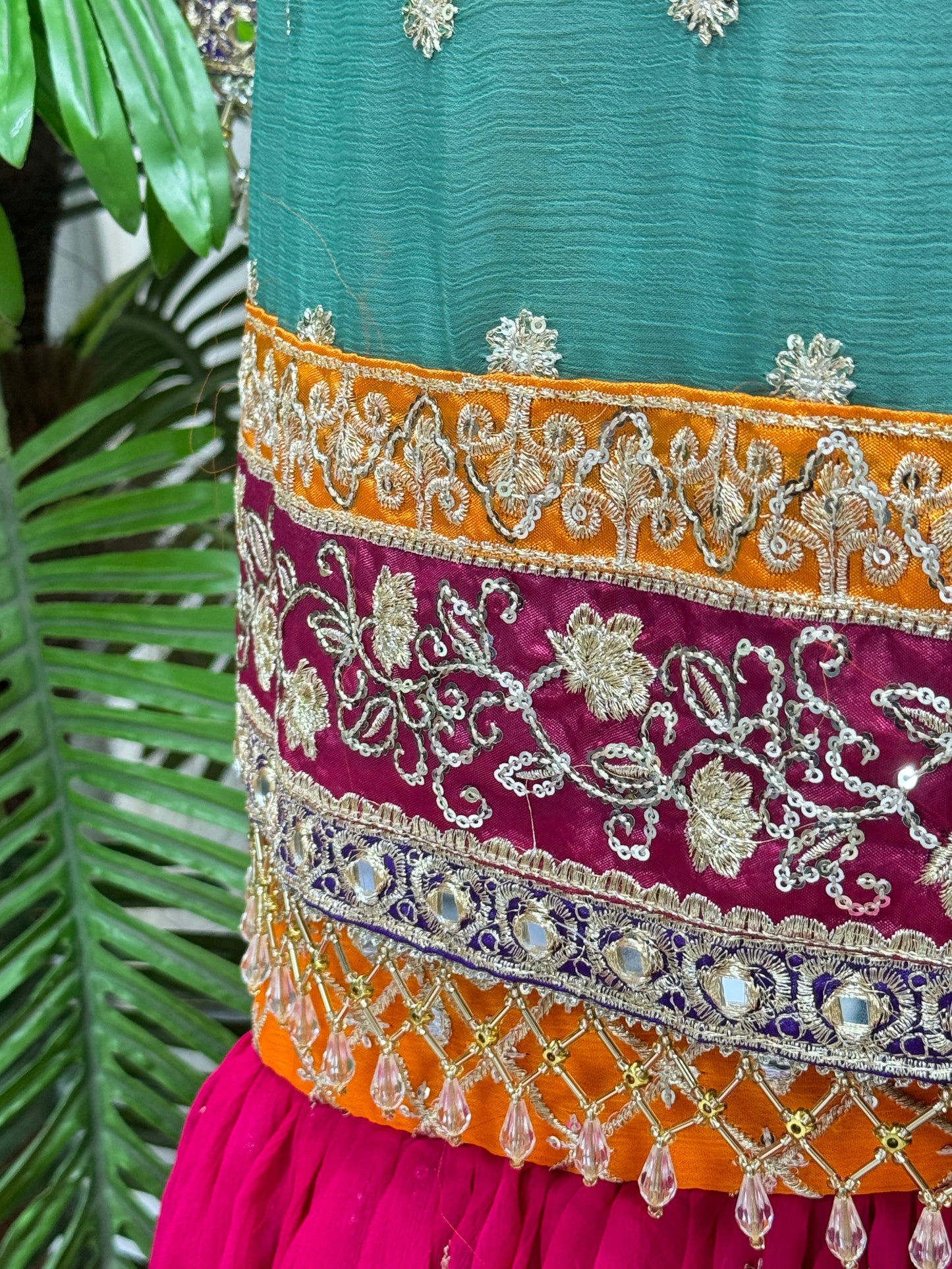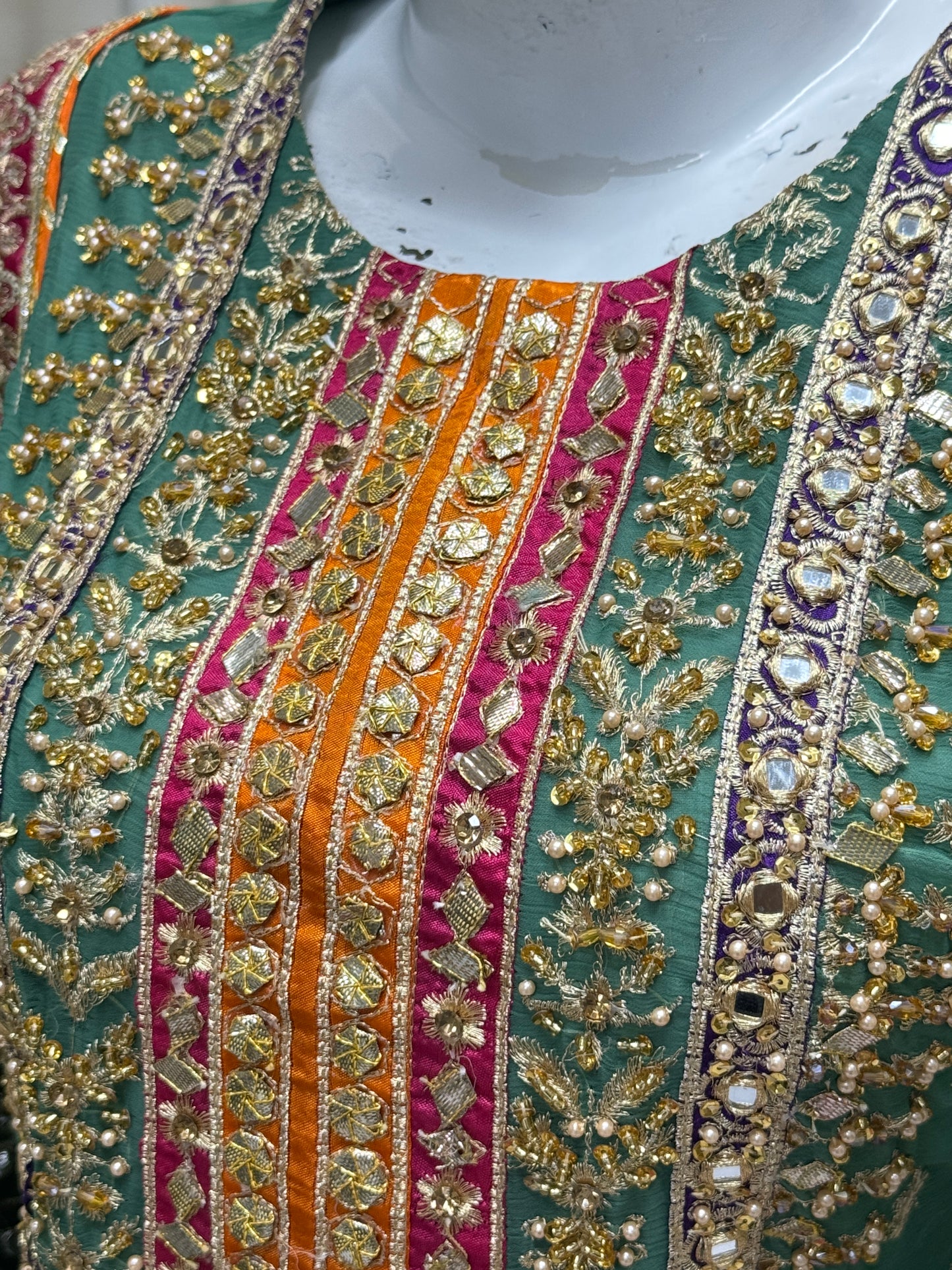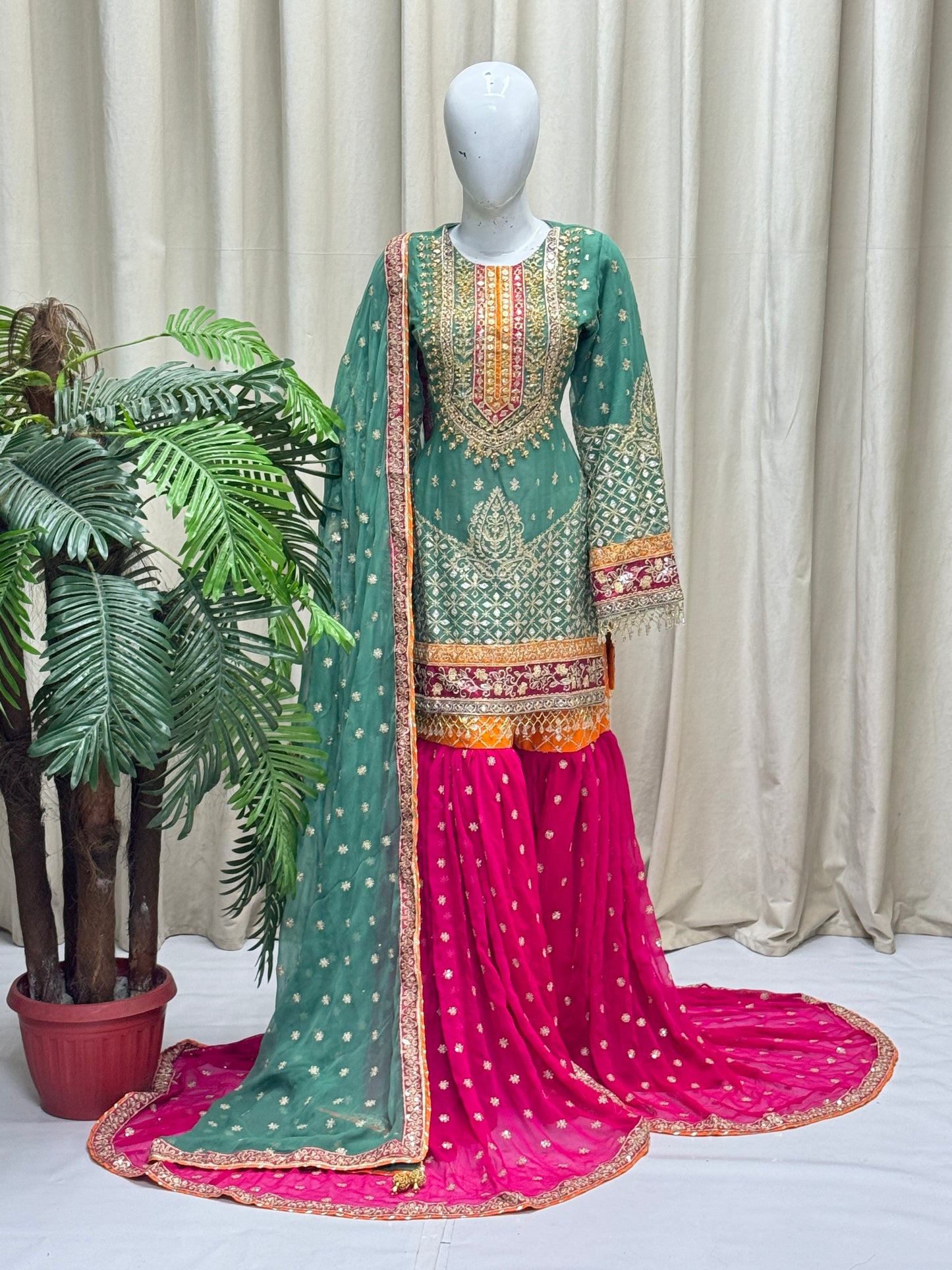 Add a touch of elegance with this 3PC READY TO WEAR ensemble designed by SH. The crinkle chiffon detailing with tilla and mirror work, silk patti patch and ada work on the neckline, and multihanging on daman will make you feel luxurious and confident. The tail embroidered sharara and embroidered dupatta with tassels complete the look.