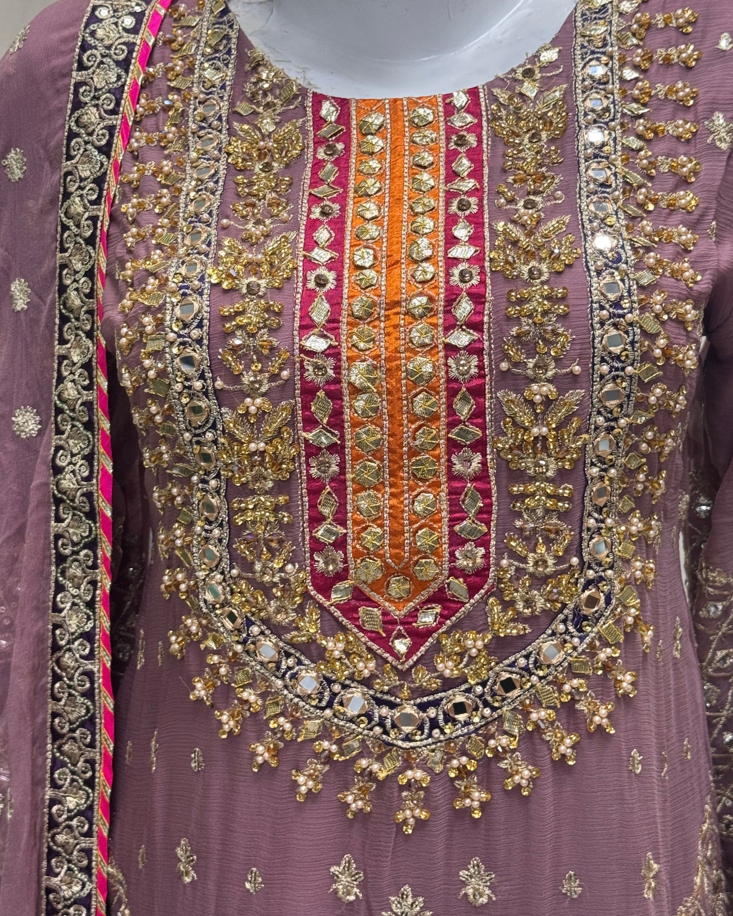 Shirt: Crinkle Chiffon detailing with tilla and mirror work, silk patti patch on the neckline, and complete ada work on the neckline and gotti with multi hanging on daman.