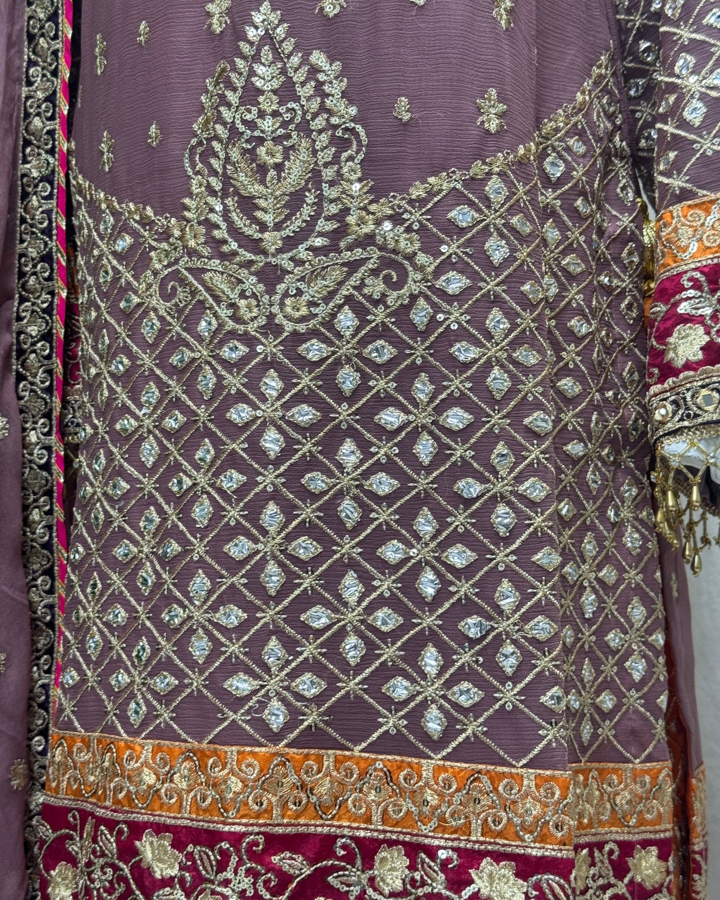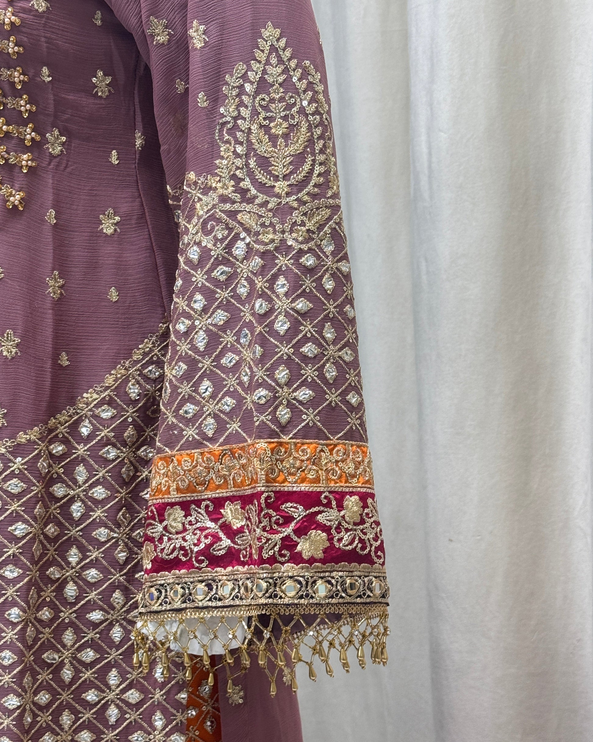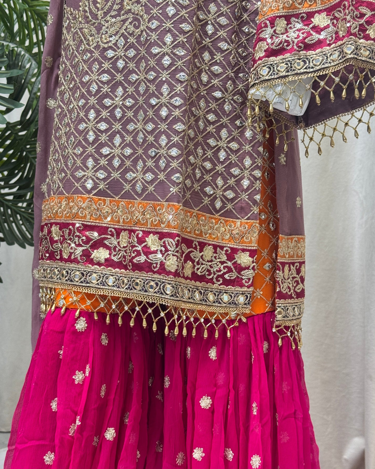 Add a touch of elegance with this 3PC READY TO WEAR ensemble designed by SH. The crinkle chiffon detailing with tilla and mirror work, silk patti patch and ada work on the neckline, and multihanging on daman will make you feel luxurious and confident. The tail embroidered sharara and embroidered dupatta with tassels complete the look.