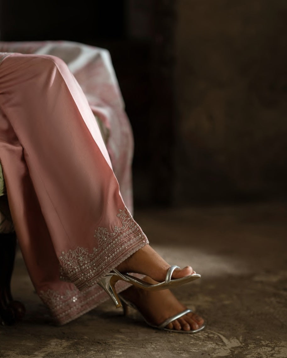 A viscose shirt featuring delicate white floral embroidery along the neckline, borders, and sleeves, with scattered star-like motifs, finished with a composed daman and hem border. The pastel pink silhouette is paired with straight viscose trousers with subtle hem embroidery. A printed viscose dupatta in matching tones with a detailed pallu border completes the dreamy look.