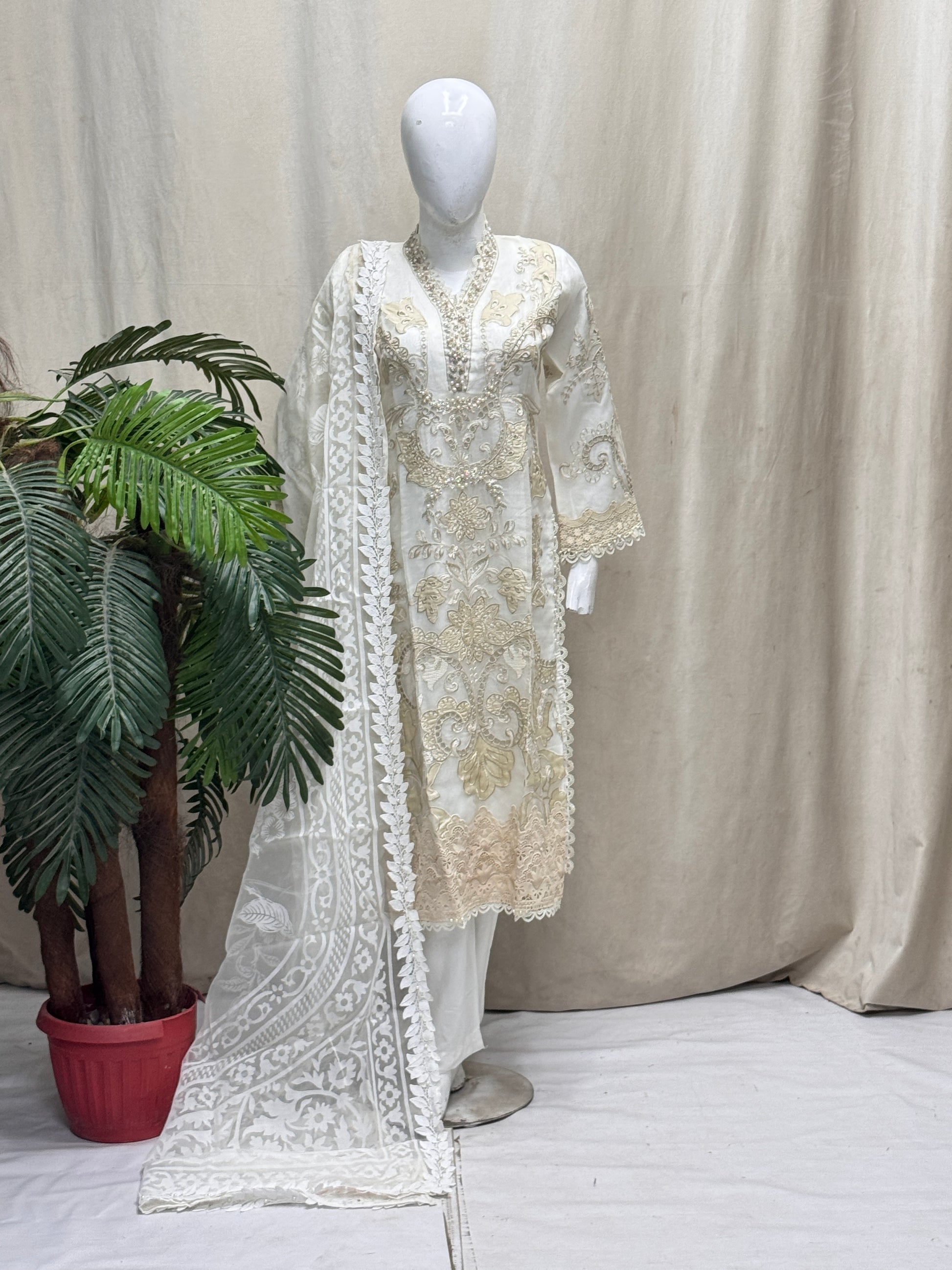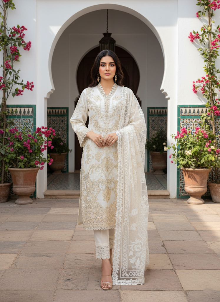 A straight organza shirt crafted for a graceful silhouette, paired with viscose trousers that balance comfort and structure. The matching organza dupatta adds a light, airy charm, making this ensemble perfect for formal evenings and festive gatherings.