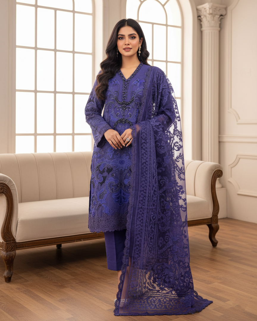 An elegant organza shirt paired with viscose trousers for a sleek, polished fit. The matching organza dupatta completes the look with a refined and delicate finish, perfect for both formal gatherings and chic occasions.
