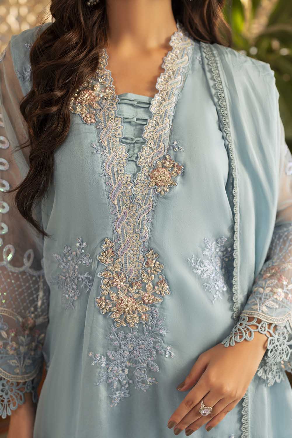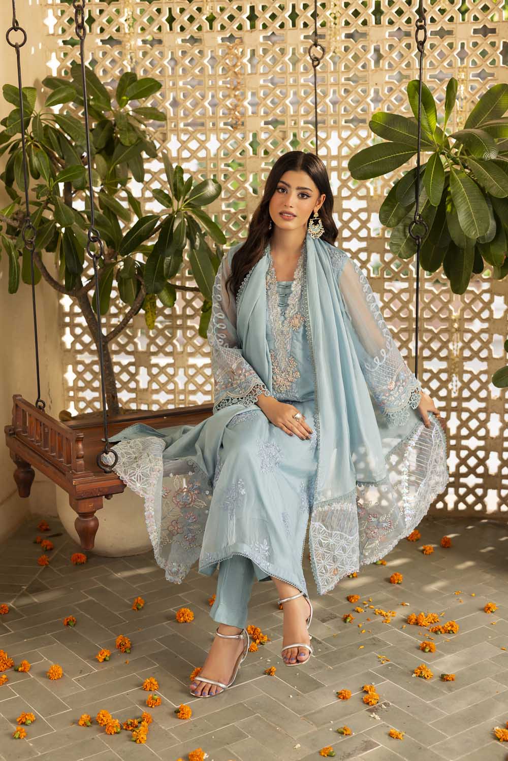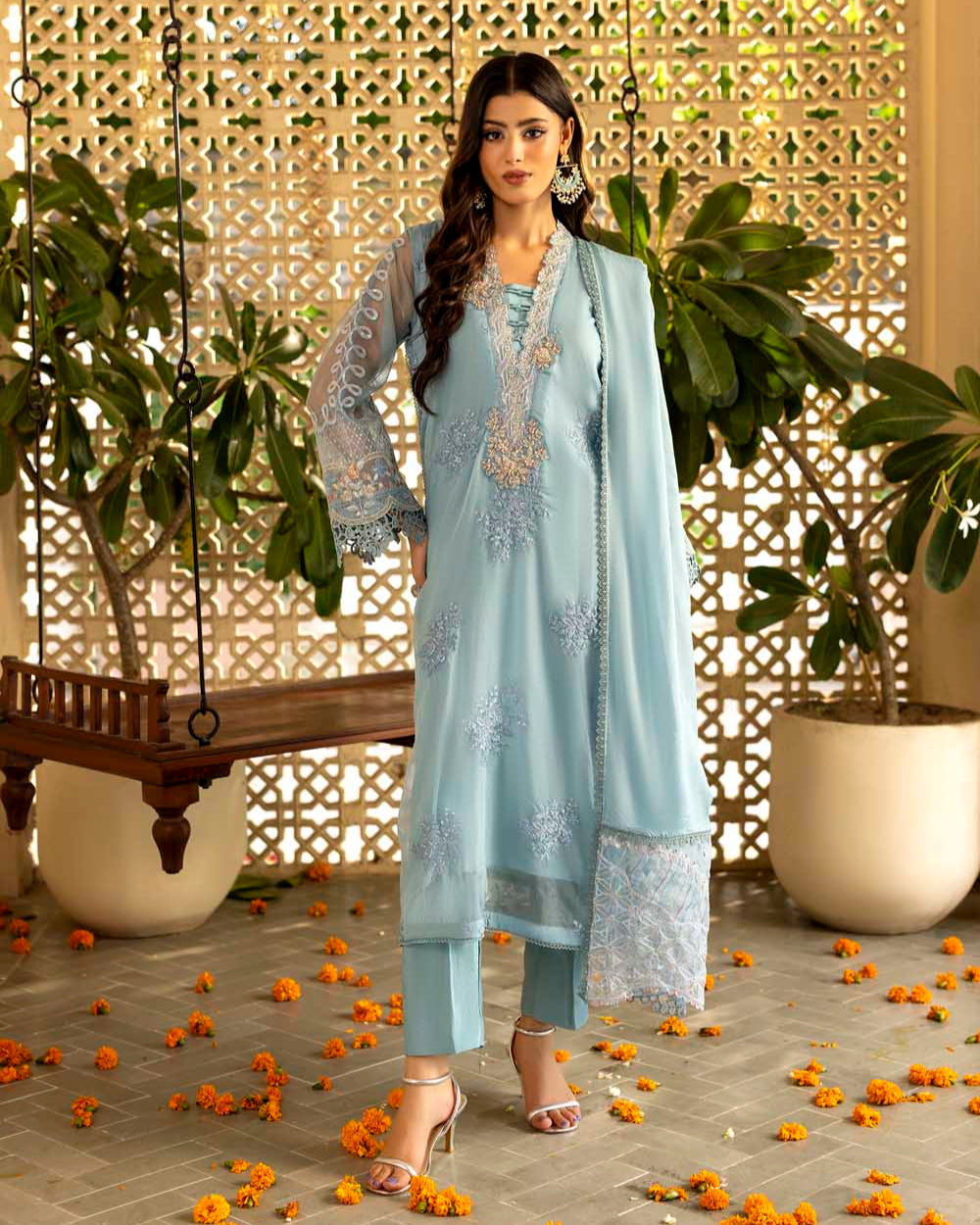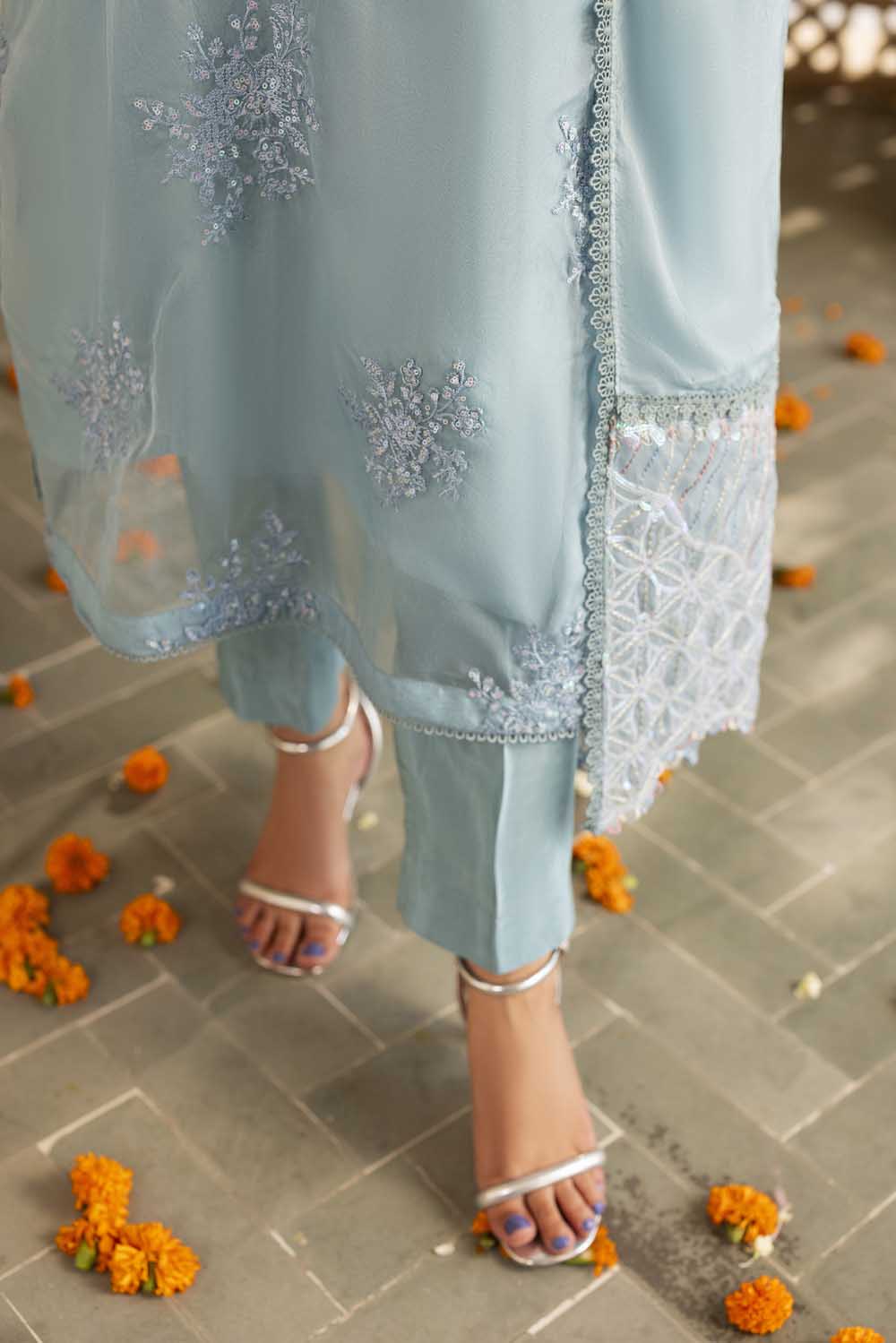 An organza shirt beautifully embroidered on the neckline, elevated with delicate hand-embellished 3D motifs for a luxurious touch. The composed embroidered sleeves are finished with borders and lace, adding timeless detail. Paired with sleek taper pants in Russian grip and a silk dupatta, gracefully finished with embroidered pallus and borders — this ensemble speaks elegance from every angle.