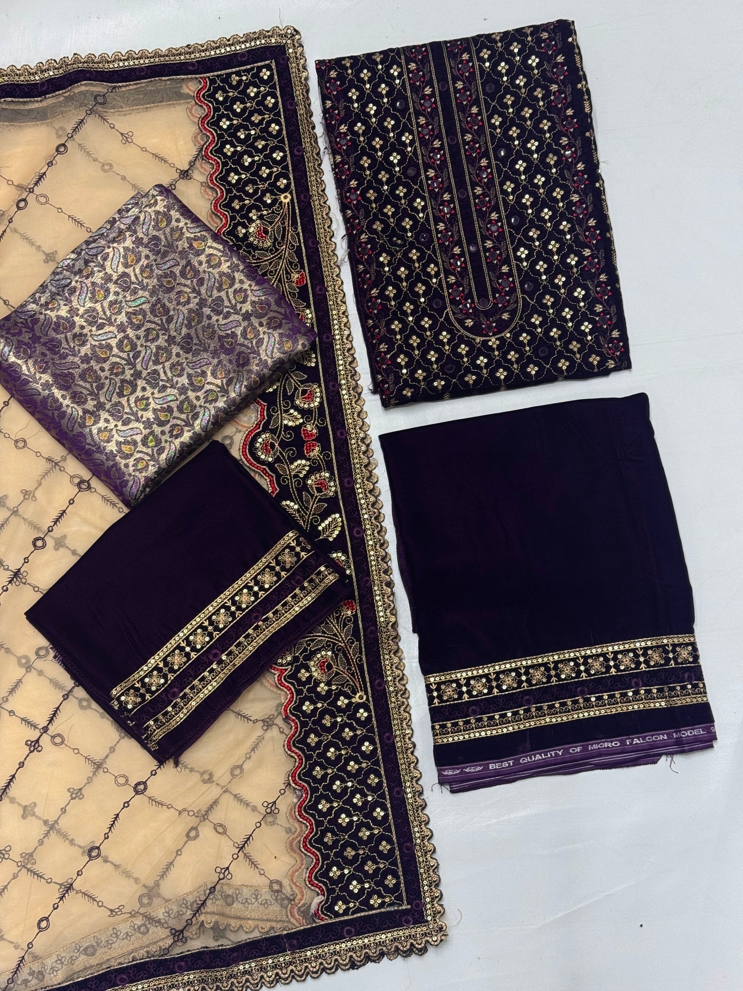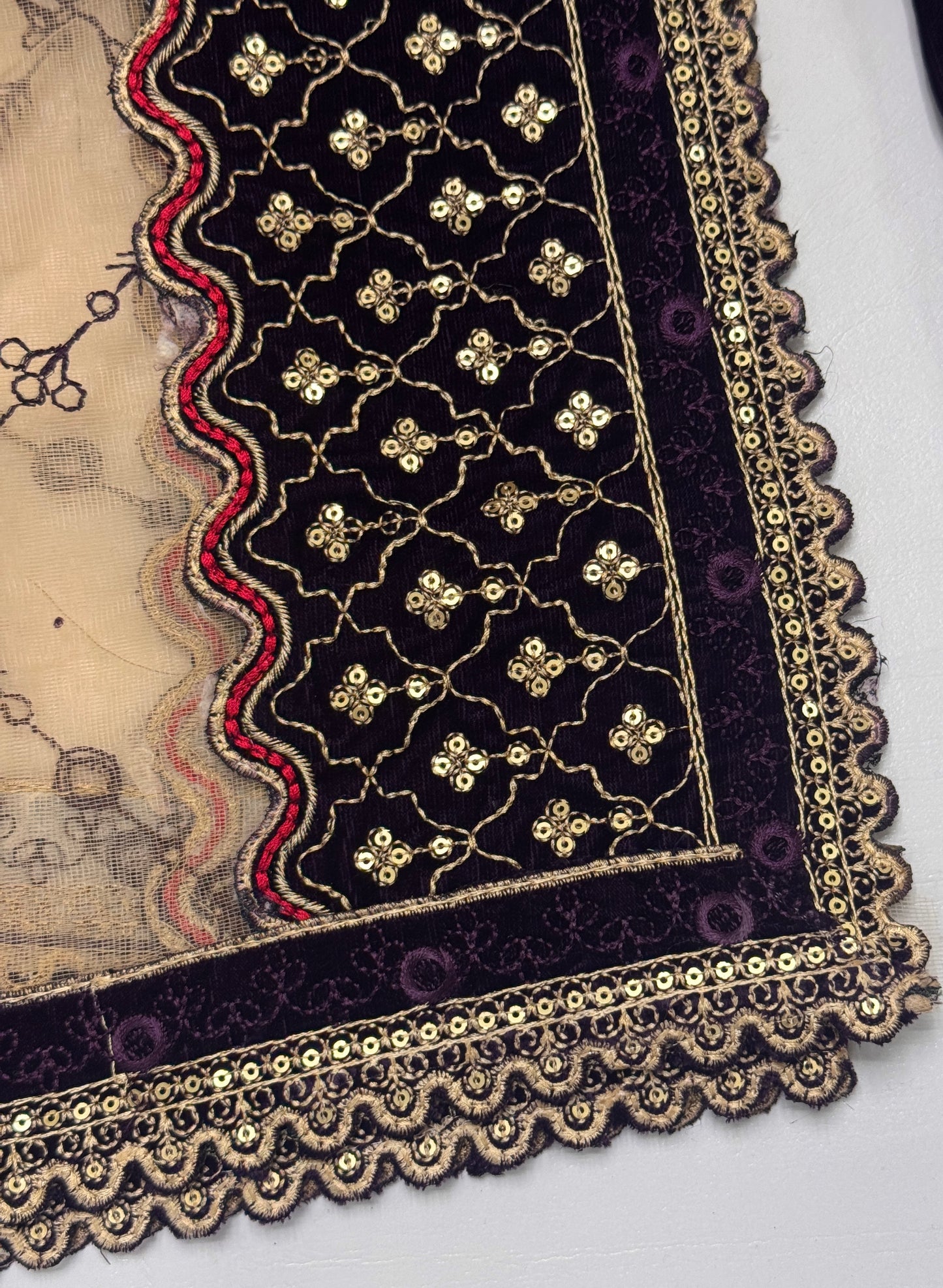 Effortlessly elegant, the Bareeze Vol 01 is perfect for any occasion. Crafted with luxurious velvet fabric, this unstitched Bareeza set includes a shirt embroidery sequence work with dupatta, and trouser in matching shades of red. The net dupatta and jamawar trouser add a touch of sophistication to this timeless ensemble.