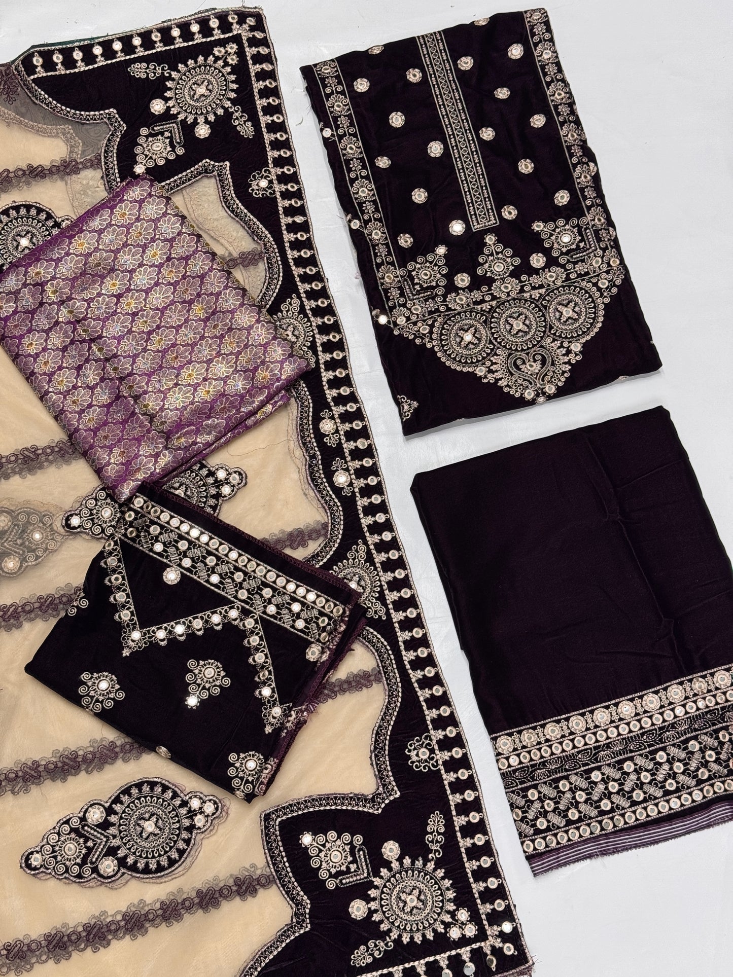 Effortlessly elegant, the Bareeze Vol 08 is perfect for any occasion. Crafted with luxurious velvet fabric, this unstitched Bareeza set includes a shirt embroidery sequence work with dupatta, and trouser in matching shades of red. The net dupatta and jamawar trouser add a touch of sophistication to this timeless ensemble.