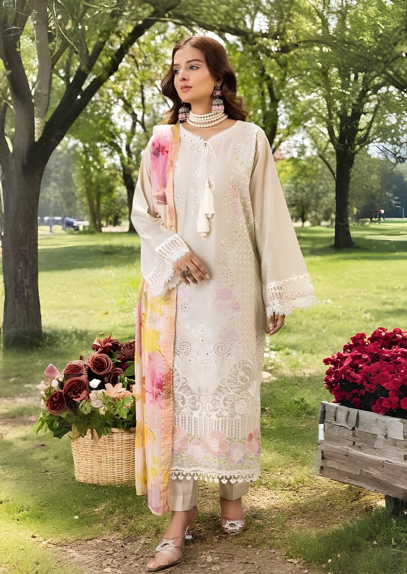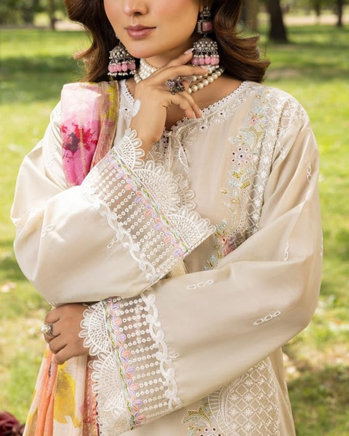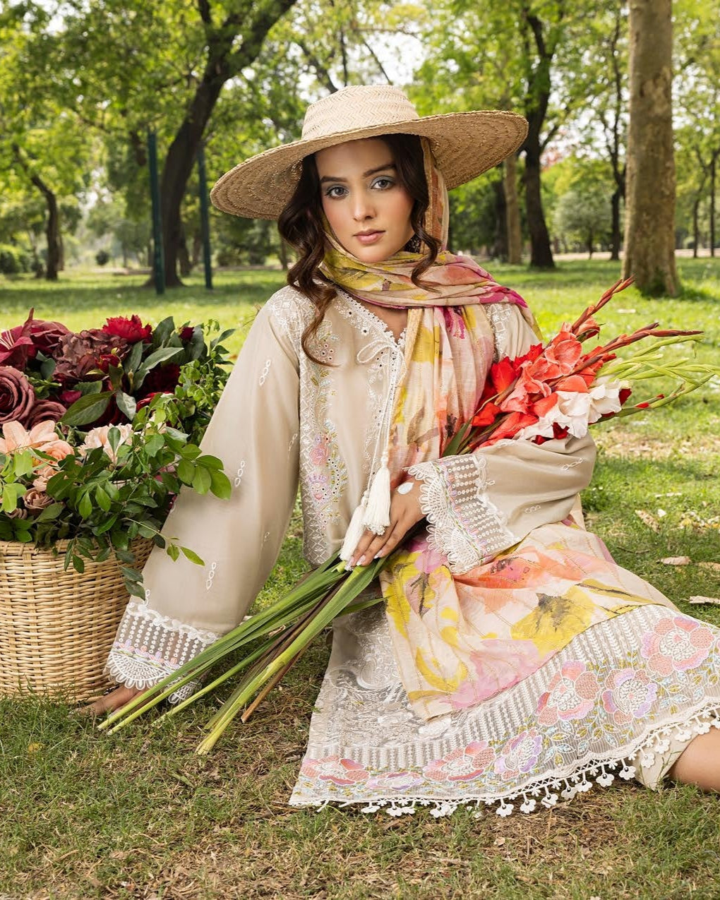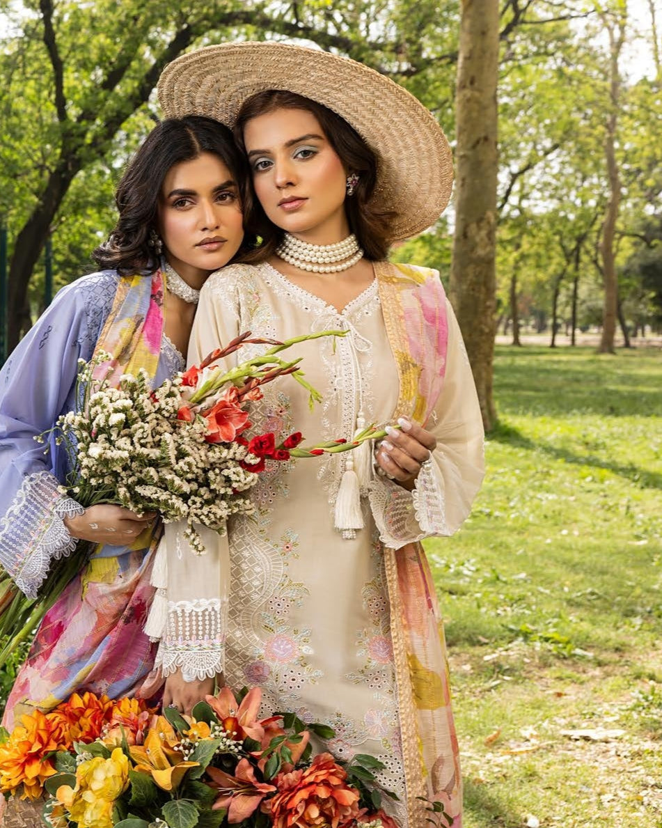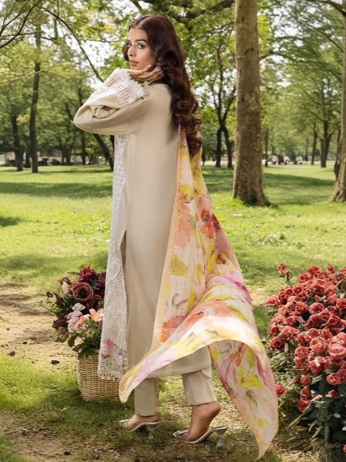You'll love the effortless elegance of this cotton formal wear. Zahra Rubab’s Blossom Lawn Edit 2 features a digitally printed lawn shirt with laser cut details, paired with a sparkling diamond dupatta and a regal farshi shalwar. A perfect blend of grace, sophistication, and modern luxury.