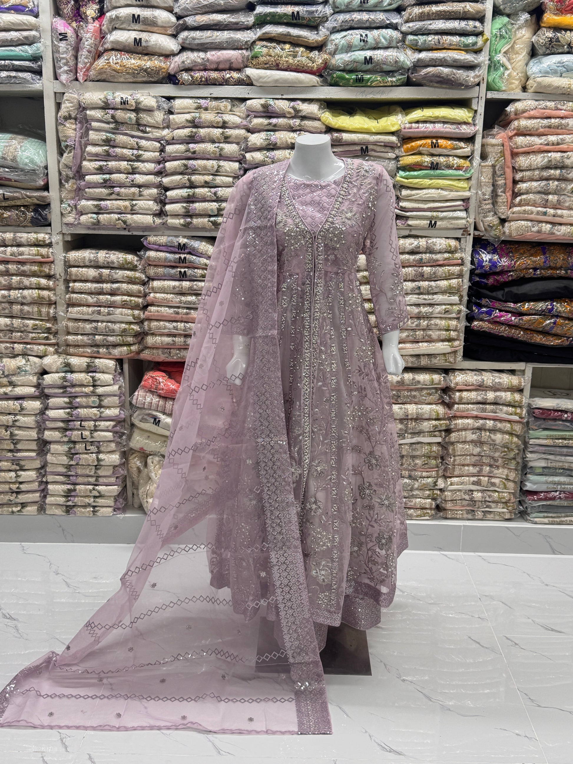 An open-gown style organza maxi, length approx. 58–60 inches, beautifully adorned with tilla, sequins, and delicate hand embellishments. Comes with a separate inner featuring attached embroidered lace detailed with thread and sequins, adding depth and luxury. Paired with grip trousers for a smooth, structured look and a finely embroidered organza dupatta for the perfect graceful finish.