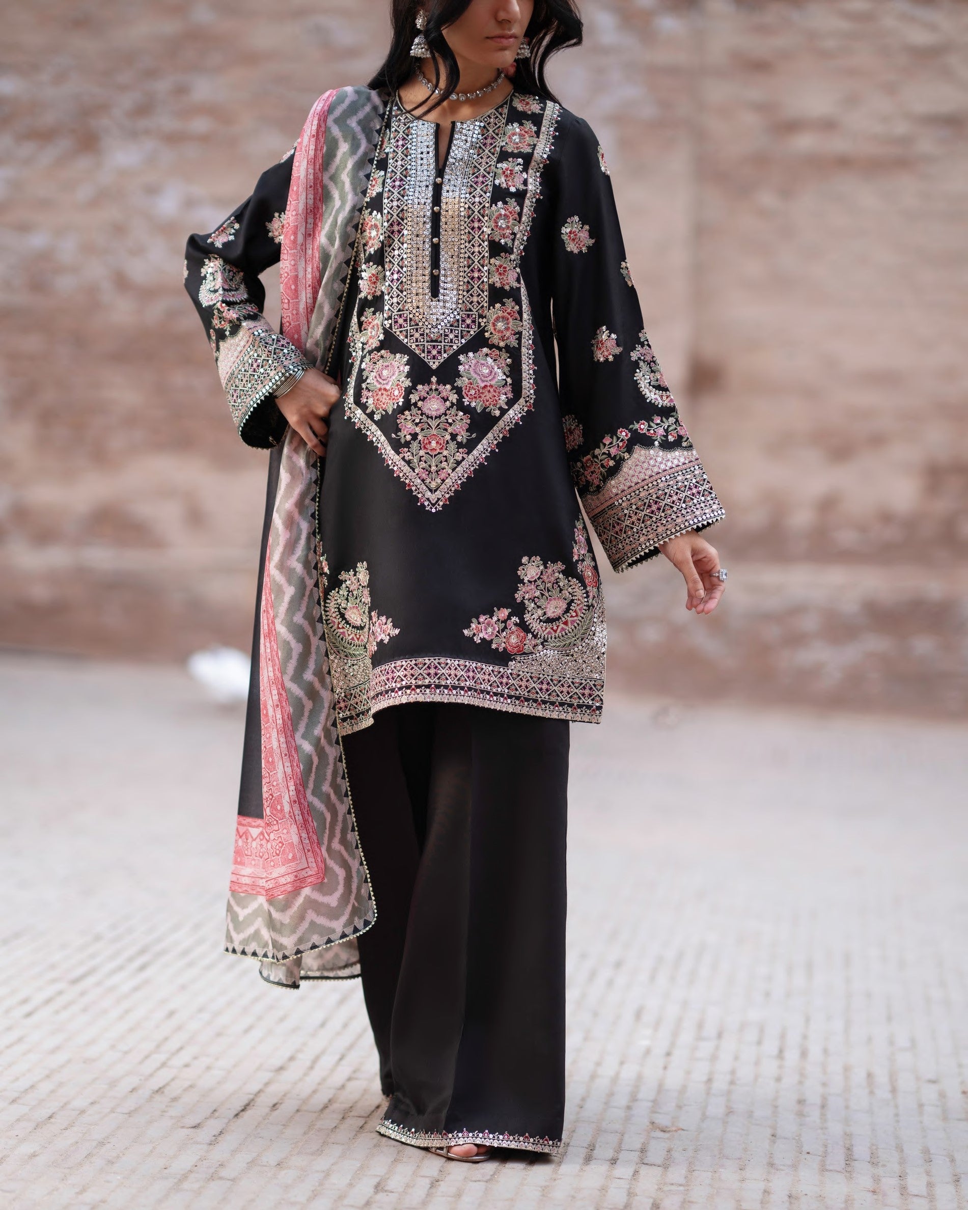 Dupatta: Viscose dupatta designed to fall softly, adding fluidity and understated sophistication.
