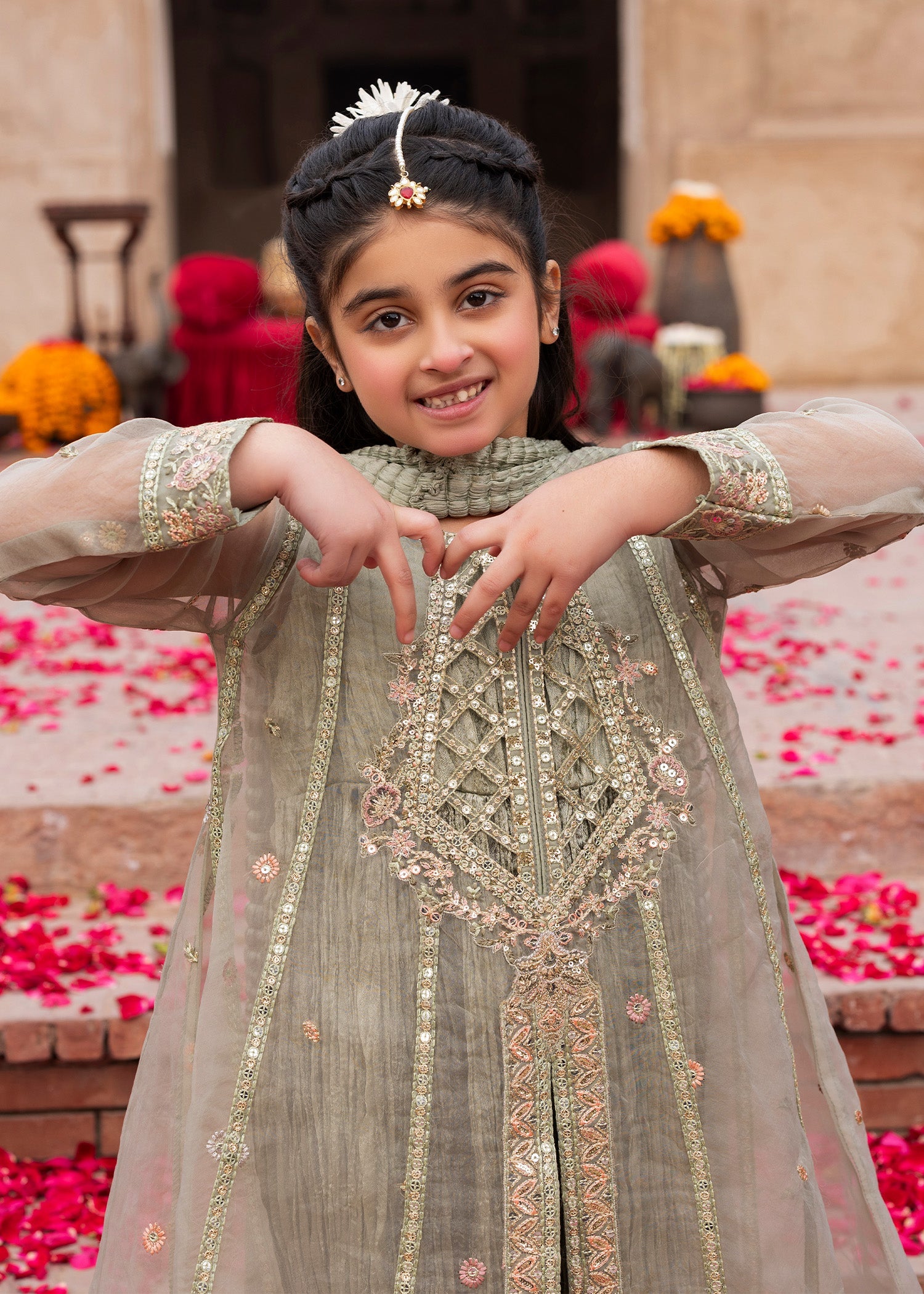 Step into graceful wedding elegance with this beautifully structured formal ensemble. Sheer organza layers and a flowing A-line silhouette create a look that feels refined, regal, and effortlessly luxurious. Perfect for all-season celebrations and guest wear.