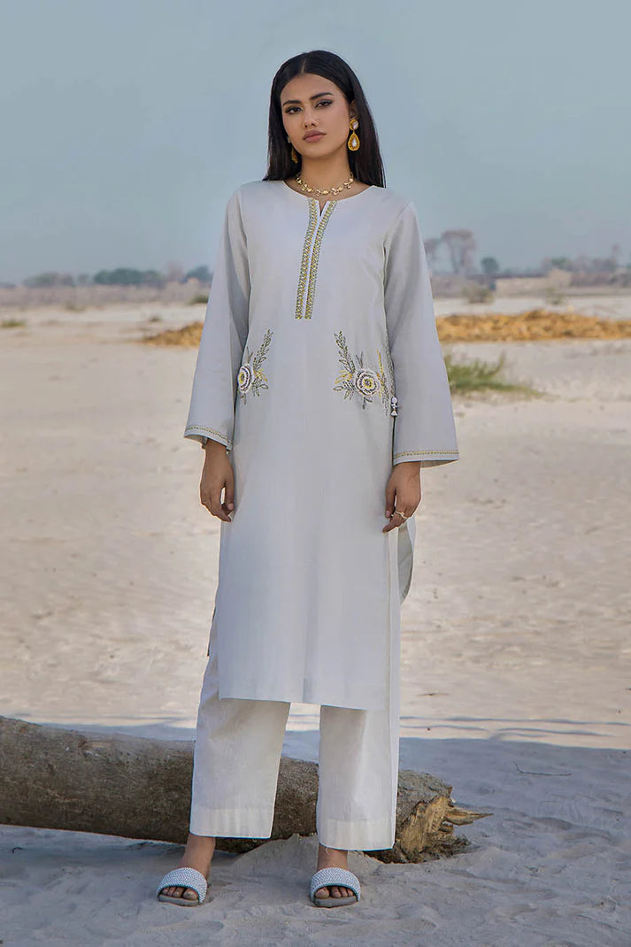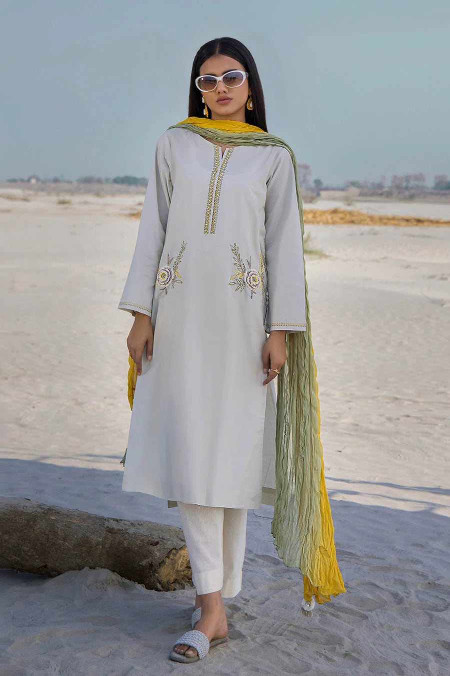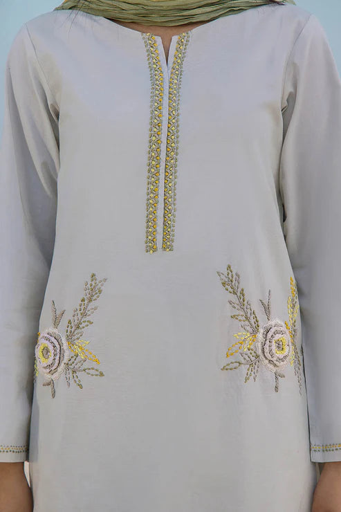 This timeless 3PC ready-to-wear ensemble features a 100% cotton shirt, beautifully hand embroidered for a classic yet refined appeal. The attached sleeves are made from the same fabric to keep the design cohesive. It’s paired with a flowing crinkle chiffon dupatta detailed with lace on the borders, and finished with 100% cotton trousers featuring an elasticized waistband for all-day ease.