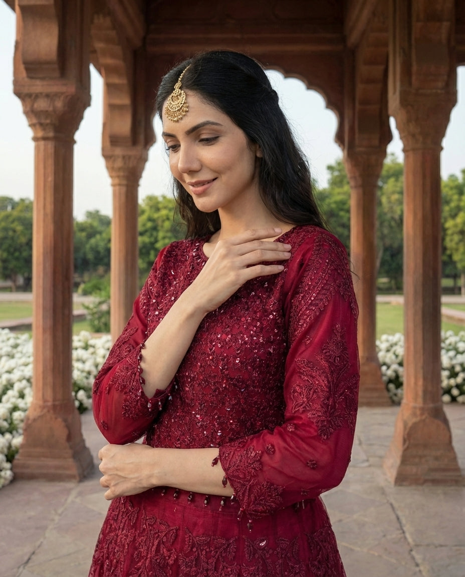 A breathtaking organza lehnga choli set designed for statement occasions. The blouse comes adorned with thread, sequins, and playful tussels at the hem for a chic finish. The flowing organza lehnga carries thread and sequin embroidery, creating a rich and graceful appeal. Paired with an organza dupatta edged with four-sided lace, this ensemble blends traditional artistry with modern elegance.