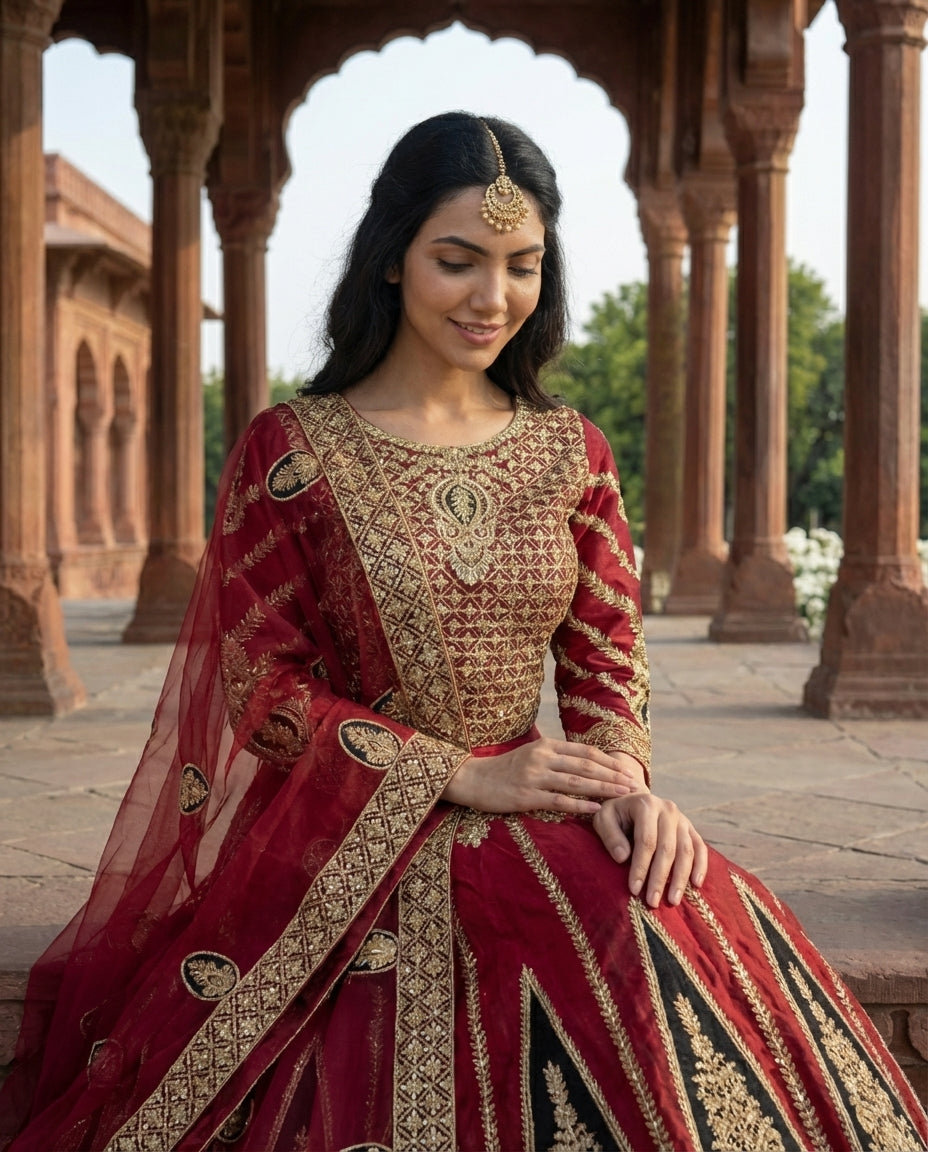 Lehnga: Organza lehnga featuring velvet patches and sequin work, offering a rich and graceful silhouette.