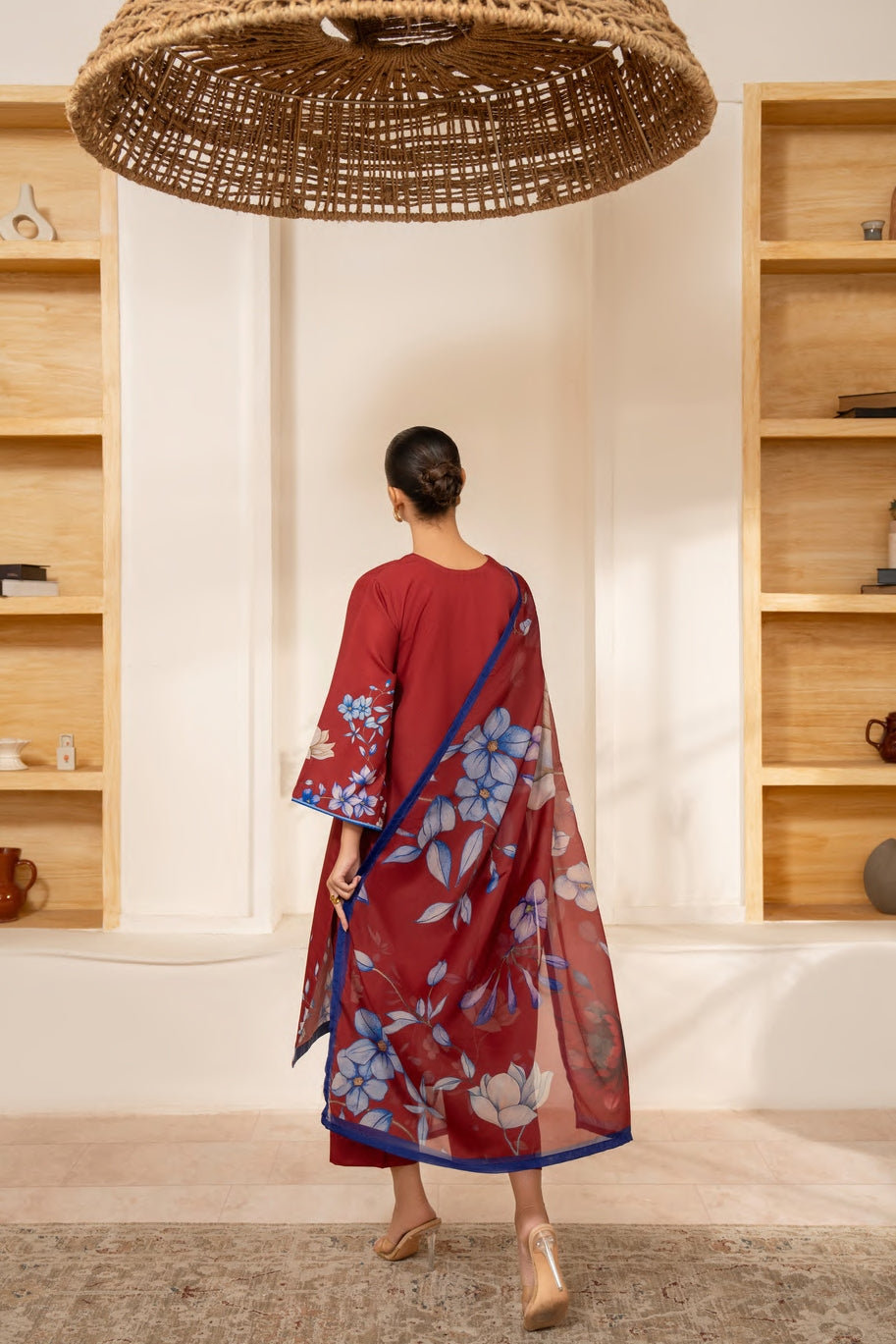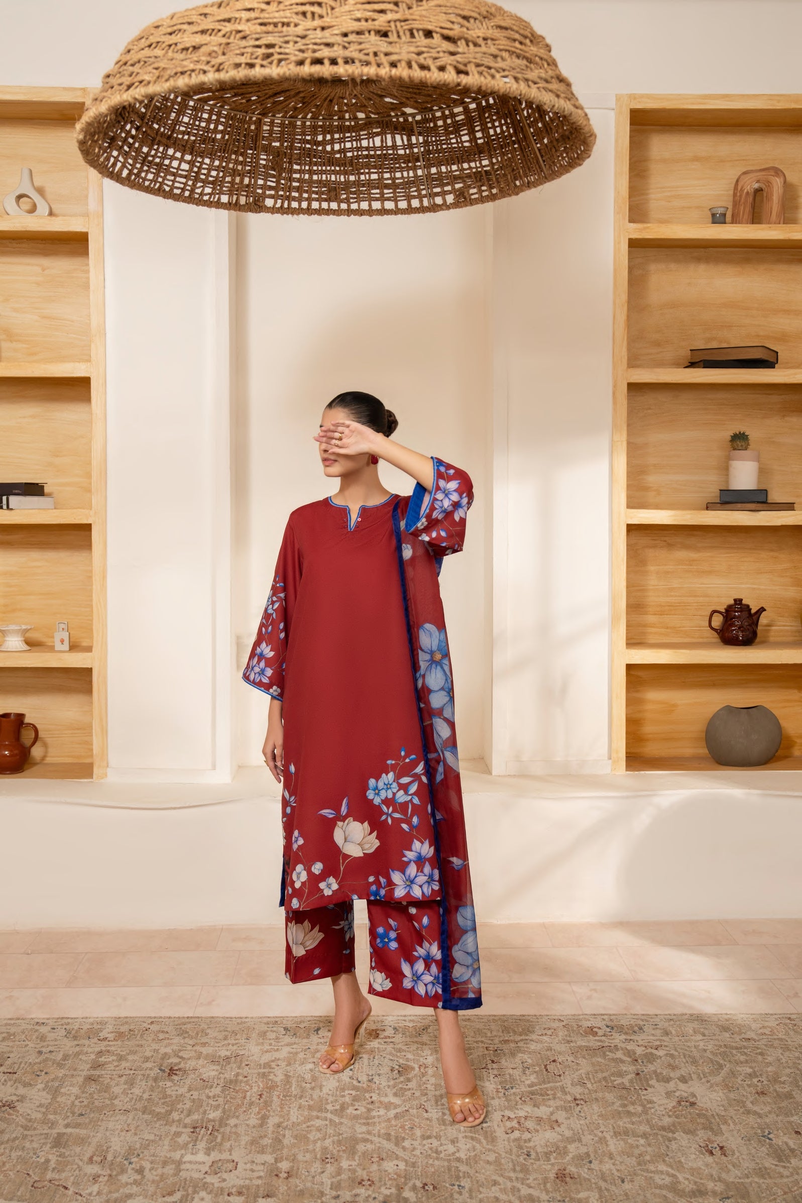 The kurta and wide-legged pants bloom with enchanting floral prints in soft lilac, cherry blossom, and gentle greens, bringing a refreshing yet graceful charm. Crafted from premium viscose silk, this ensemble flows effortlessly with elegance, making it perfect for both casual and formal gatherings.
