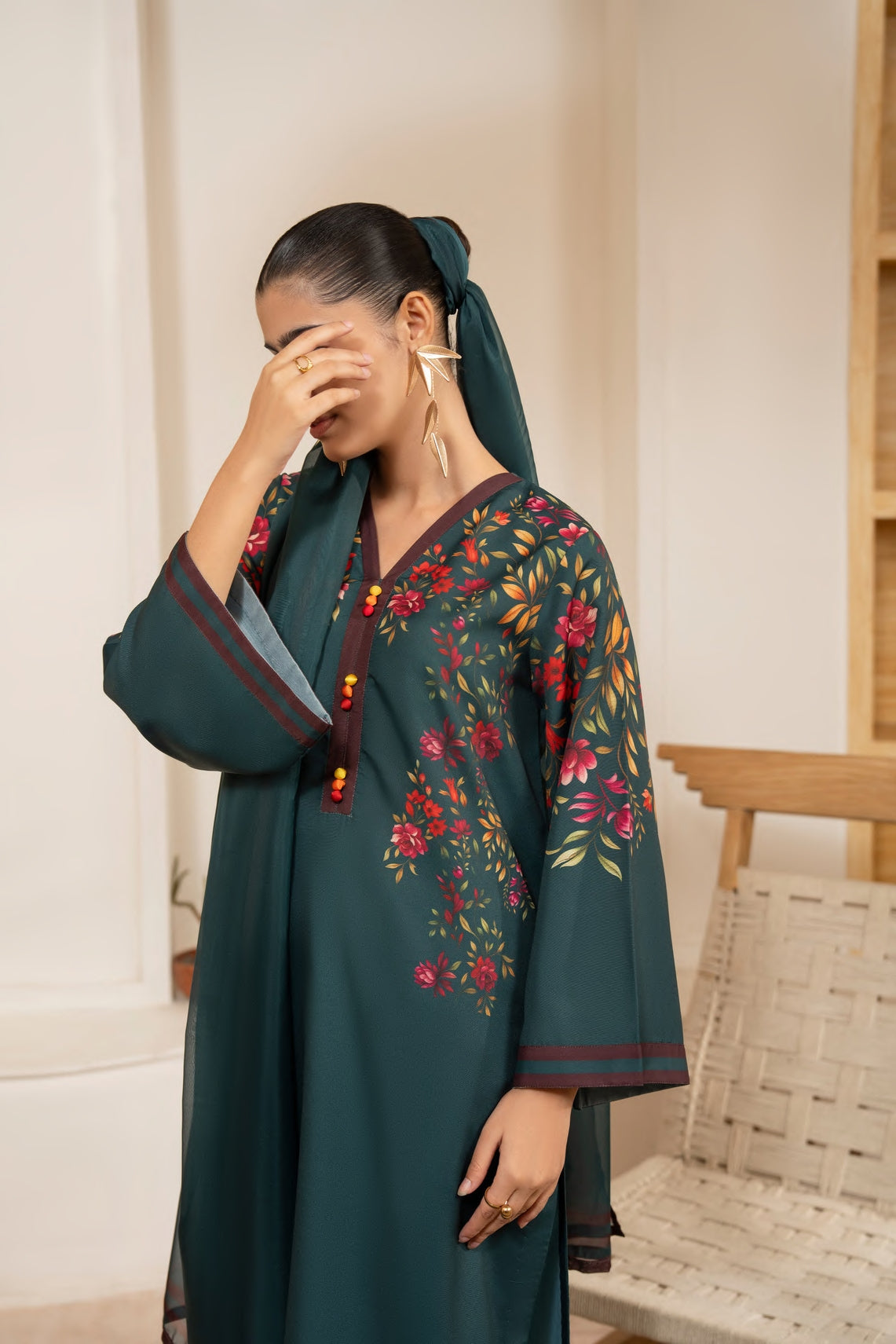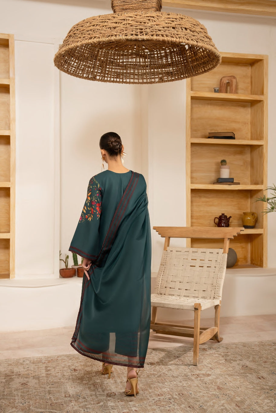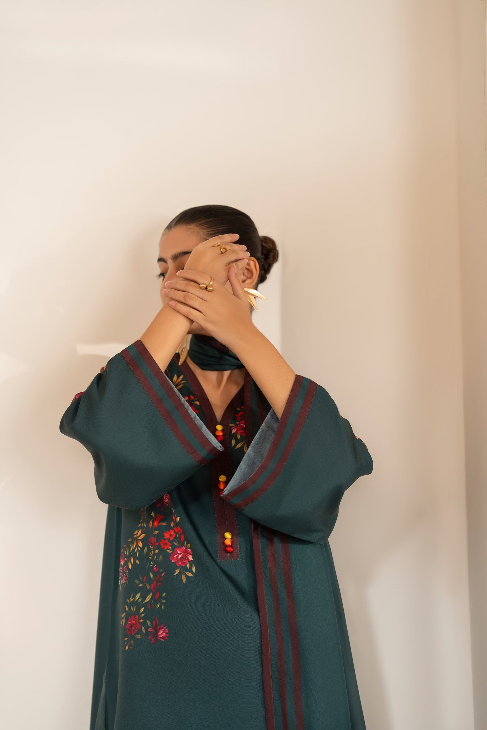The kurta and wide-legged pants bloom with enchanting floral prints in soft lilac, cherry blossom, and gentle greens, bringing a refreshing yet graceful charm. Crafted from premium viscose silk, this ensemble flows effortlessly with elegance, making it perfect for both casual and formal gatherings.