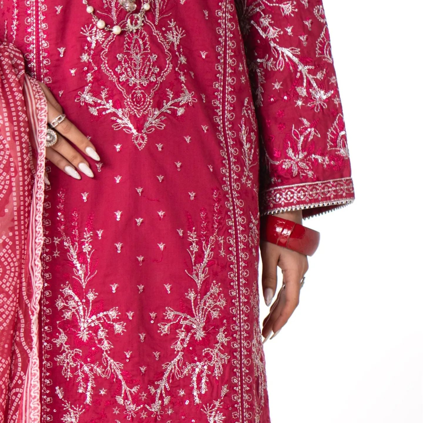 Upgrade your summer wardrobe with Gul Posh. This 3-piece ready-to-wear set includes a long cotton shirt, chiffon dupatta, and cotton trousers. The intricate embroidered thread, tilla, sequence, and chickenkari work adds a touch of elegance to your look. Look and feel comfortable and stylish at the same time.