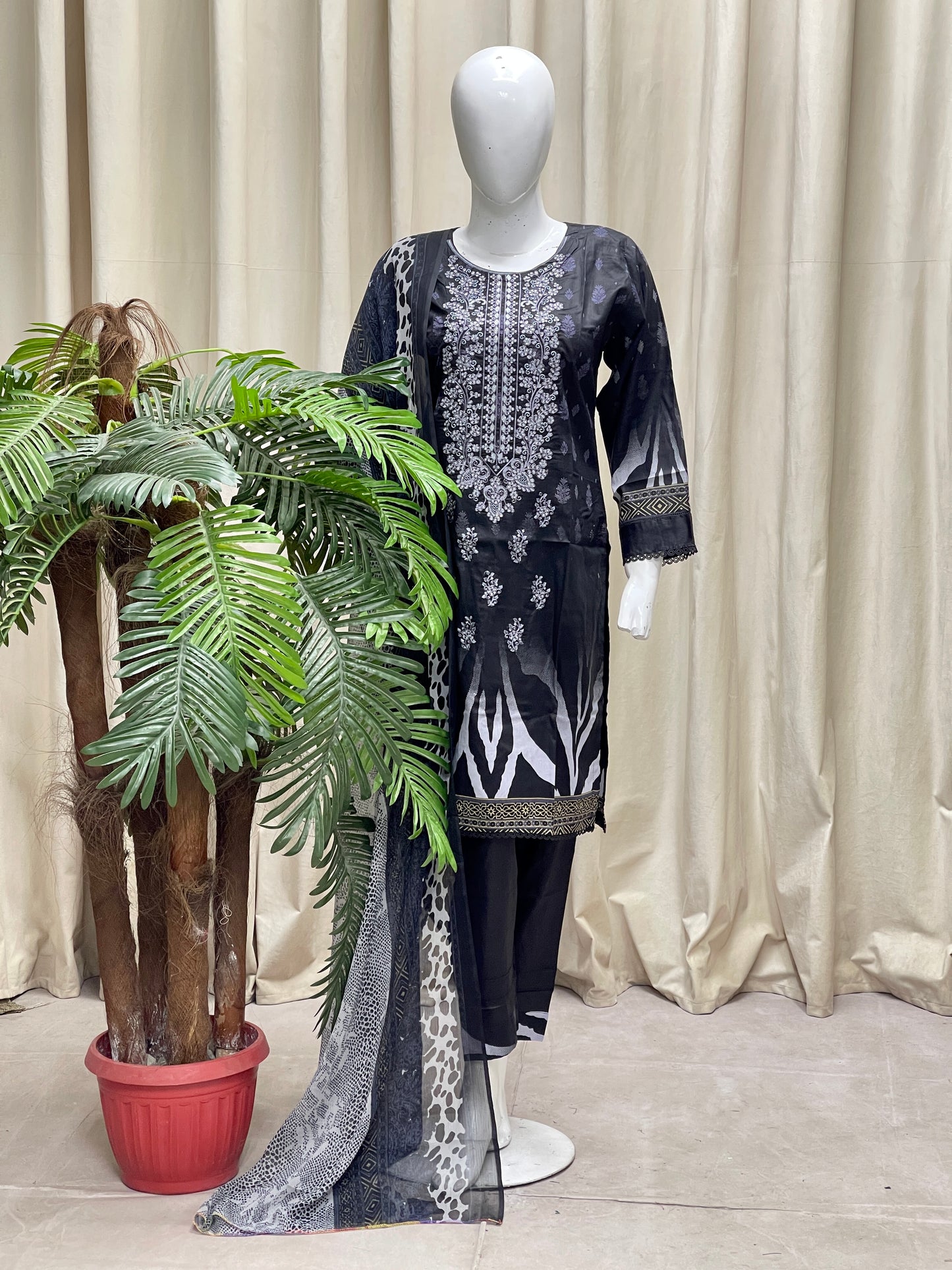 Dress to impress with the HM Lawn Chiffon Dupatta 215 Black. This 3PC ready-to-wear outfit includes a shirt, trouser, and dupatta, all made with high-quality lawn fabric. Perfect for any occasion, this ensemble will make you stand out with its elegant design and comfortable fit.