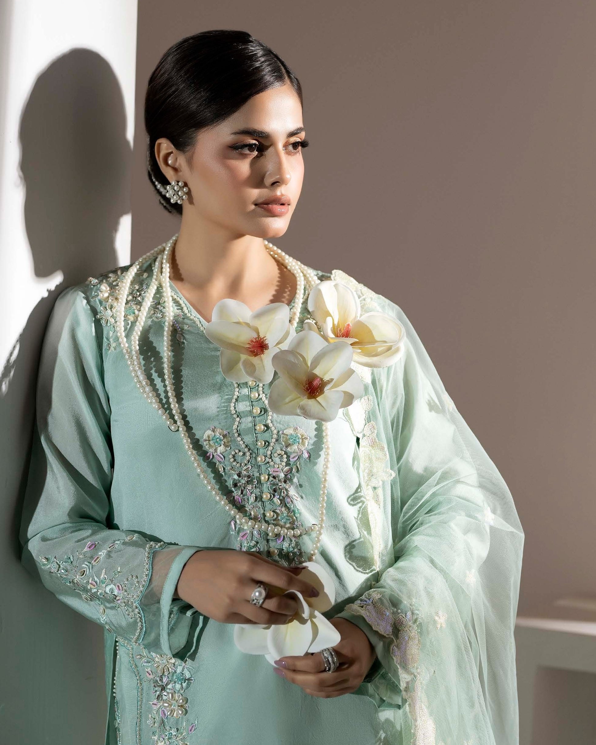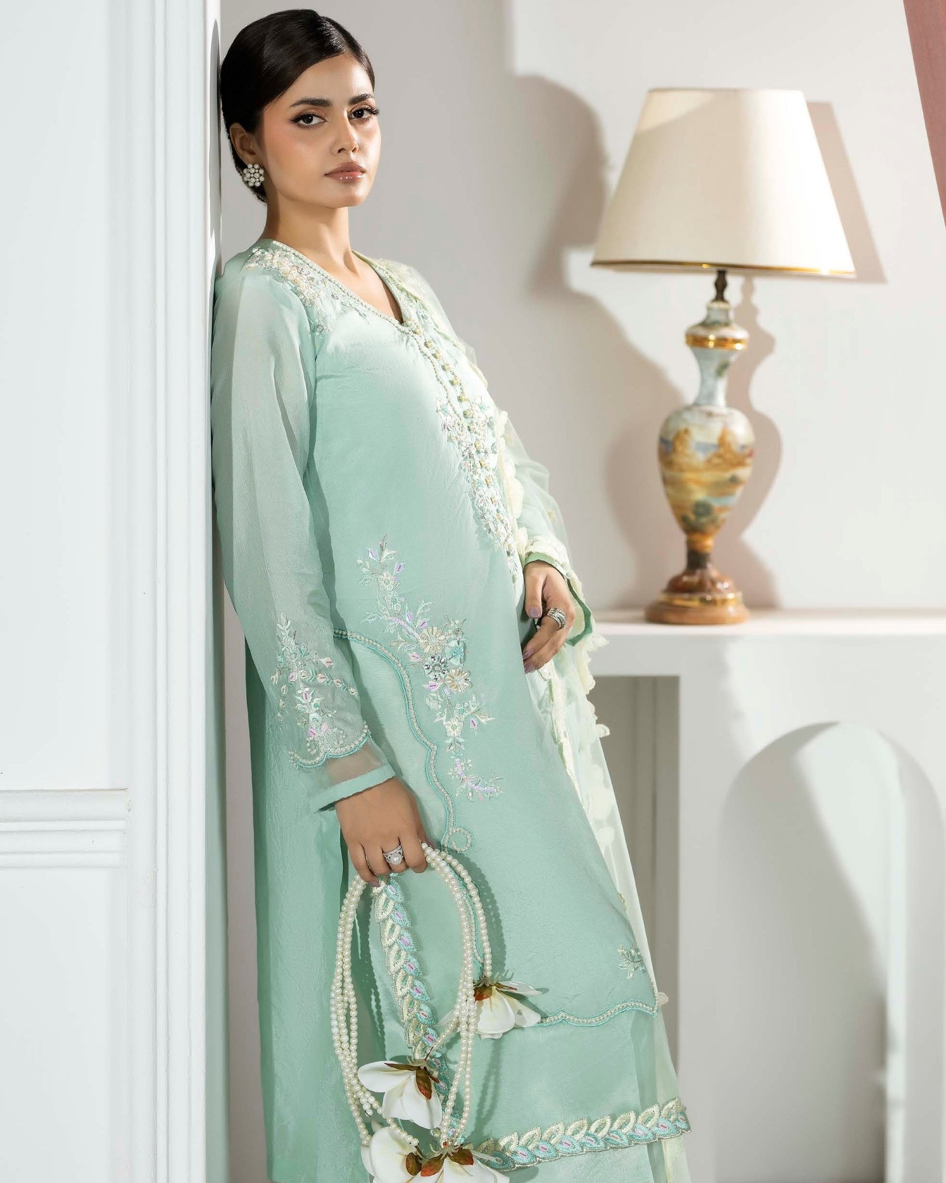 Shirt: Short shisha silk shirt adorned with thread, sequin, and pearl settings, offering a rich and elegant finish.
