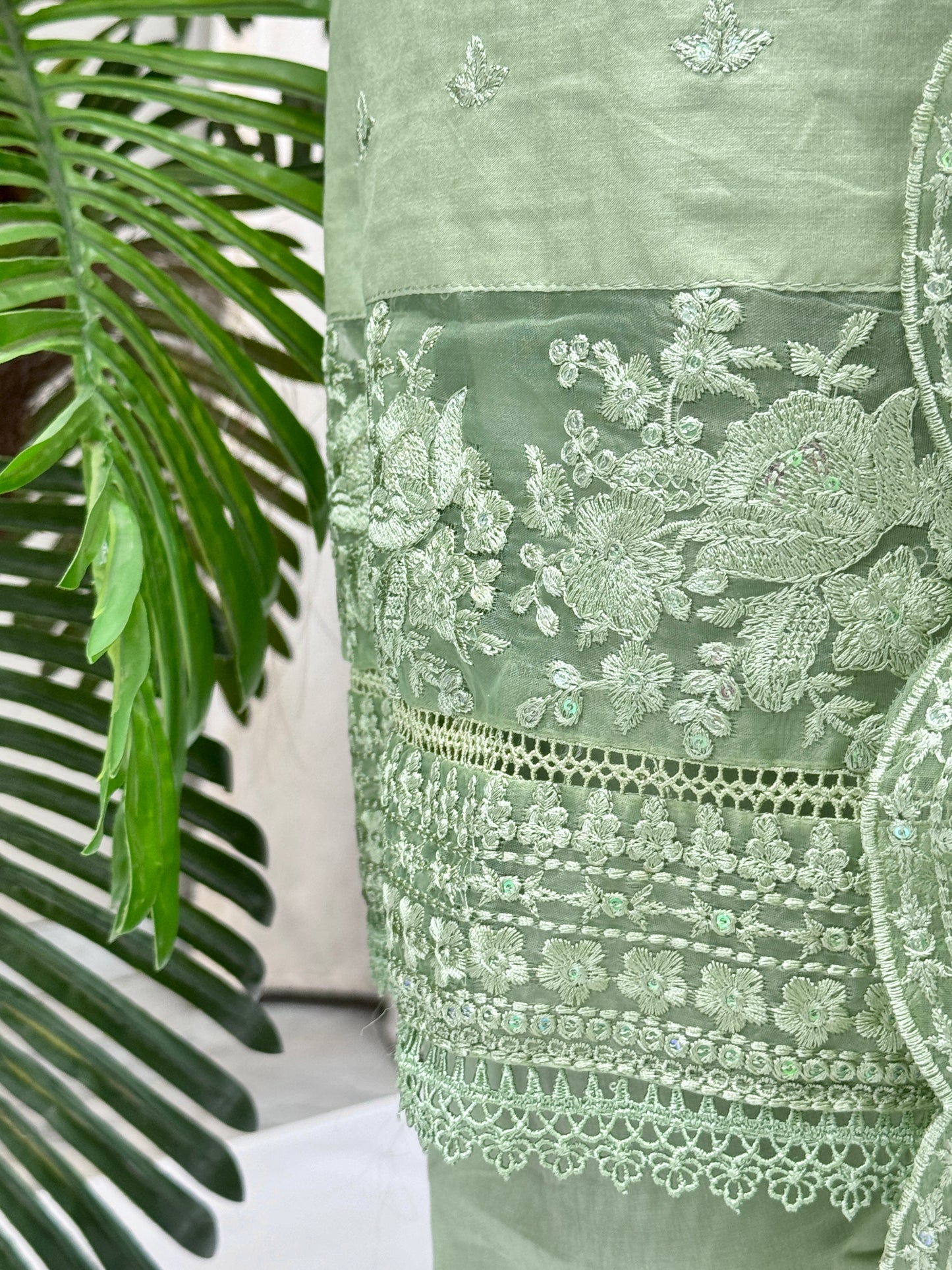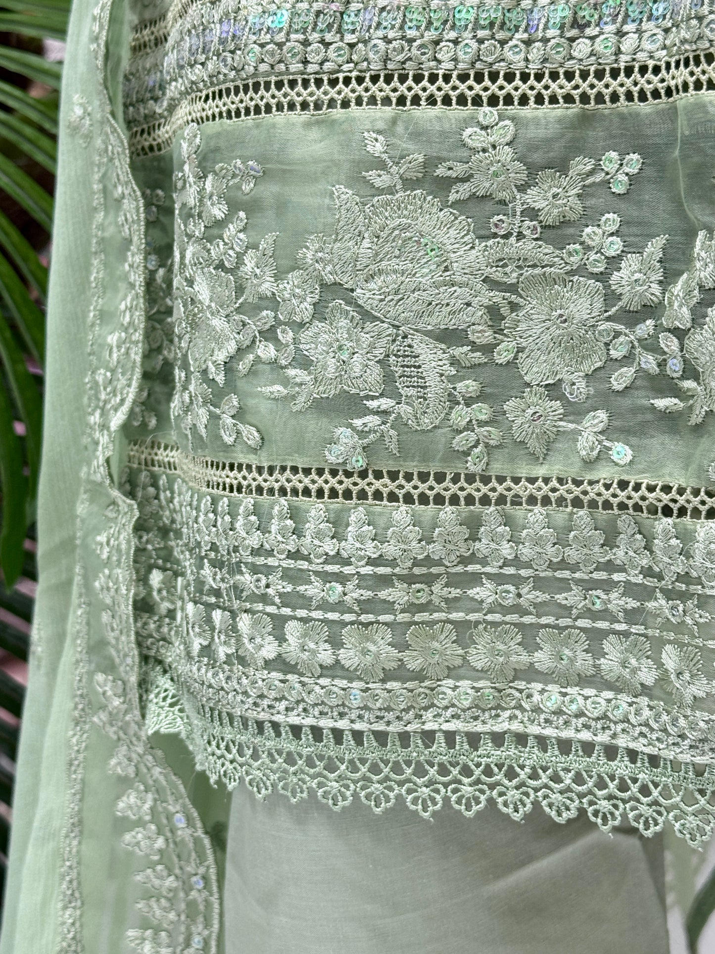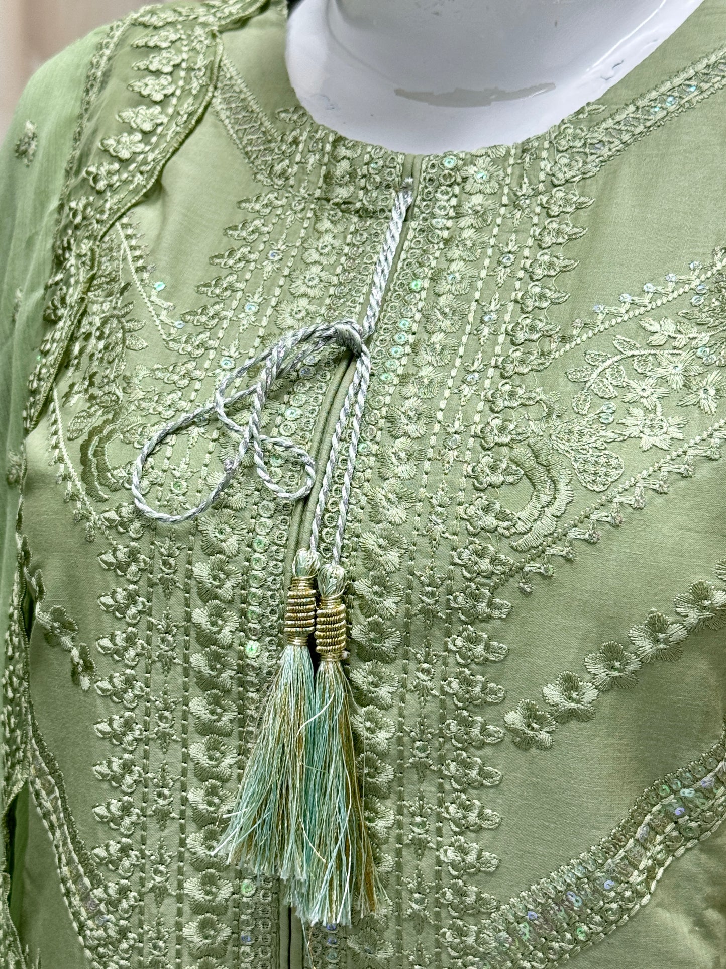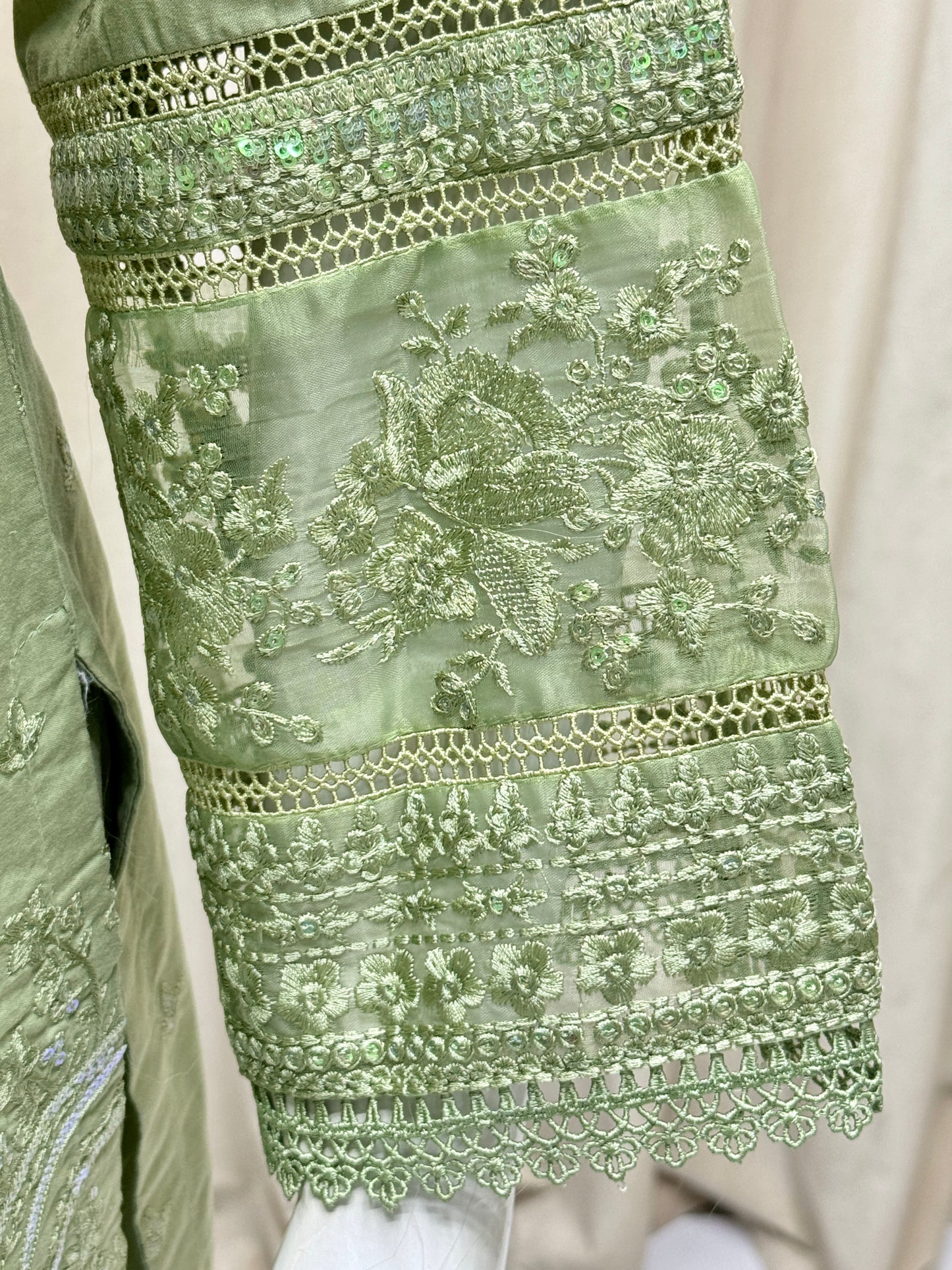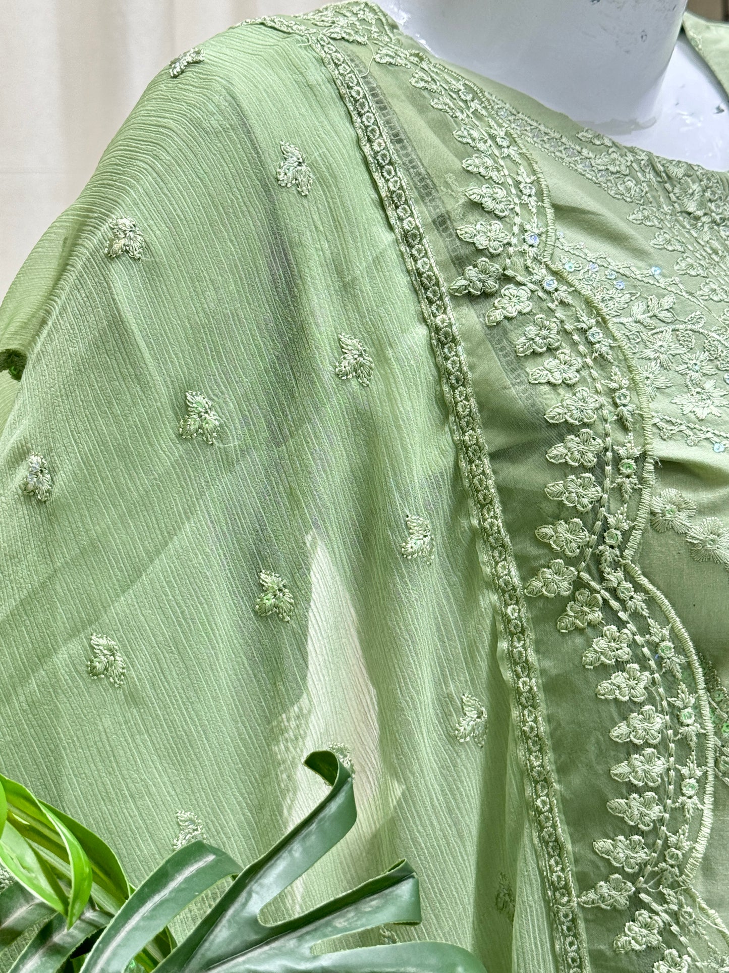 Elevate your style with SH Collection's 3PC READY TO WEAR set, including a Cotton Cutline Shirt, Chiffon Dupatta, and Cotton Trouser. Look effortlessly chic in comfortable fabrics that are perfect for any occasion. Upgrade your wardrobe with Karma 1323 Cotton Pista By SH.