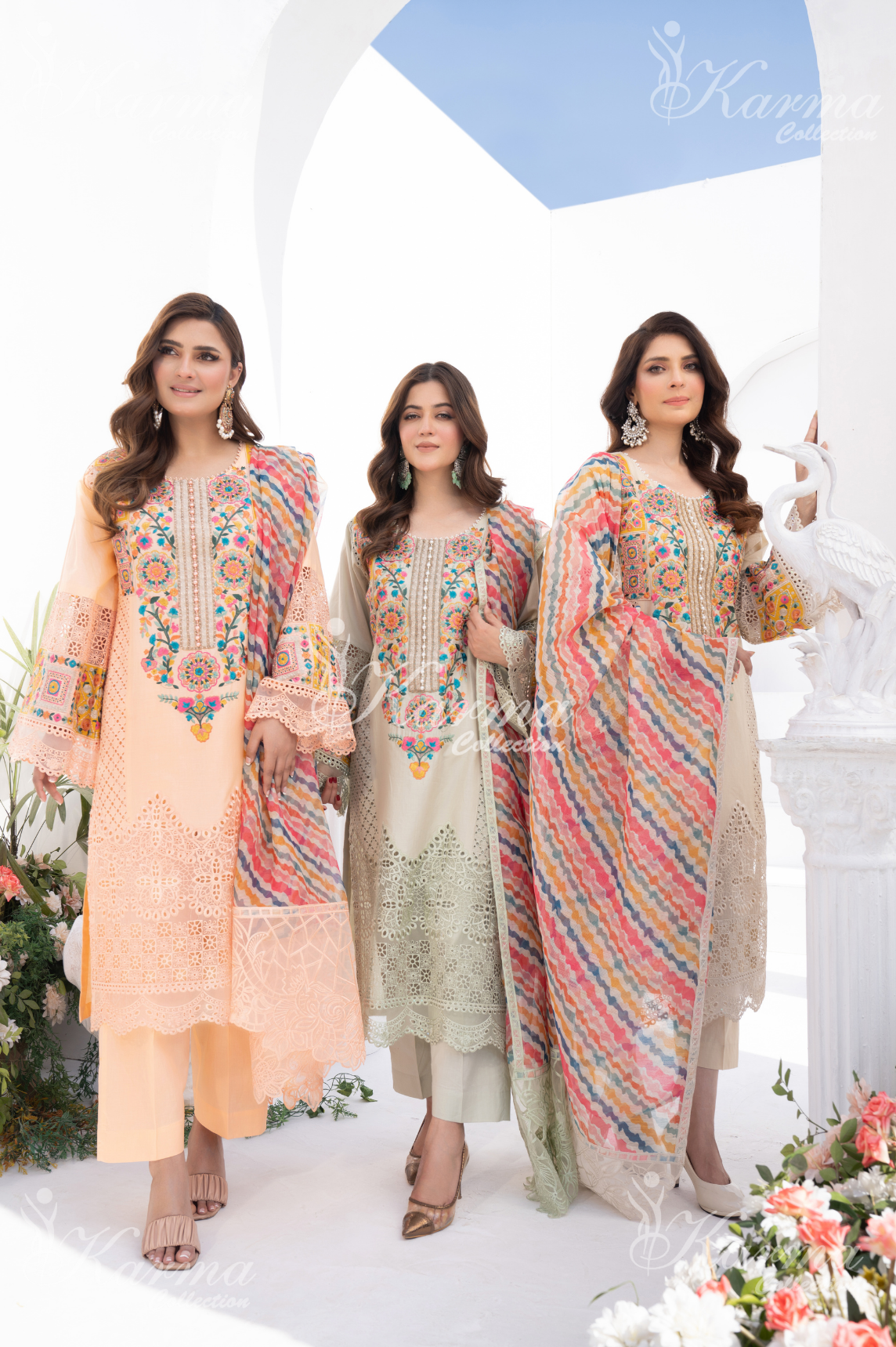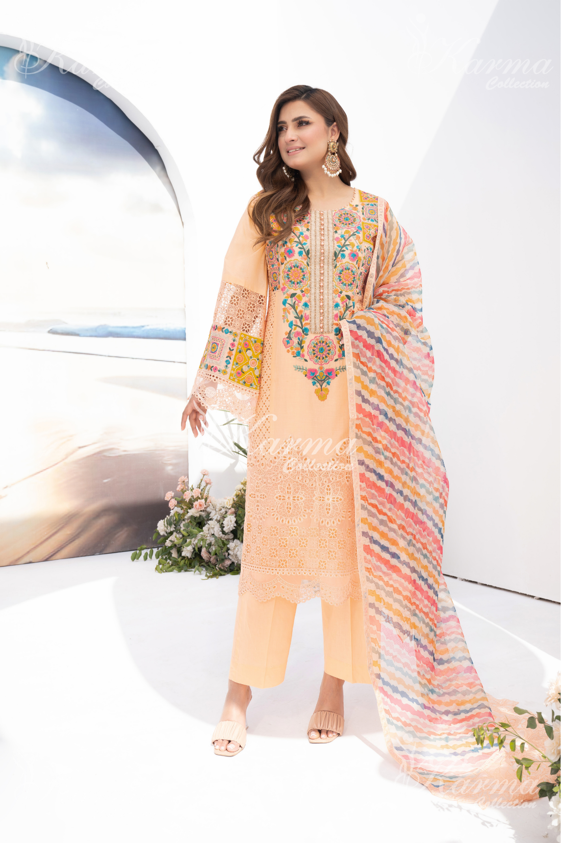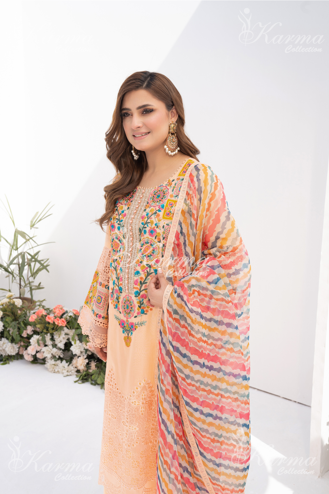 Enhance your wardrobe with the Karma 1332 Orange set. Cotton shirt, printed dupatta, and cotton trouser create a comfortable and stylish ensemble. With full Chikan Kari and beautiful embroidery, this 3PC Ready To Wear set is sure to make you stand out.
