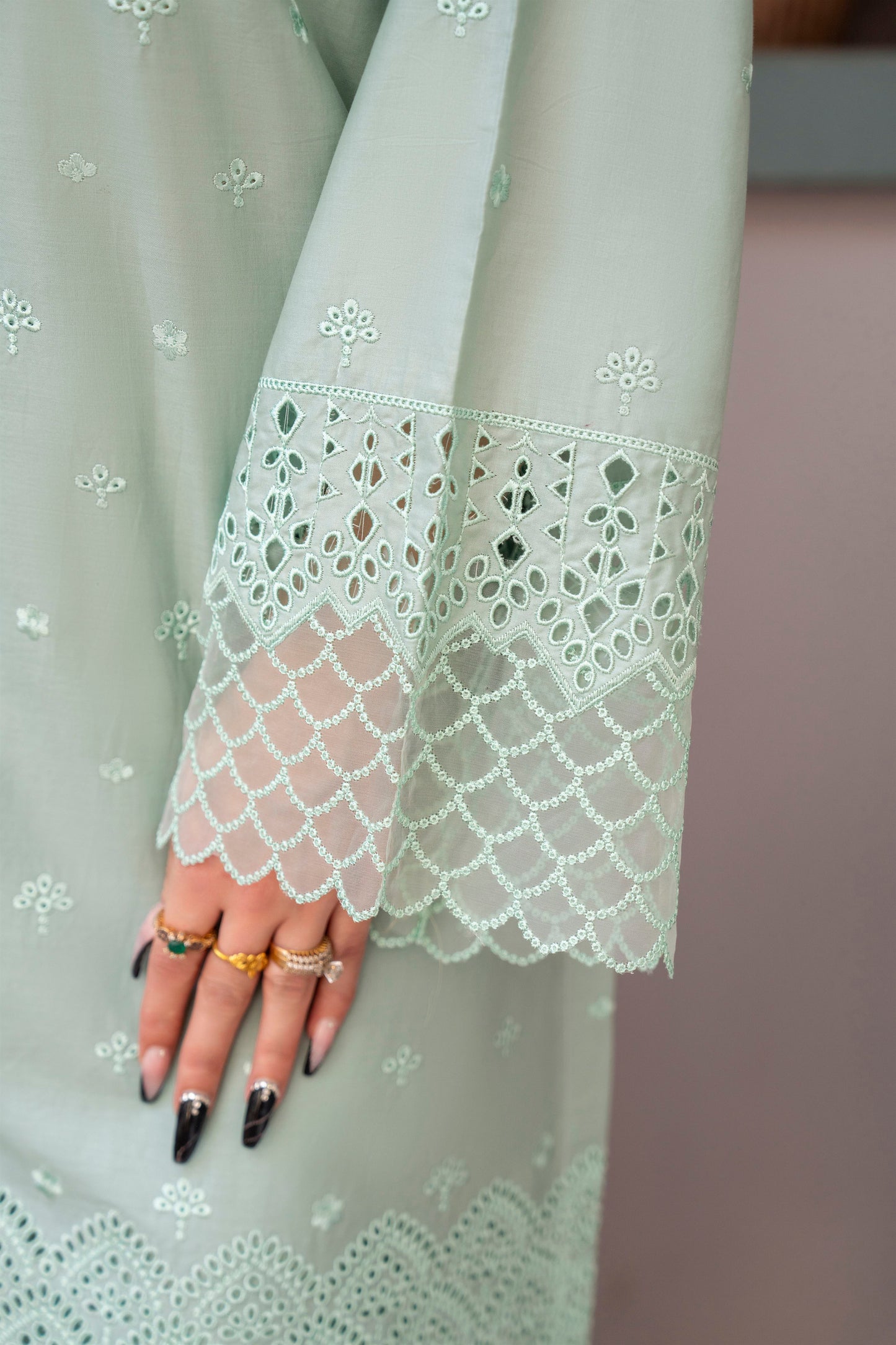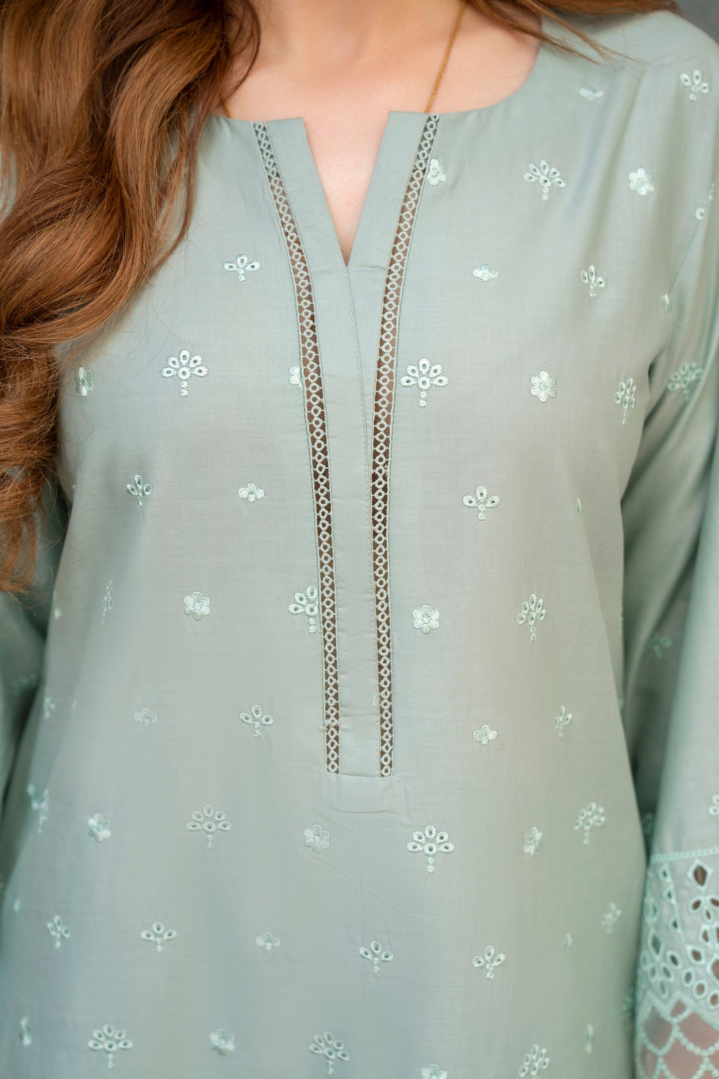 Long Shirt: Cotton Lawn Chikenkari with Multi Embroidery and Laces.