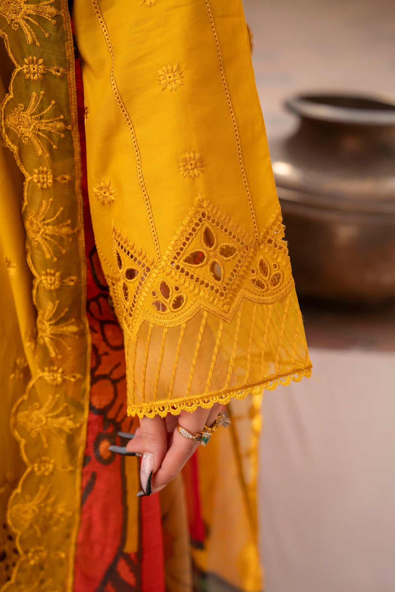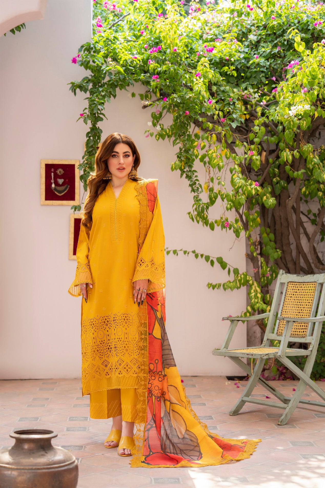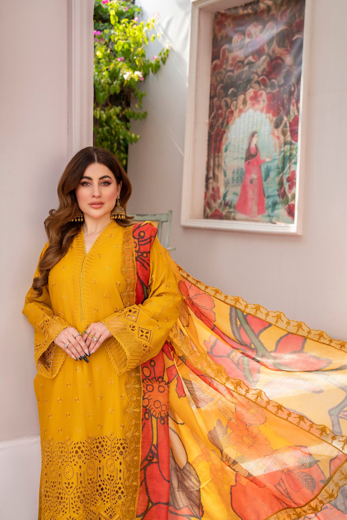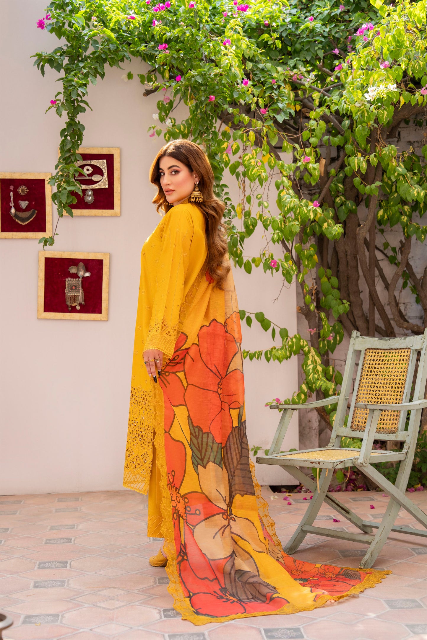 Experience effortless style with Karma 3PC READY TO WEAR. The long shirt boasts delicate Cotton Lawn Chikenkari, adorned with multi embroidery and laces. Paired with a Khaddi Lawn printed and embroidered dupatta and comfortable cotton lawn trouser, this ensemble exudes elegance.
