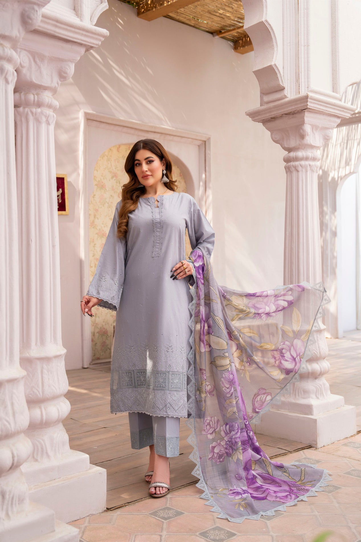Experience effortless style with Karma 3PC READY TO WEAR. The long shirt boasts delicate Cotton Lawn Chikenkari, adorned with multi embroidery and laces. Paired with a Khaddi Lawn printed and embroidered dupatta and comfortable cotton lawn trouser, this ensemble exudes elegance.