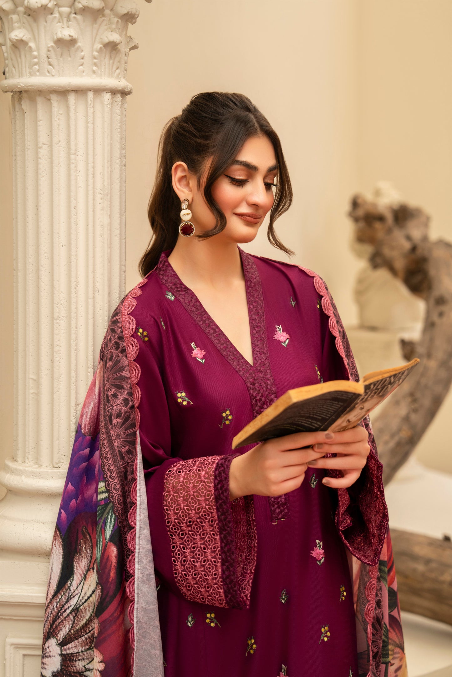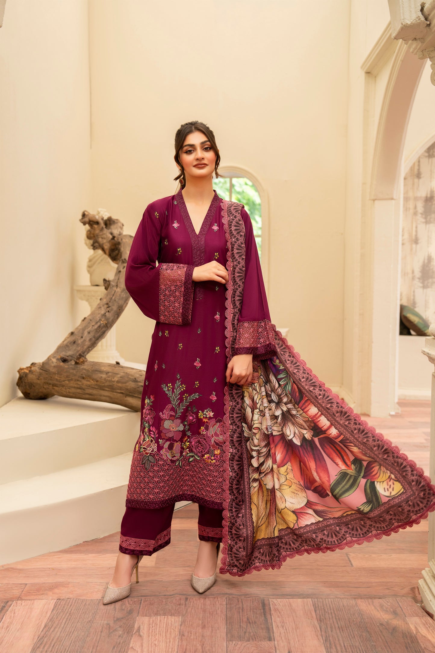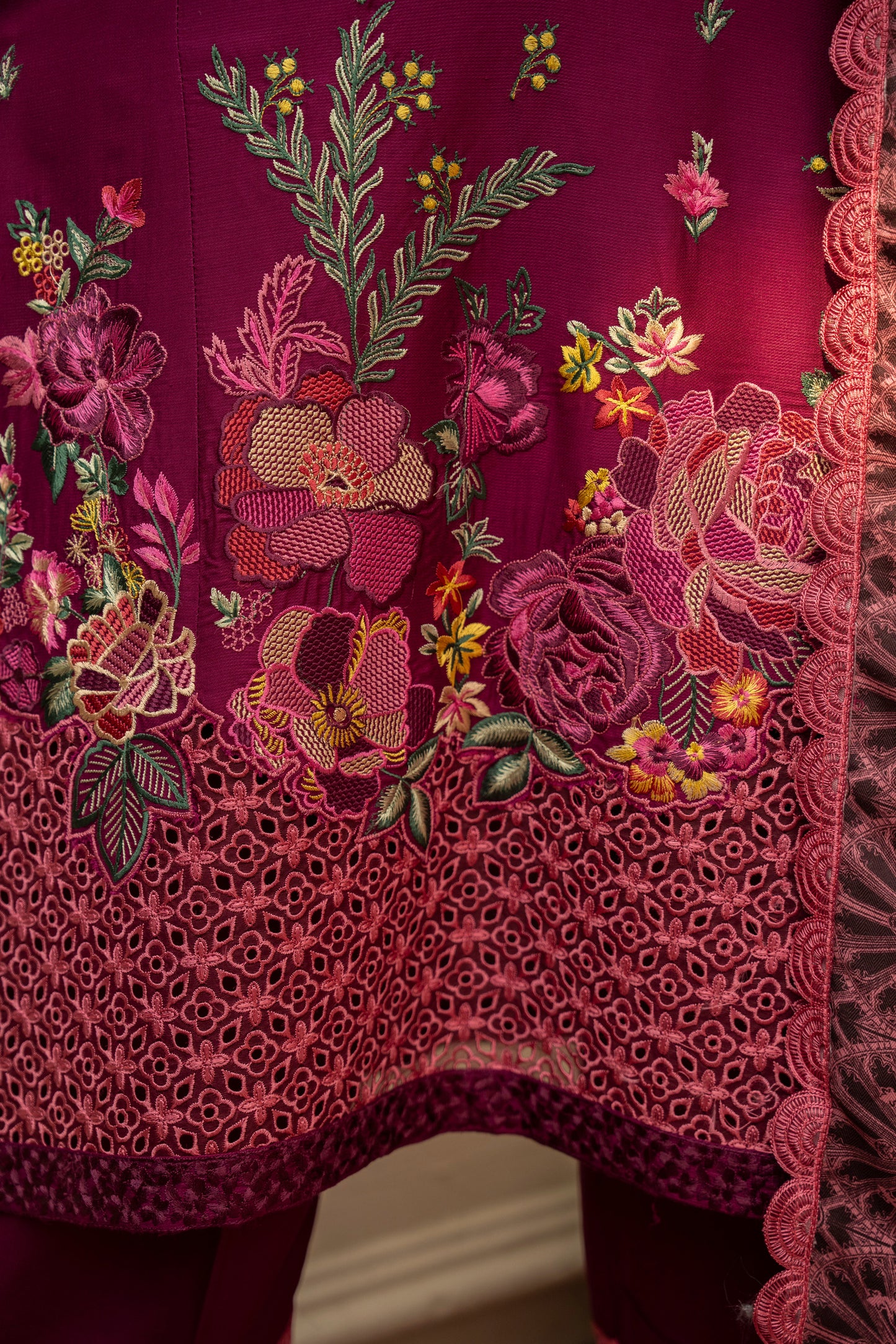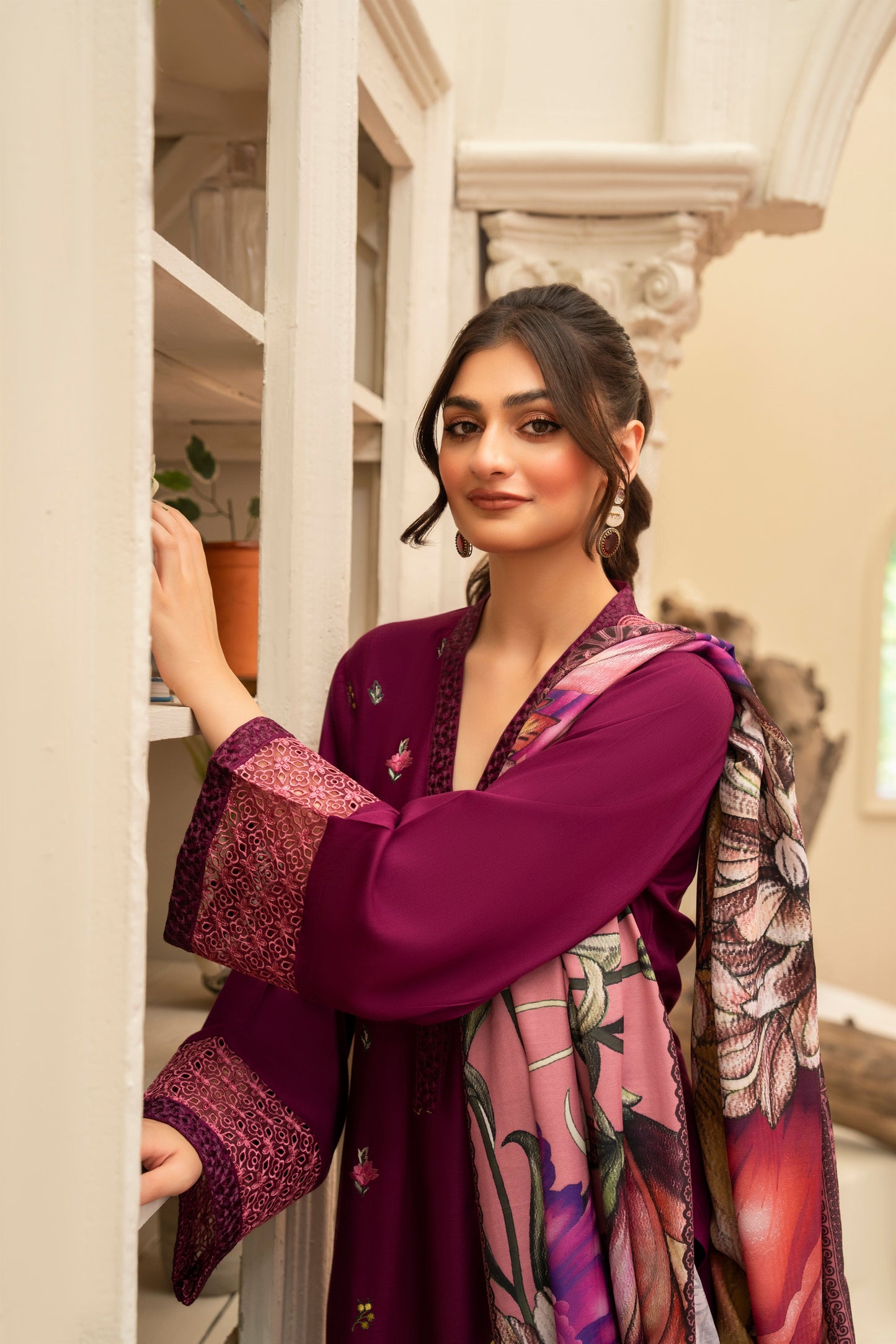This ready-to-wear ensemble features a long shirt, dupatta, and trousers, all made with high-quality wale fabric. The multi-thread Chiken kari sleeves and embroidered front add a touch of elegance, while the dizzling printed dupatta brings a vivid pop of color. Elevate your wardrobe with this aspirational piece.