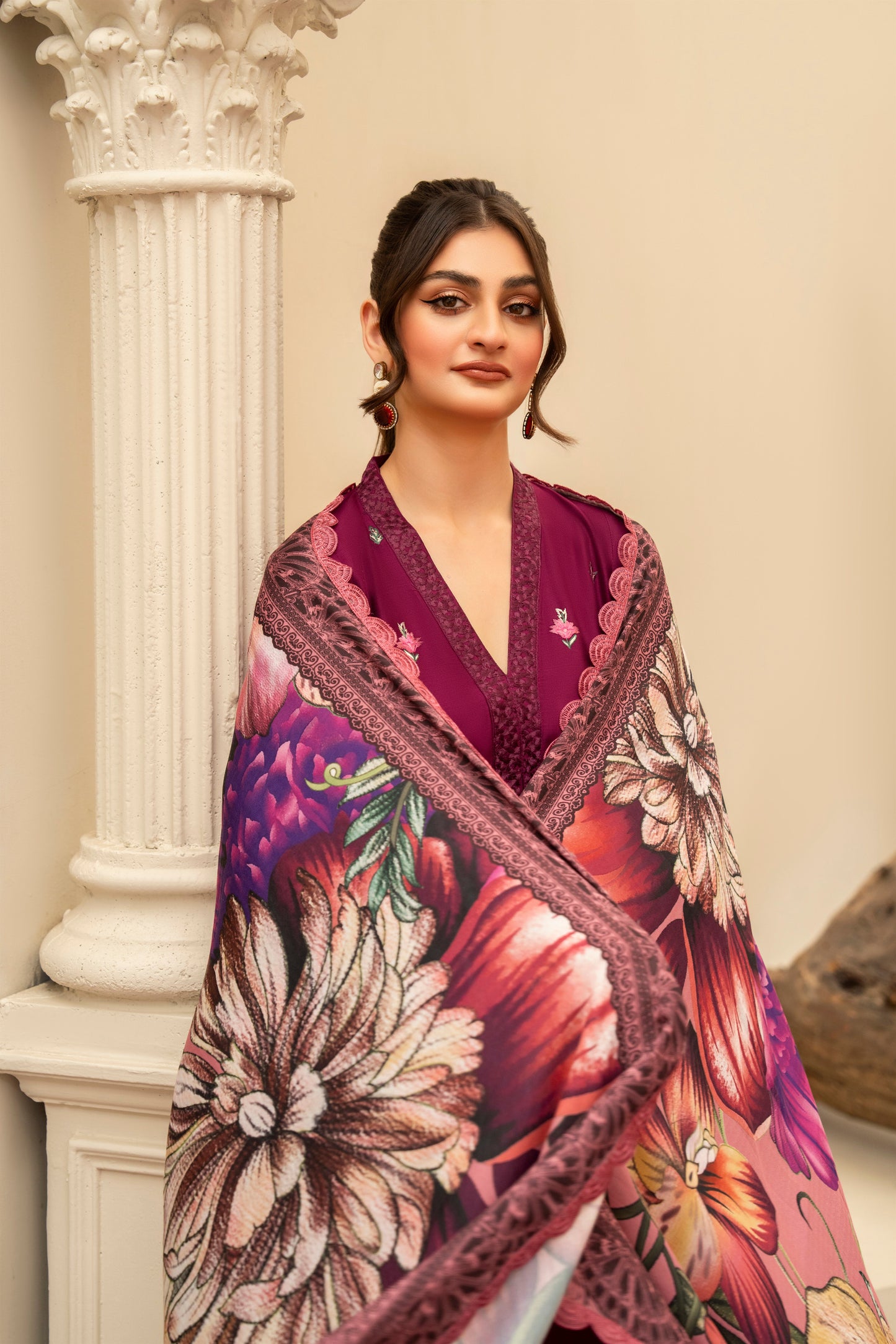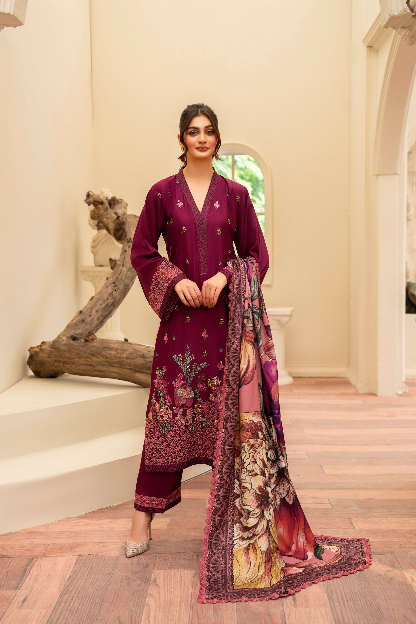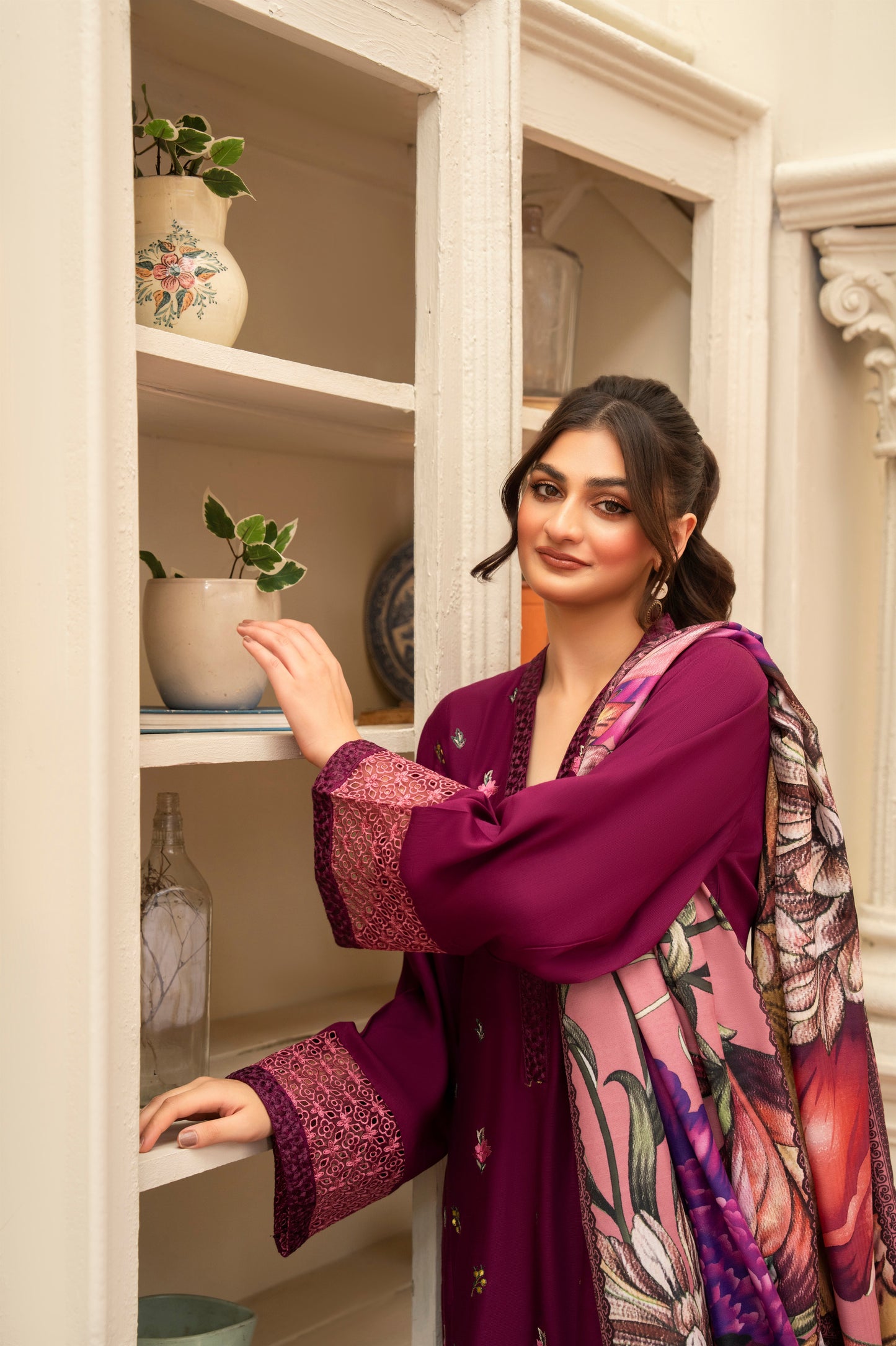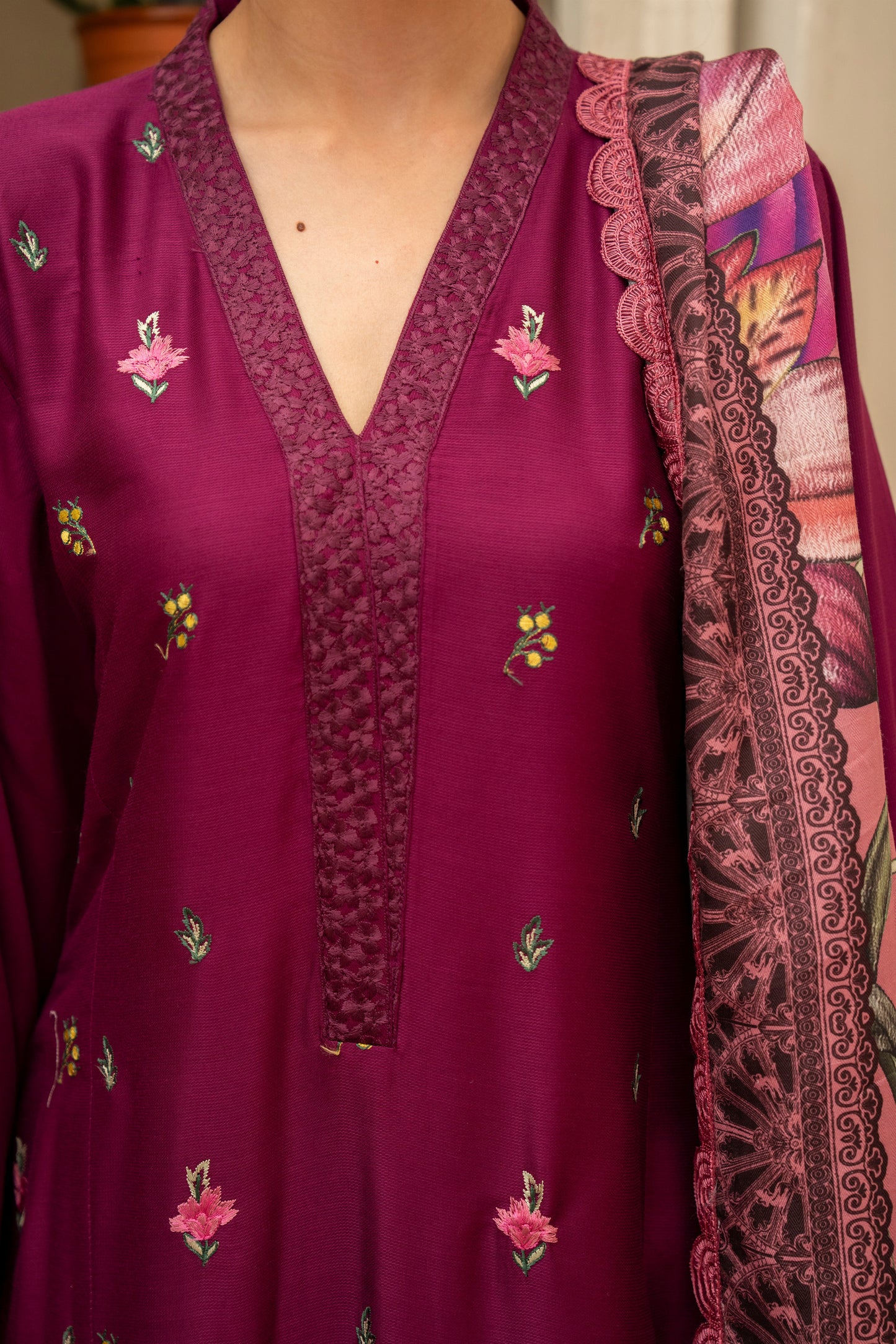 This ready-to-wear ensemble features a long shirt, dupatta, and trousers, all made with high-quality wale fabric. The multi-thread Chiken kari sleeves and embroidered front add a touch of elegance, while the dizzling printed dupatta brings a vivid pop of color. Elevate your wardrobe with this aspirational piece.
