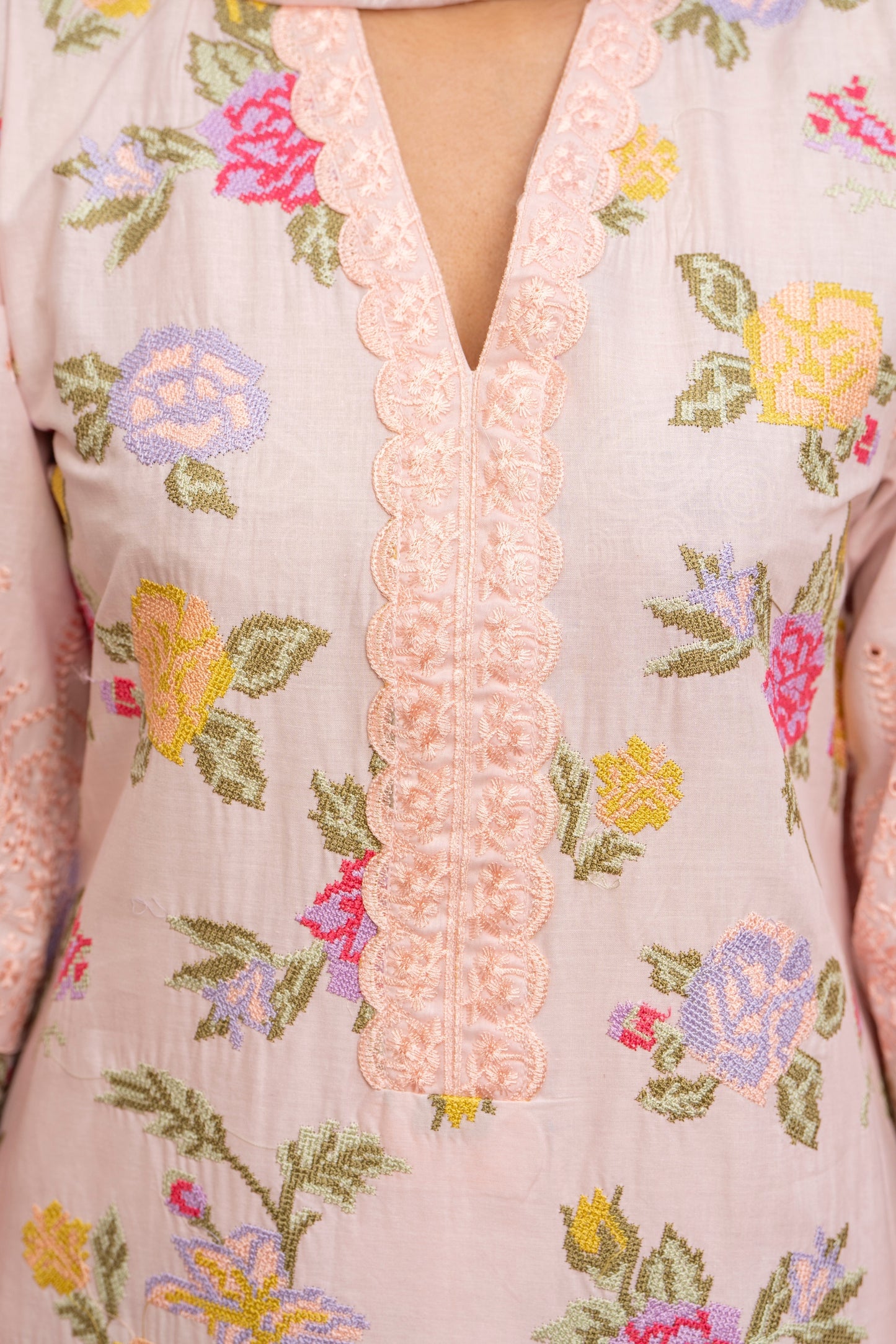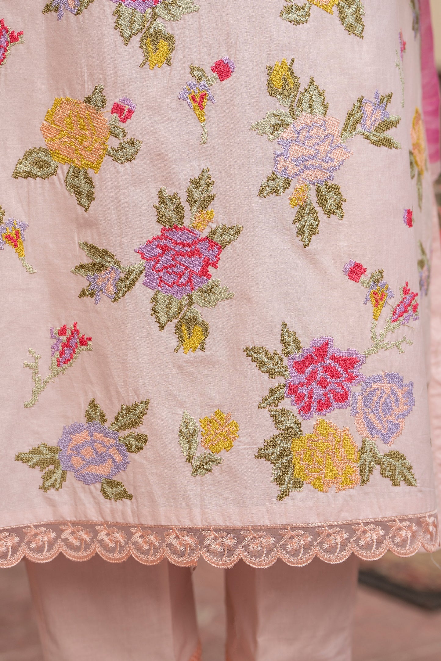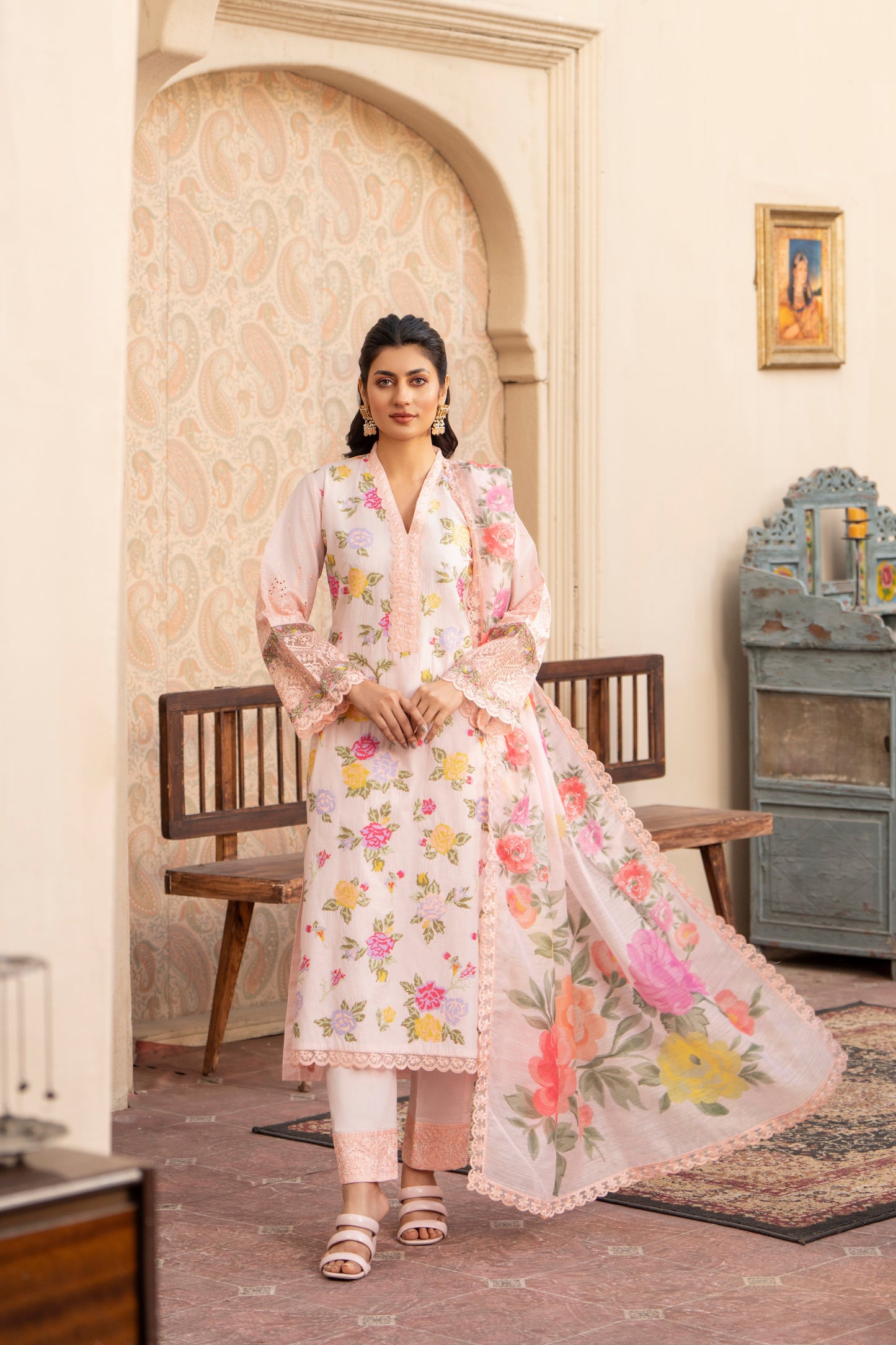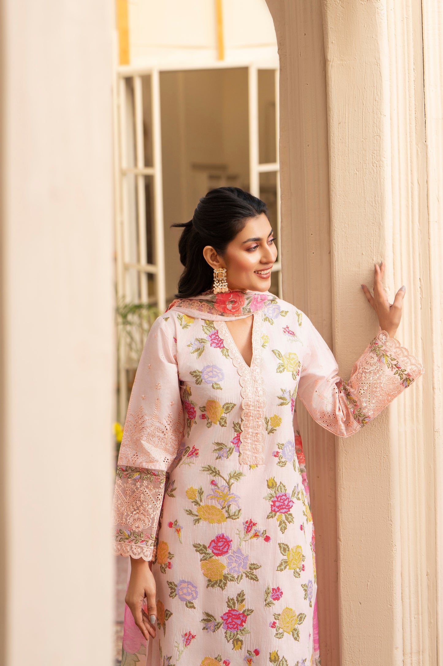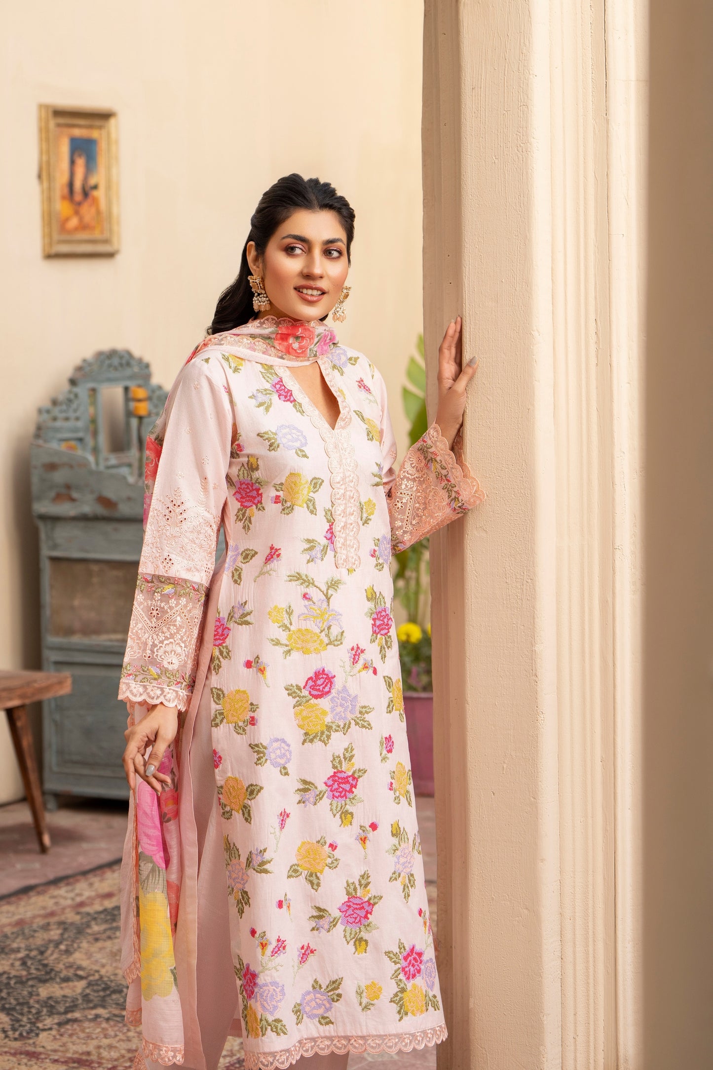 Expertly designed for a polished look,3PC ready-to-wear set featuring a shirt in lawn multi-embroidery, a dupatta in printed khaddi lawm, and a cotton trouser. Effortlessly stylish and versatile, perfect for any occasion.