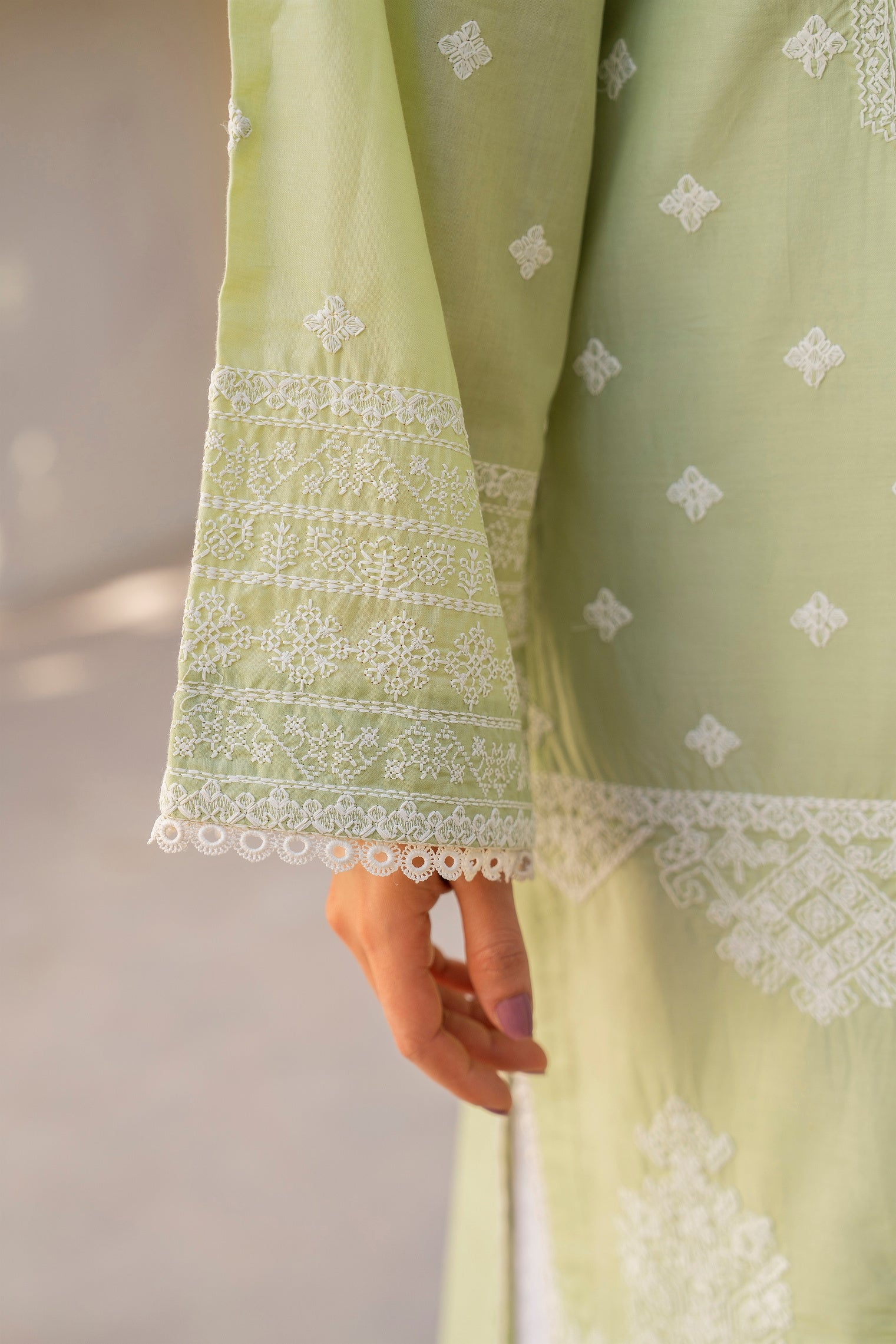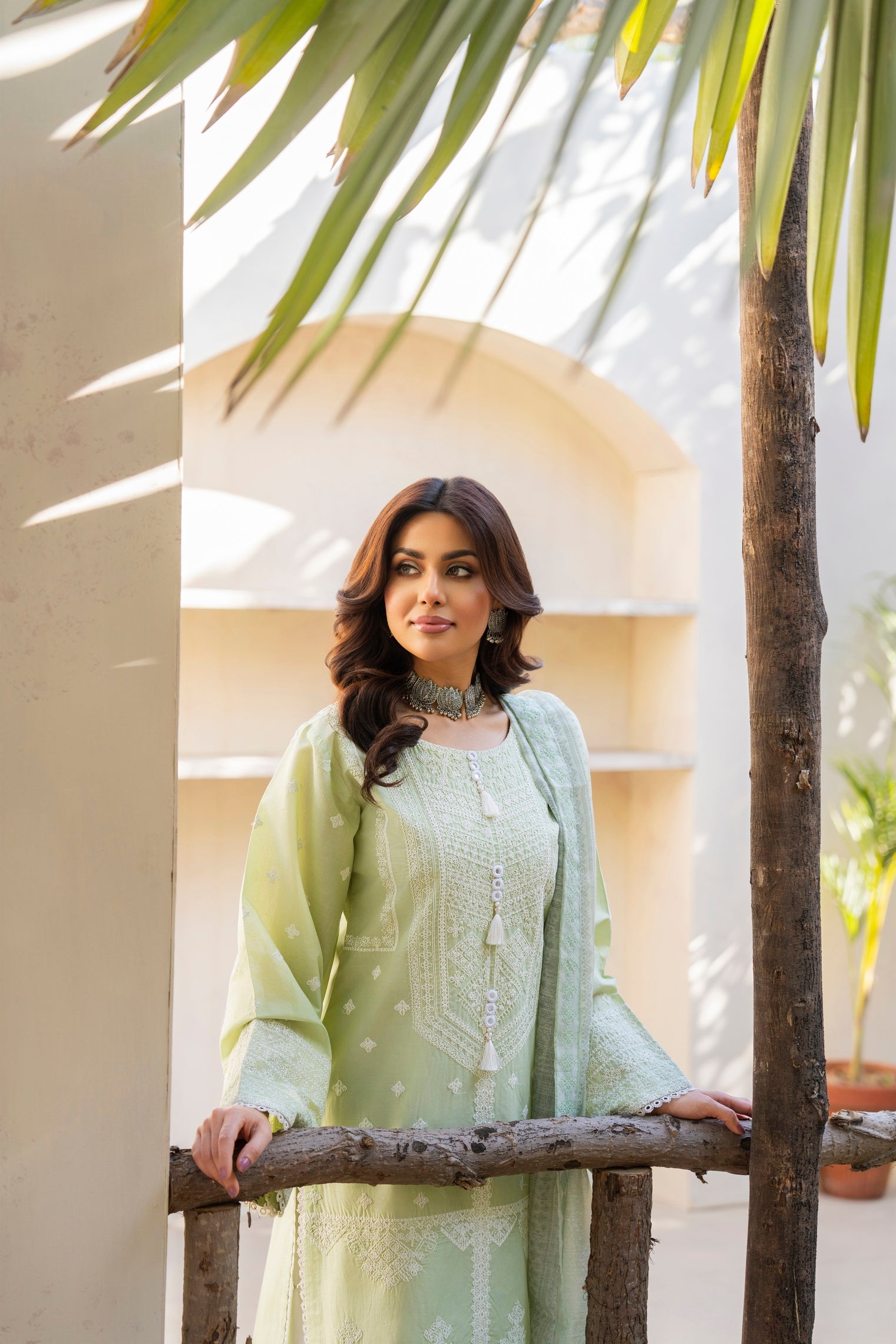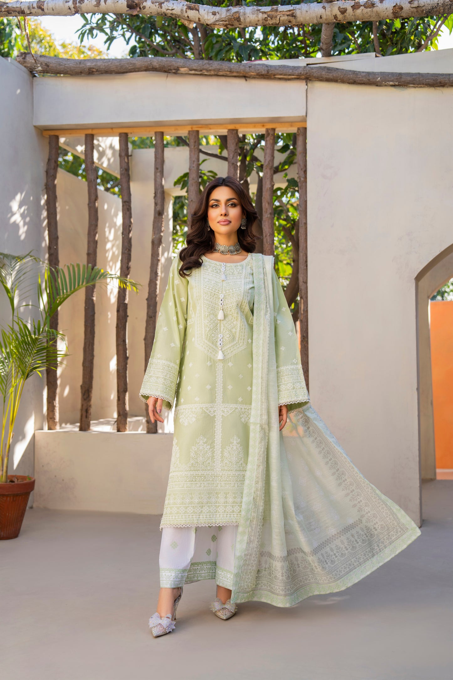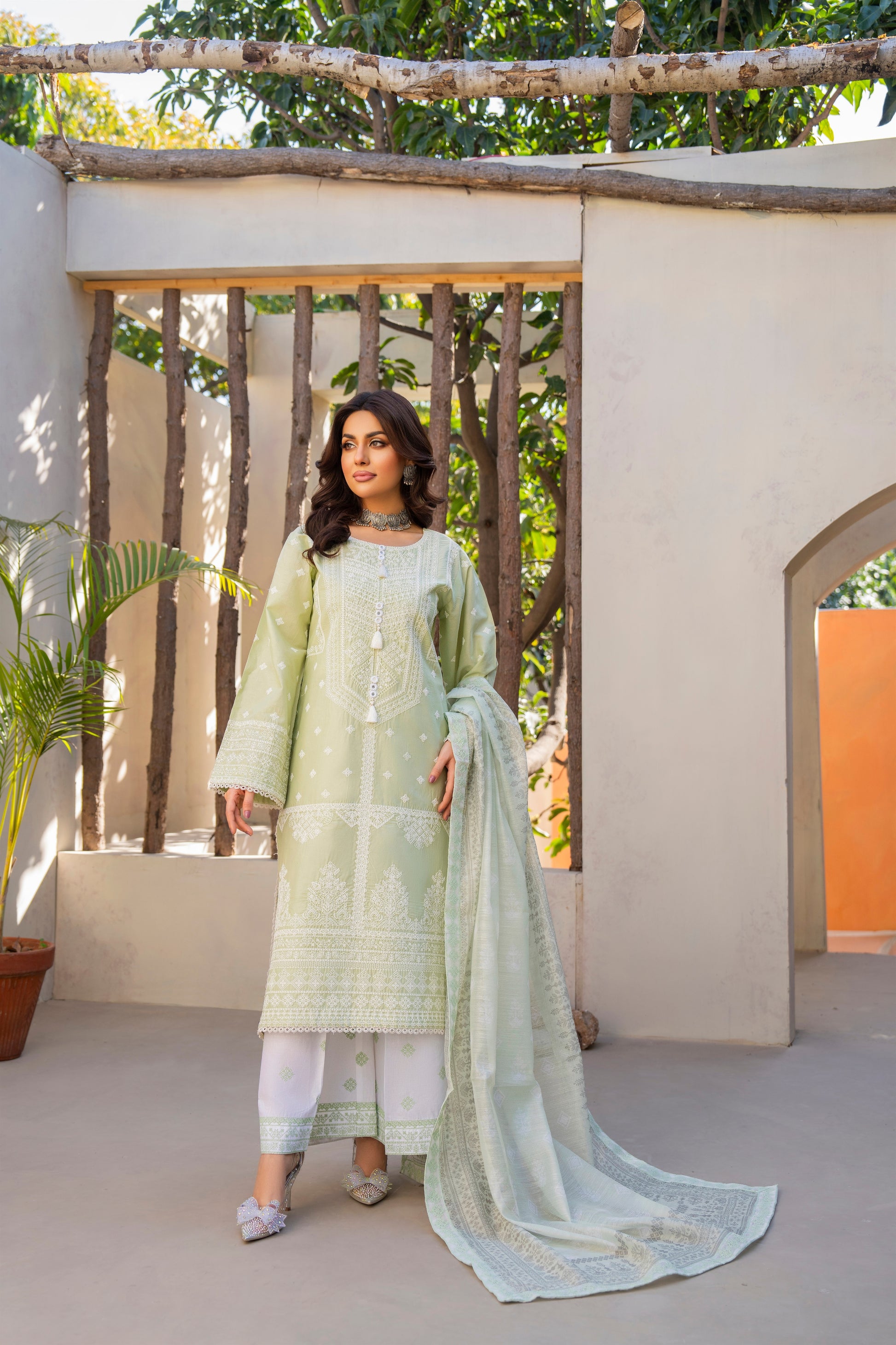 You'll love the effortless elegance of this Jafa Eid Edit by Karma. Designed for grace and comfort, this premium-quality cotton ensemble ensures breathability for all-day wear. The shirt features intricate mate thread work, complemented by delicate shuttle lace on the ghera and chaak for a refined touch. The printed dupatta adds a vibrant charm, while the cotton trousers provide a sleek and comfortable finish. Perfect for festive gatherings, cultural celebrations, and formal occasions, this outfit blends sophistication with timeless tradition.